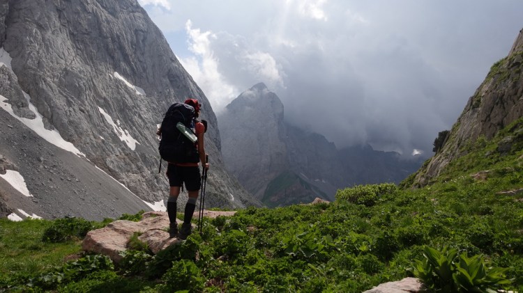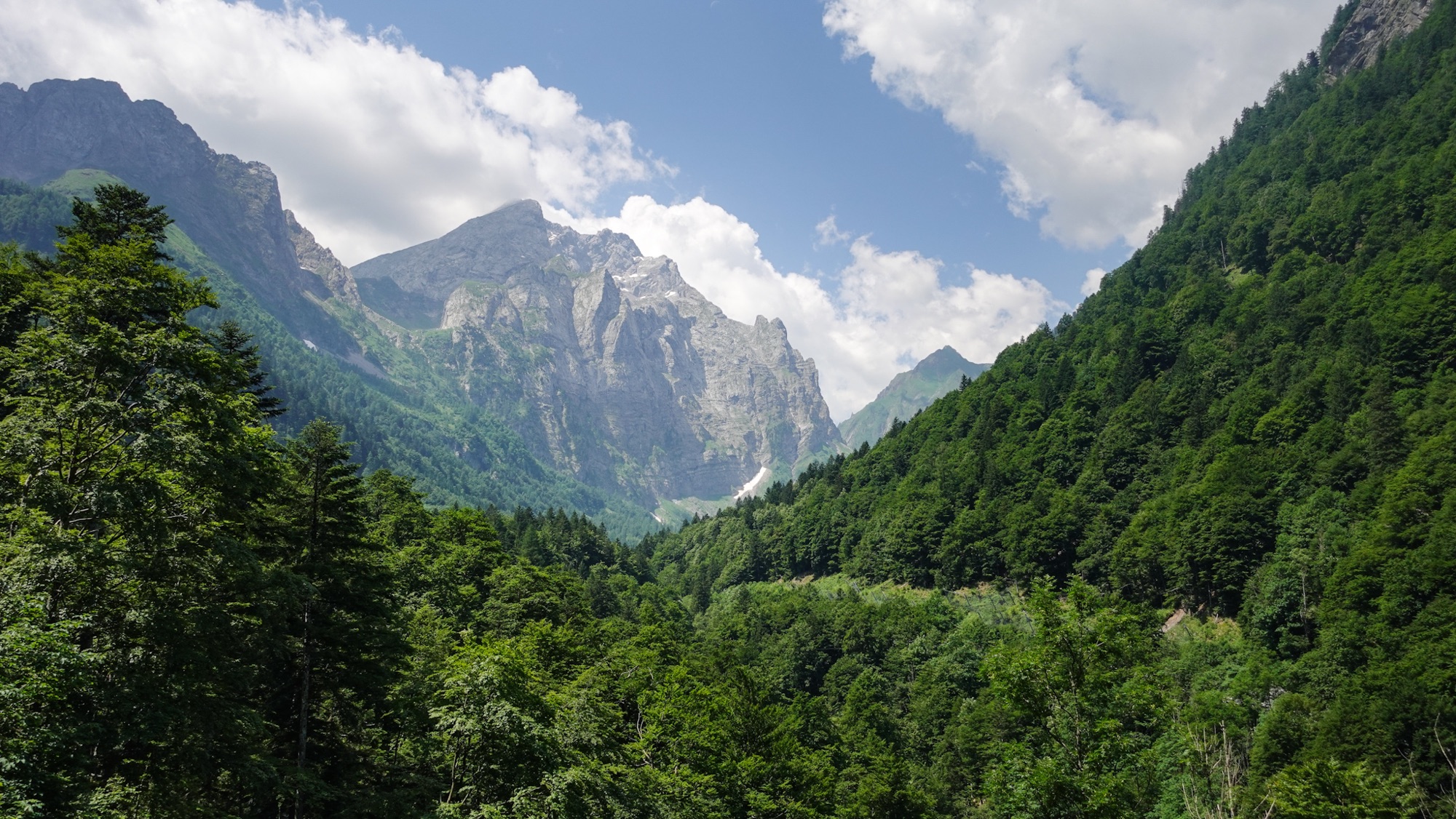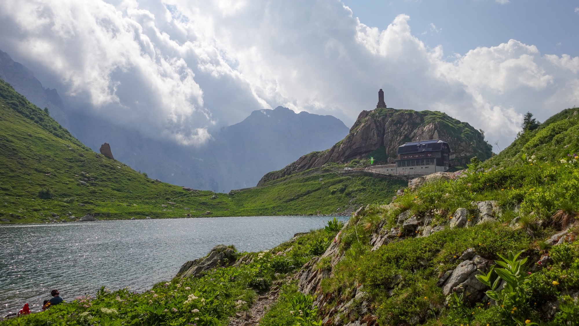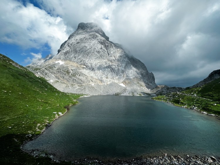 Die Hoffnung verfliegt, als ich am nächsten Morgen die Augen öffne und schlucke. Es bleibt bei einem Ziehen im Hals und so steuere ich nach dem Frühstück nicht nur den Supermarkt, sondern auch die Drogerie an, um mich mit Vitamin C- und Immuntabletten einzudecken. Danach verlasse ich Kötschach-Mauthen in südliche Richtung, um auf den Römerweg zu gelangen. Tatsächlich nutzten die alten Römer diese Straße, um über den Plöckenpass zu gelangen. Der Pass galt als wichtiger Handels-, Wirtschafts- und Verkehrsweg zwischen Nord- und Südalpen. Unspannende Forstwege prägen den ersten Teil des Tages. Doch von der Erkältung angeschlagen bin ich dankbar für den monotonen aber schattigen Marsch durch den Wald. Ich quere die Plöckenpassstraße vorbei an einem weiteren „Heldenfriedhof“ und steige auf zum Valentintörl. Lockere Wolkenfetzen verdecken immer wieder die Sonne und dämpfen die Mittagshitze. Murmeltiere jagen sich über die Wiesen des breiten Tales. Am Valentintörl auf 2.138m lege ich eine Pause ein. Plötzlich reißen die Wolken vor mir auf und ich entdecke unter mir den blauen Wolayersee zwischen den bleichen Bergen liegen. Jetzt ist es nicht mehr weit.
