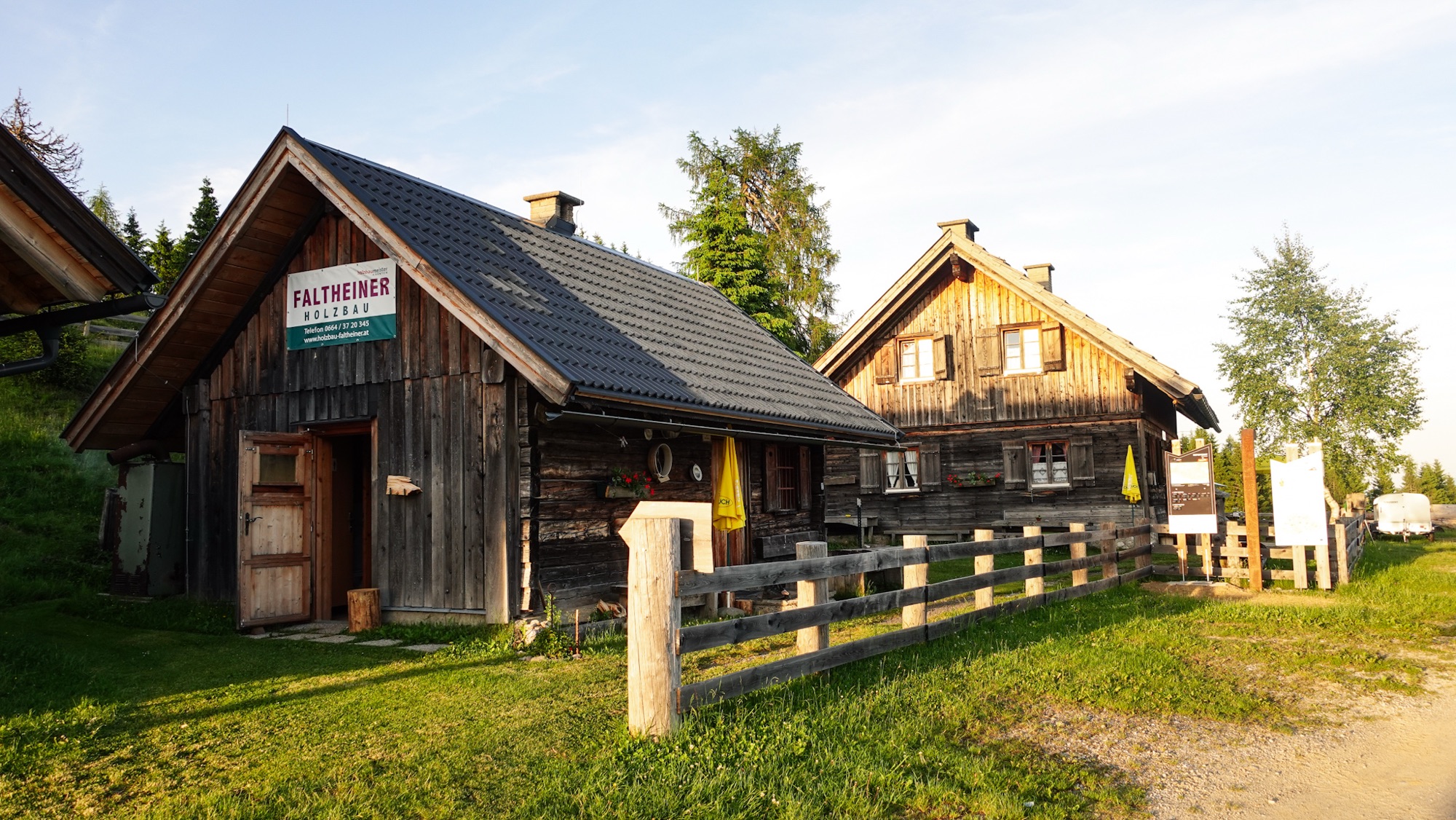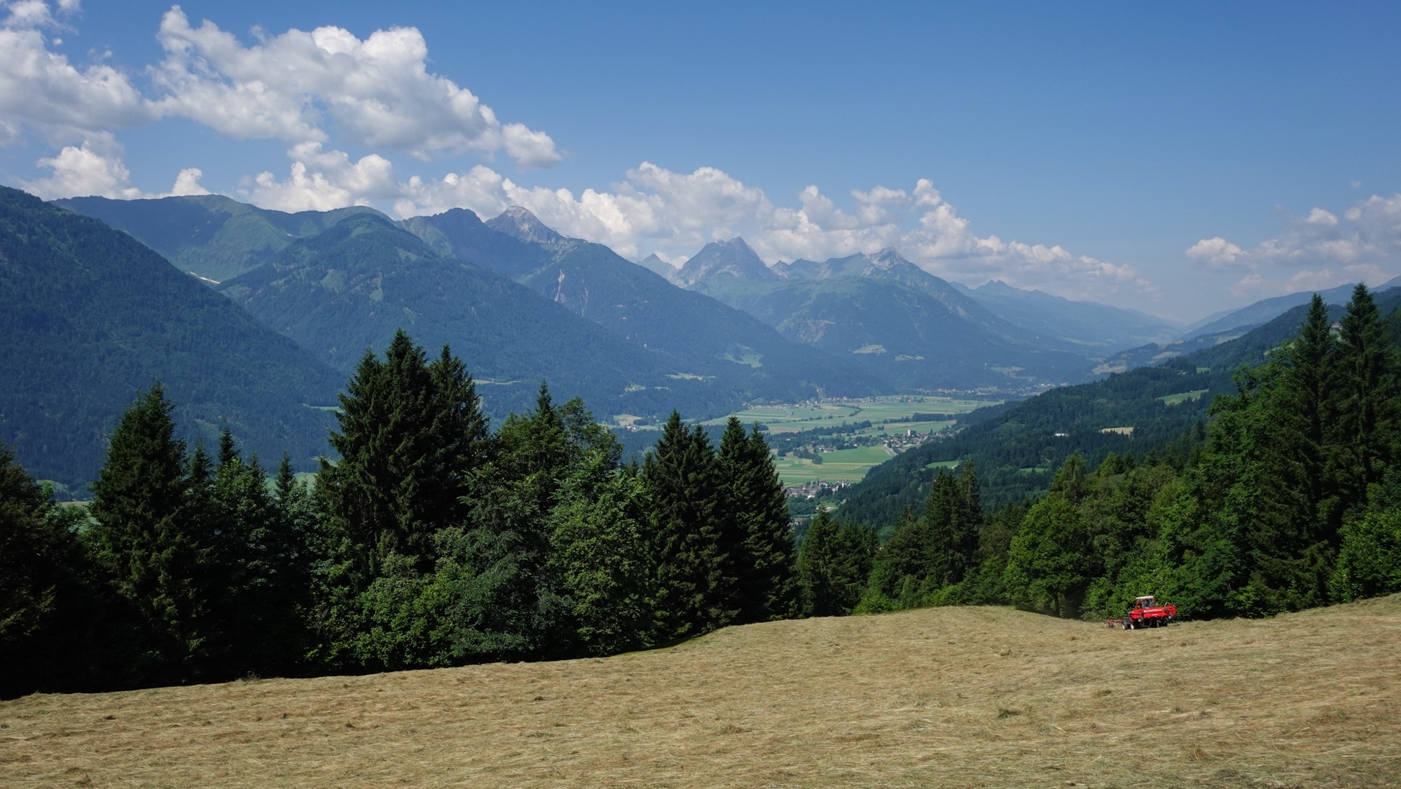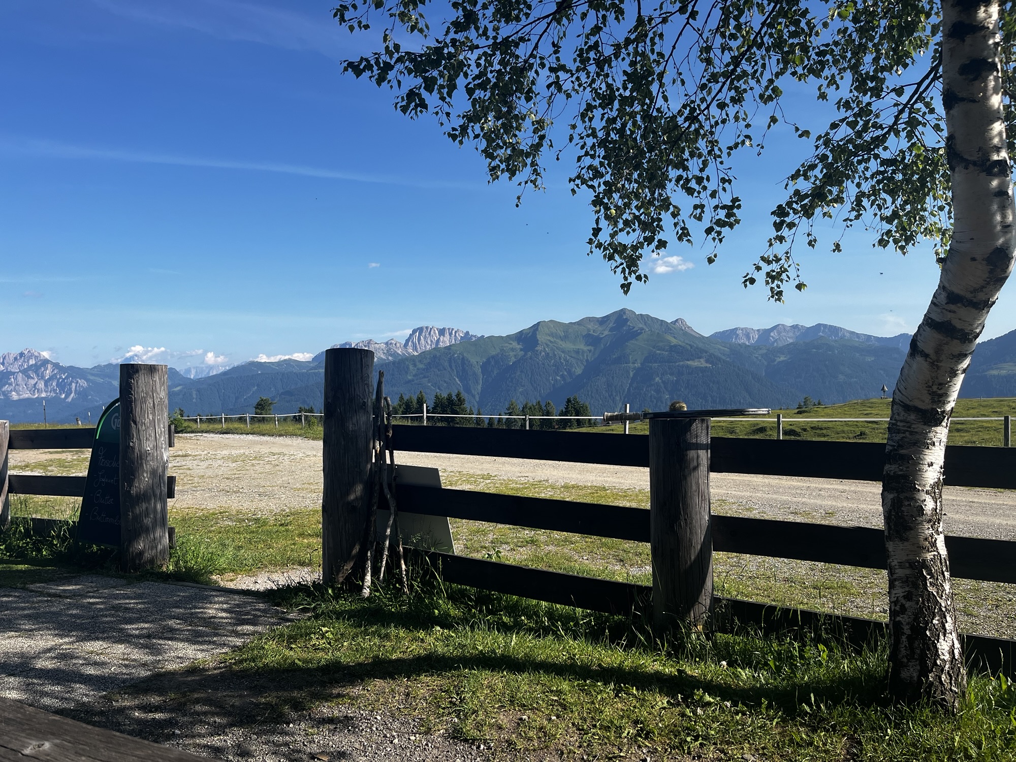 Abgekämpft erreiche ich um 17.15 Uhr die Reisacher Jochalm. Was für ein Ritt. Entspannt ist anders. Eine kleine etwas ältere Frau nimmt mich mit einem warmen Lächeln in Empfang. Ihr Name ist Monika. Ewald, ihr Sohn, ist der Senner der Reisacher Jochalm – ein junger Mann, etwa in meinem Alter. In diesem Jahr bewirtschaften sie zum ersten Mal die Alm. Und so bin ich für Monika und Ewald nicht nur der erste Übernachtungsgast überhaupt. Ich lasse mich auf der Bank vor der Almhütte nieder. Unter mir liegt das Gailtal.