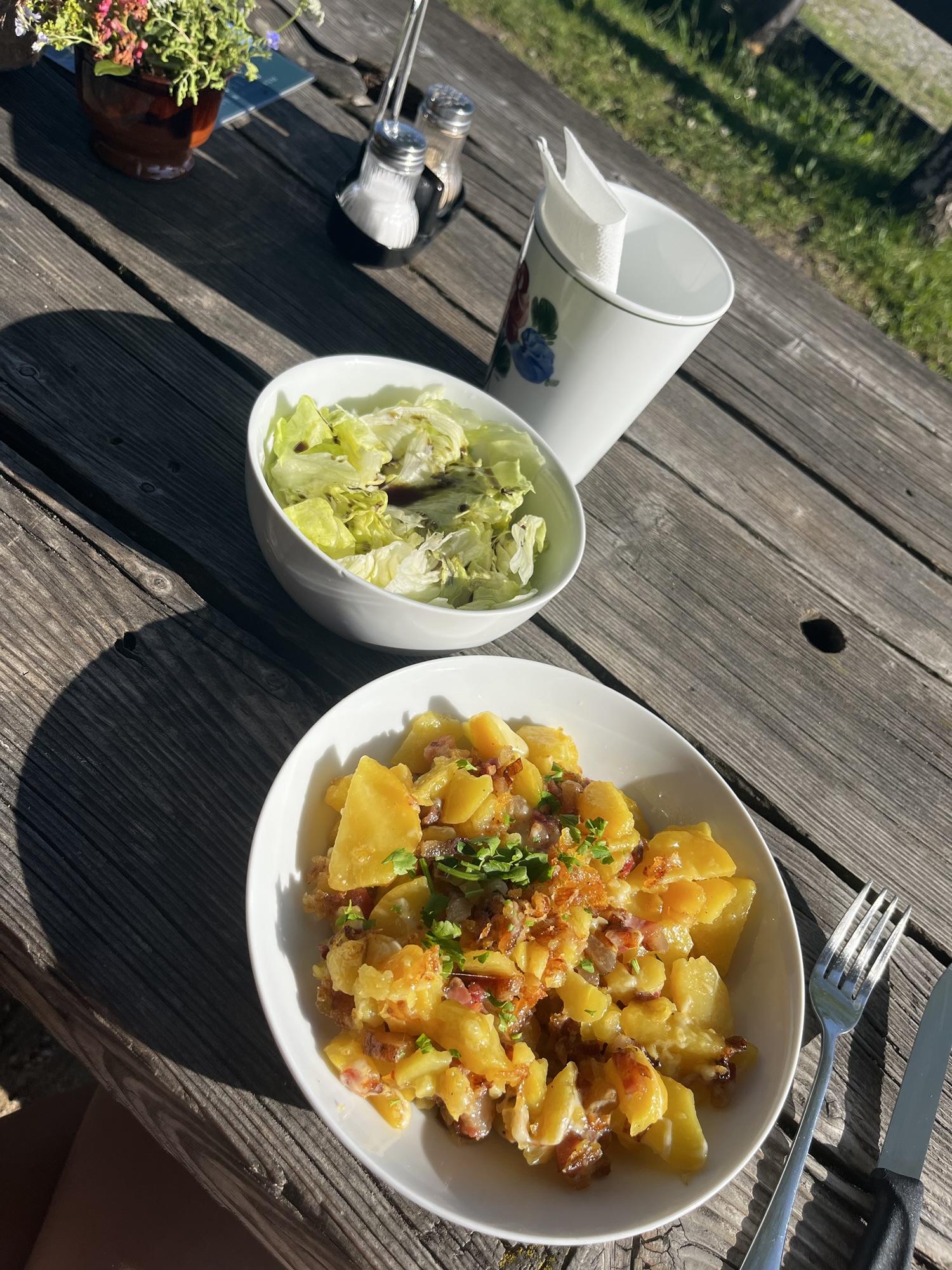 Trotz schlechter Schwingungen, durchströmt mich ein klein wenig Erleichterung, denn ich gehöre nicht zu der Truppe. Ich muss die schlechte Laune nach einer harten Etappe nicht ausbalancieren. Ich muss nicht besänftigen. Ich muss mich nicht verantwortlich fühlen. Nein, all das muss ich diesmal nicht. Ich kann einfach den Tisch wechseln, stelle ich erstaunt fest. Und das tue ich. Am Nachbartisch ist die Stimmung heiter. Zwei junge Frauen und ein Pärchen in meinem Alter sitzen dort. Aber auch ein einzelner Wanderer. Es geht um Berggtouren auf den Kilimandscharo, die morgige Etappe zum Hochweißsteinhaus und Schnarcher im Lager.