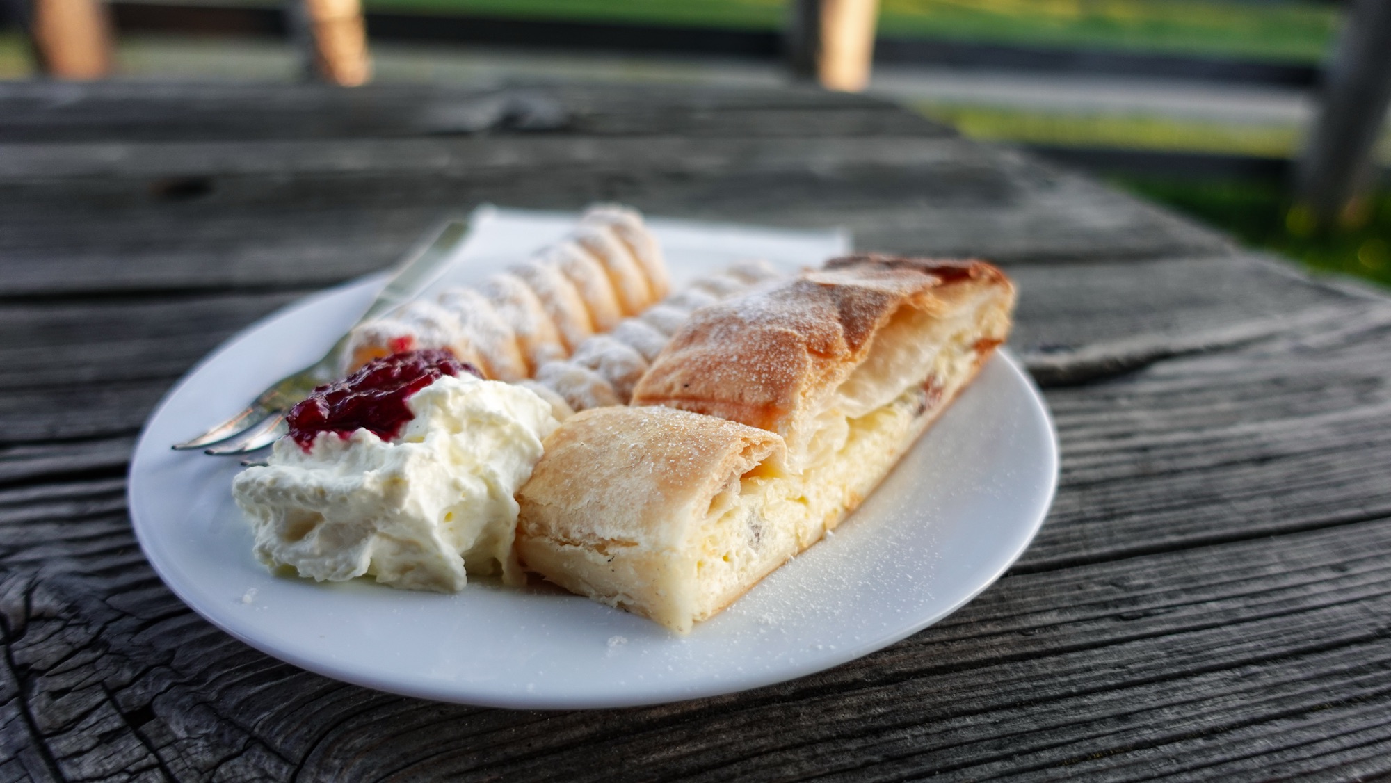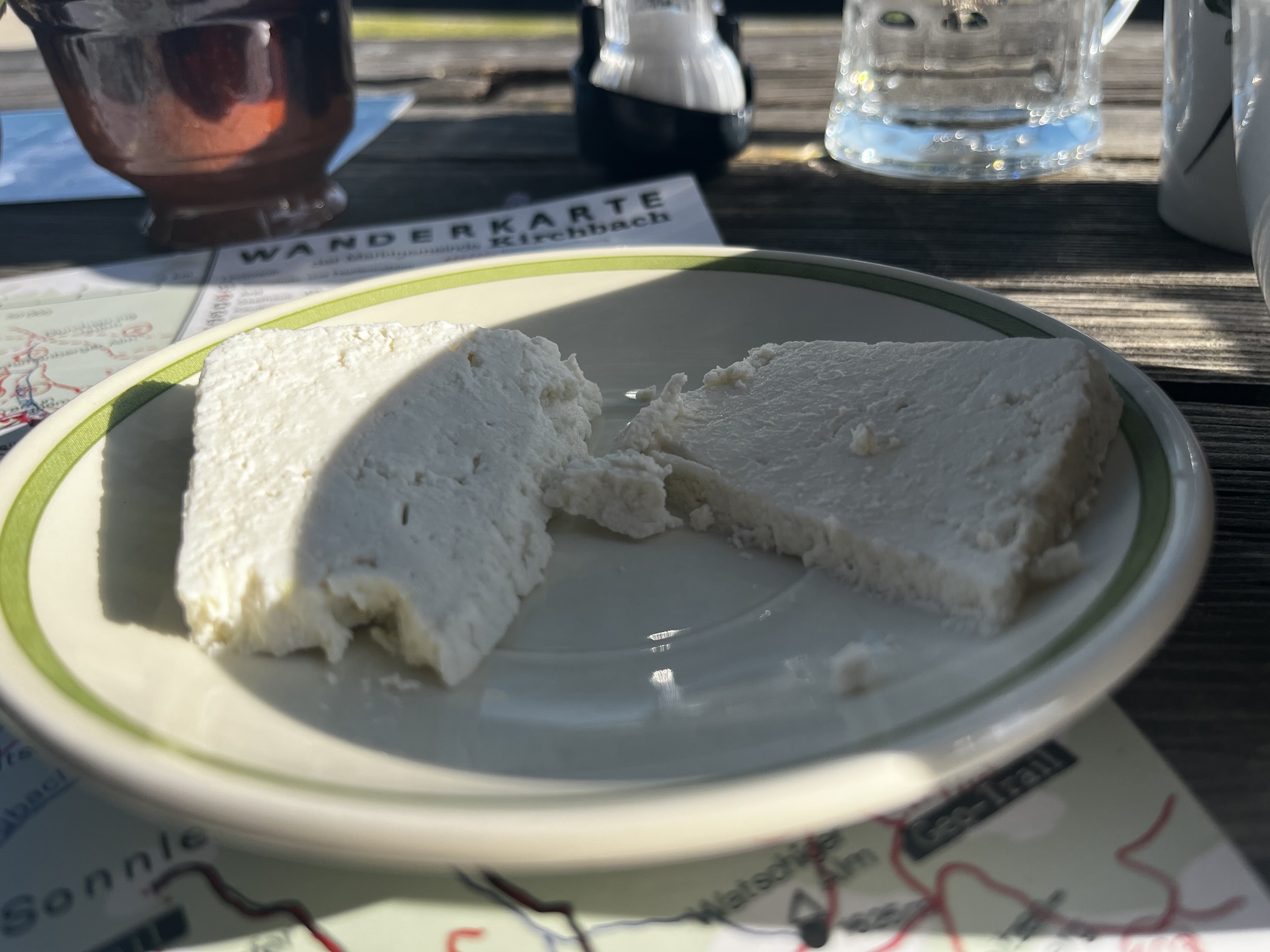 „Hast du schon einmal Schotten gegessen?“ fragt Monika und stellt einen kleinen Teller mit zwei Scheiben Käse vor mir auf den Tisch. Im ersten Moment könnte man meinen, es handle sich um Feta. Doch Schotten ist ein traditioneller, krümeliger Frischkäse. Er entsteht durch das Erhitzen und Säuern von Molke oder Buttermilch. Das Eiweiß flockt aus. Der Käse wird anschließend in Tücher oder Leinensäckchen gefüllt, um abzutropfen. Somit ist er eigentlich nur ein Nebenprodukt der Käse- oder Butterherstellung – allerdings ein sehr leckeres Nebenprodukt, wie ich feststellen darf. „Am besten schmeckt Schotten, wenn er ganz frisch ist,“ ergänzt Monika, als ich mir eine weitere Gabel mit dem Käse in den Mund schiebe.