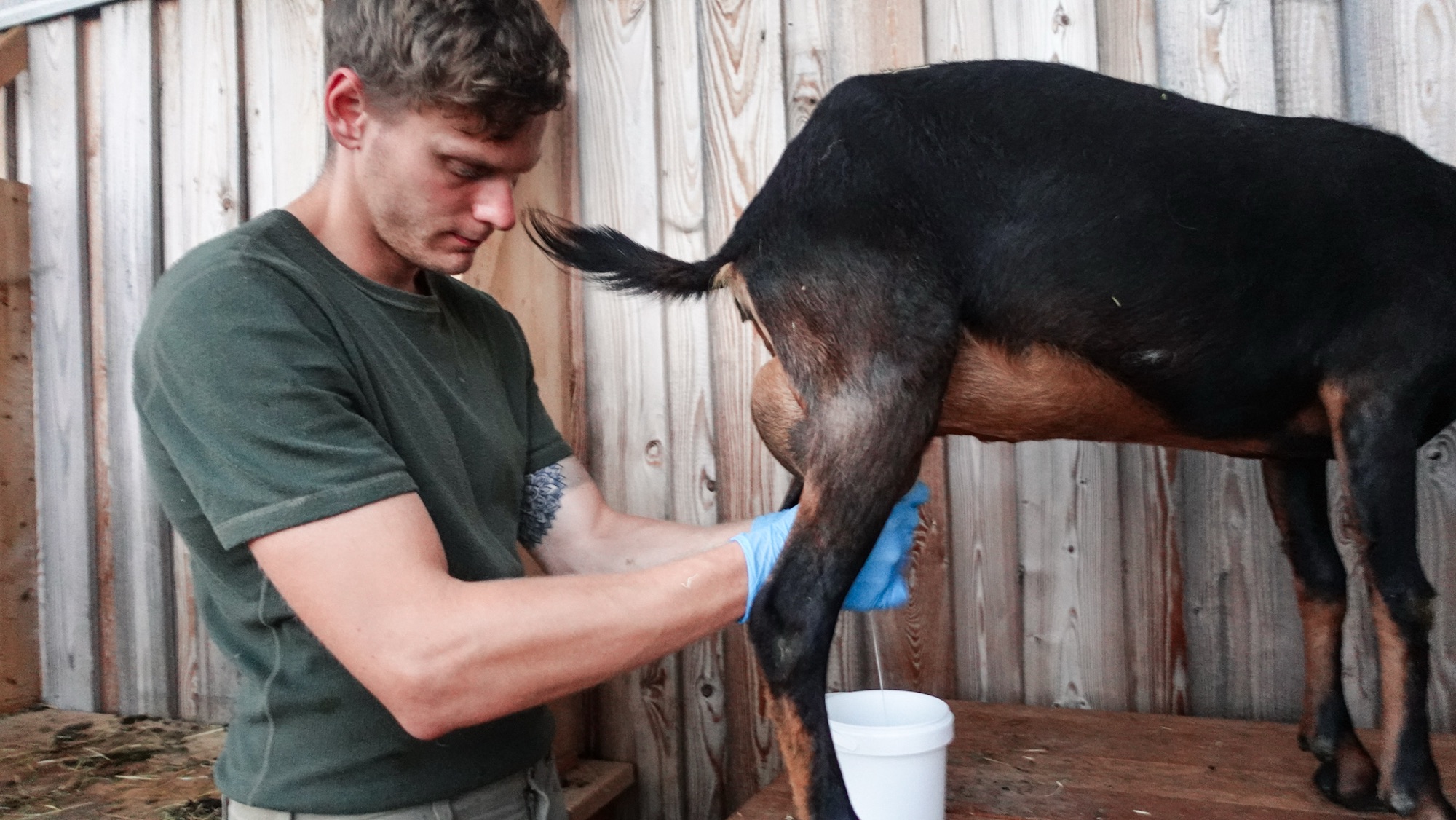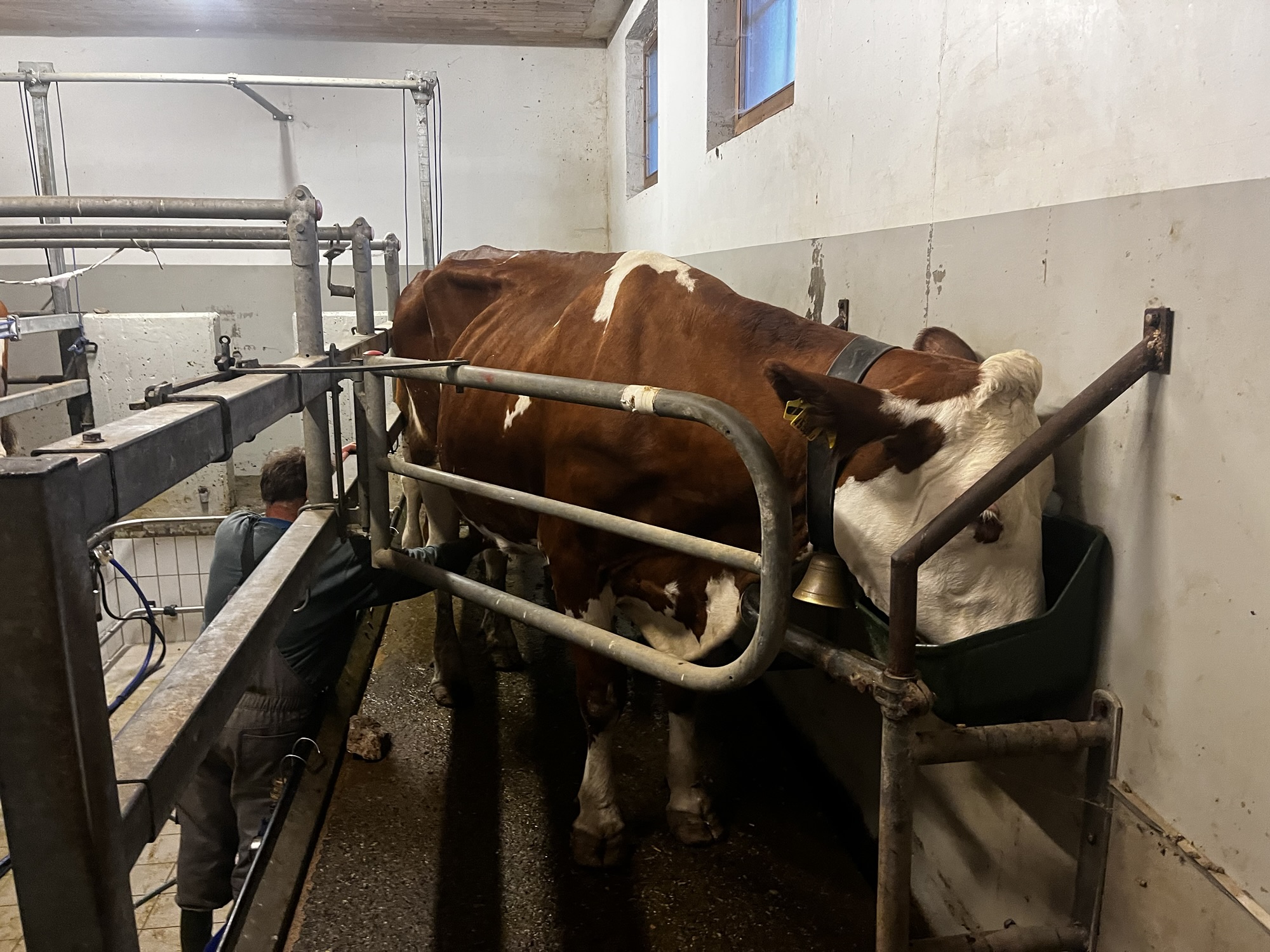 4.30 Uhr klingelt mein Handywecker. Schlapp pelle ich mich aus den Federn. Der Hals kratzt. Mein rechter Fuß wummert wie eh und je. Ich schiebe die unangenehmen Gefühle weg und hüpfe in meine Wanderklamotten. Vor der Tür liegt die Morgendämmerung über den Bergen. Schwach sendet der Mond einen letzten Gruß. Wenige Augenblicke später stehe ich im Stall und beobachte, wie Ewald und sein Mitarbeiter Günther die Kühe in die Milchanlage treiben. Die 31 Tiere werden freilich maschinell gemolken. „So jetzt ist die Ziege dran. Magst du mitkommen? Dann kannst du auch gleich selbst mal probieren,“ meint Ewald zu mir gewandt. „Na klar,“ gebe ich zurück und wir wechseln nach draußen. Die einzige milchgebende Ziege kennt das Prozedere bereits. Bereitwillig springt sie auf ihr kleines Podest. Mit festen zügigen Handbewegungen beginnt Ewald anzumelken. Dann übergibt er an mich. Meine Finger umfassen die Zitzen der Ziege. Warm und weich liegen sie in meinen Händen. Nur zaghaft traue ich mich zuzudrücken, aus Angst dem Tier wehzutun und so kommt nur aus einer Zitze etwas Milch. Nach wenigen Augenblicken übernimmt Ewald wieder. „Es ist wichtig, sie zügig auszumelken. Sie behält sonst zu viel Milch zurück,“ erklärt er. Fasziniert schaue ich zu, wie Ewald mit scheinbar kinderleichten Handbewegungen das Euter leert. „Drei Liter gibt sie pro Tag. Eine richtige Hochleistungsziege schafft vielleicht sieben Liter.“