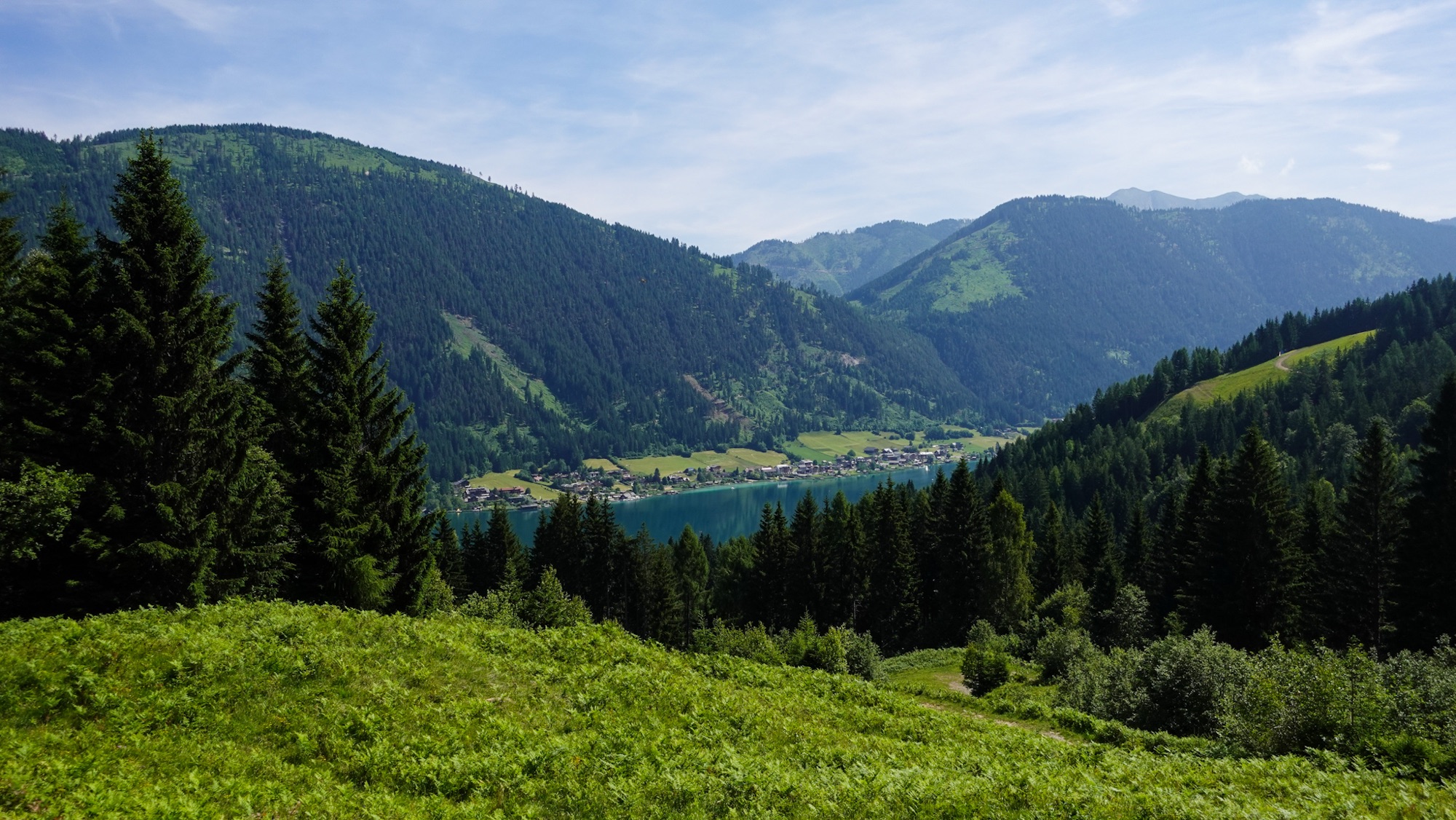 Schließlich trabe ich viel zu spät los. Richtung Süden verlasse ich Techendorf und entferne mich von den Ufern des Weißensees. Bald schon liegt er wie ein blaues Auge im Tal. In mir weicht die Entspannung derweil der Anspannung. Schließlich halte ich die Ungewissheit um meinen heutigen Schlafplatz nicht mehr aus und google die Nummer der Reisacher Jochalm. Wenn es stimmt, was Andy, der Hüttenwirt der Goldeckhütte, gesagt hat, dann gibt es auf der Alm einige Schlafplätze. Es klingelt – einmal, zweimal, dreimal – „Reisacher Jochalm. Ewald hier, Hallo.“ Ich atme auf. „Hallo, hier ist Julia. Ich bin unterwegs auf einer Fernwanderung und wollte nachfragen, ob ihr für heute Abend ein Bett frei habt?“ – „Wie viele Leute seid ihr denn?“ – „Nur ich. Eine Person,“ gebe ich knapp zurück und halte wiederum die Luft an. Stille am anderen Ende. Es wäre nicht das erste Mal, dass ich keinen Schlafplatz bekomme, weil ich eben nur allein unterwegs bin. „Da muss ich kurz Rücksprache halten, ob wir das hinbekommen. Ich rufe gleich zurück.“ Wieder Stille. Ich lege auf und spüre, wie das flaue Gefühl in meinem Magen wächst. Ich betäube die innere Unruhe mit meiner Wien-Nizza-Playlist, während der Weg mich steil bergauf durch den Wald führt.