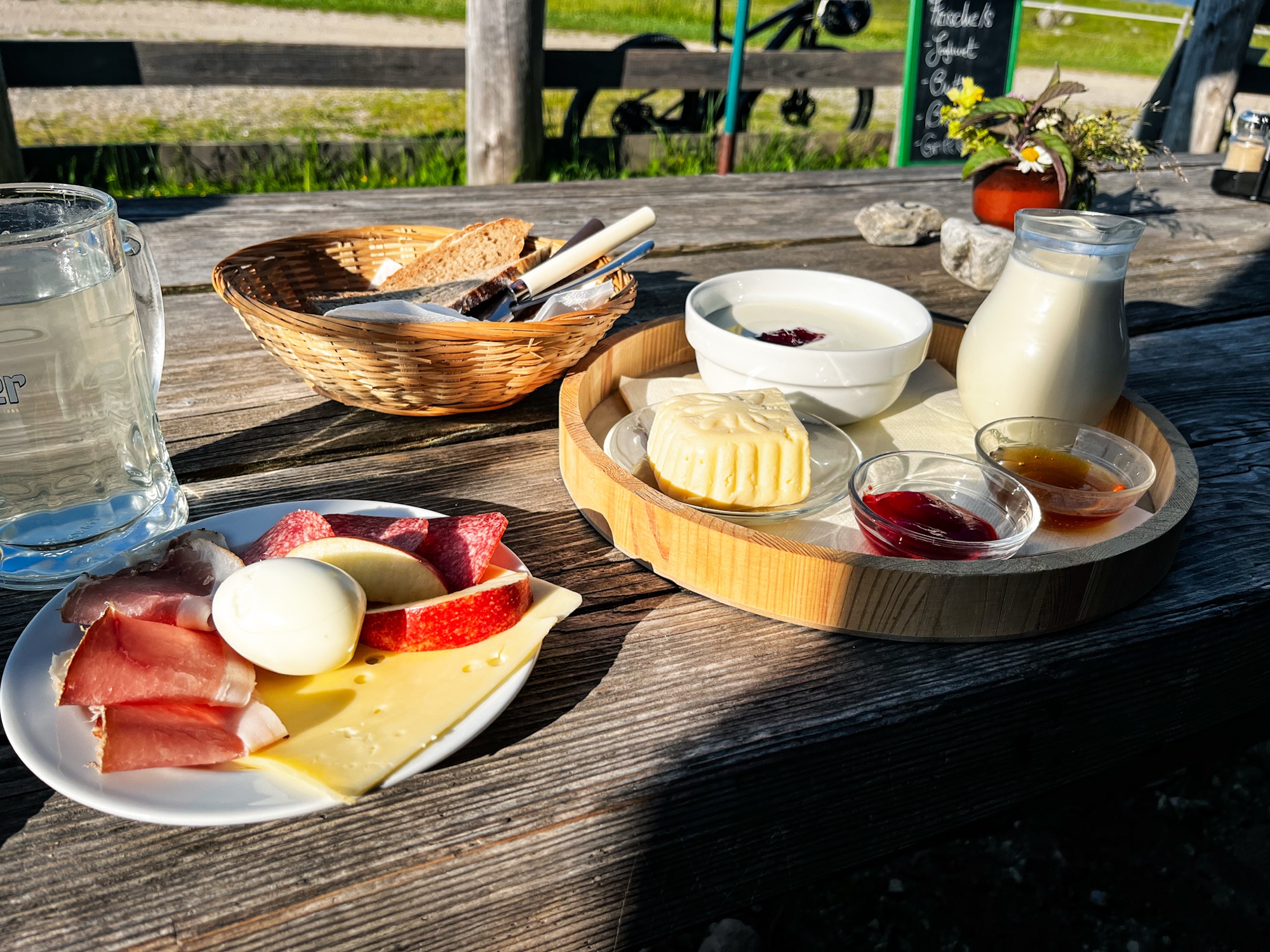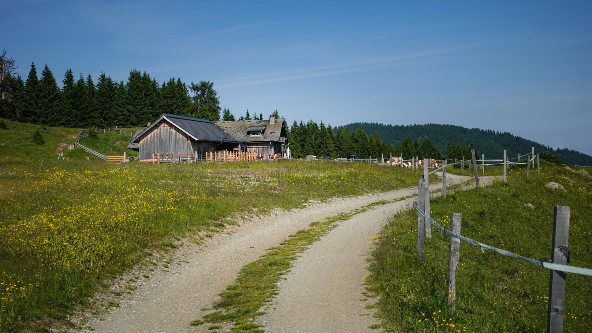Mittlerweile haben auch die Kühe ihre Melkstation verlassen und auf mich wartet ein herrliches Frühstück. Butter, Milch, Joghurt, Käse – alles frisch aus der Almsennerei von jenen Kühen, die jetzt vor mir auf der Weide stehen. So könnte jeder Morgen beginnen, denke ich. Mit einem großen Buch kommt Monika zu mir an den Tisch. „Das ist unser Gästebuch. Ich möchte, dass du dich als unser erster Gast einträgst,“ sagt sie mit einem warmen Lächeln. Was für eine Ehre, denke ich, schlage die erste Seite in dem dicken und gleichsam leeren Buch auf und beginne zu schreiben. Danach packe ich wie immer all mein Hab und Gut zusammen, verabschiede mich von Monika und Ewald. Noch ein paar Mal drehe ich mich um. Die Kühe werden immer kleiner und schließlich verschwindet auch die Alm hinter einem Hügel.