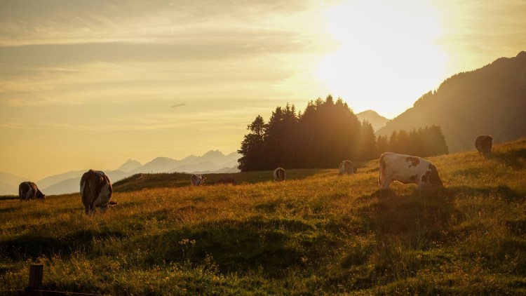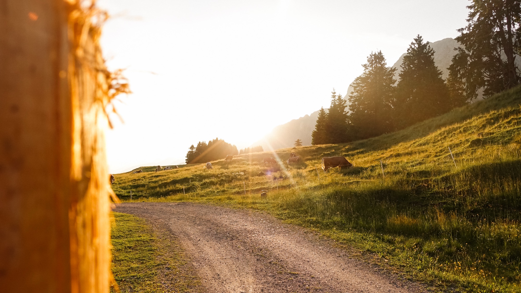 Langsam senkt sich die Sonne über den Gipfeln und taucht die Wiesen in ein spektakuläres Gold. Ruhig grasen die Kühe inmitten der Kulisse. Ich atme tief den Duft des beginnenden Sommers und schließe für einen Moment die Augen. Was bleibt ist das Läuten der Kuhglocken, das leise Surren der Grillen und die letzten warmen Sonnenstrahlen des Tages auf meiner Haut. Zufrieden sitze ich auf der Bank. Ewald kommt geradewegs aus der Käserei gelaufen und setzt sich zu mir an den Tisch. „Bist du fertig für heute?“ will ich wissen. „Nein, nicht ganz. Zur Butterherstellung ist es zu warm. I denk, des werd I 2.00 Uhr nachts machen,“ antwortet Ewald lässig. Doch meine Augen weiten sich. Bitte was?! 2.00 Uhr nachts Butter herstellen?! „Oha!“ bringe ich heraus. „Ja, mal schauen. Vielleicht bleib I danach gleich wach. 4.30 Uhr beginnen wir, die Kühe zu melken,“ ergänzt er. Das interessiert mich jetzt doch. „Sag mal, hättest du was dagegen, wenn ich morgen früh zuschaue beim Melken?“ Verwundert schaut mich Ewald an. „Wenn du so früh aufstehen magst.“ – „Möchte ich,“ gebe ich entschieden zurück, auch wenn jede Faser meines Körpers nach Schlaf und Erholung schreit. Ich habe mir vorgenommen, keinen Moment und keine Gelegenheit auf dieser Reise zu verpassen. Ewald gehört zu jener Art Menschen, mit denen man gut schweigen kann, ohne dass es unangenehm wird. Ich genieße die Ruhe seiner Gesellschaft. Hin und wieder schleudert er für seine Hündin ein Spielzeug über den Hof, das sie zuverlässig noch in der Luft schnappt und ihm wenig später vor die Füße legt. Als die Sonne am Horizont verschwindet, zieht eine frische Brise über die Alm. Zeit, sich ins warme Bett zu verabschieden.