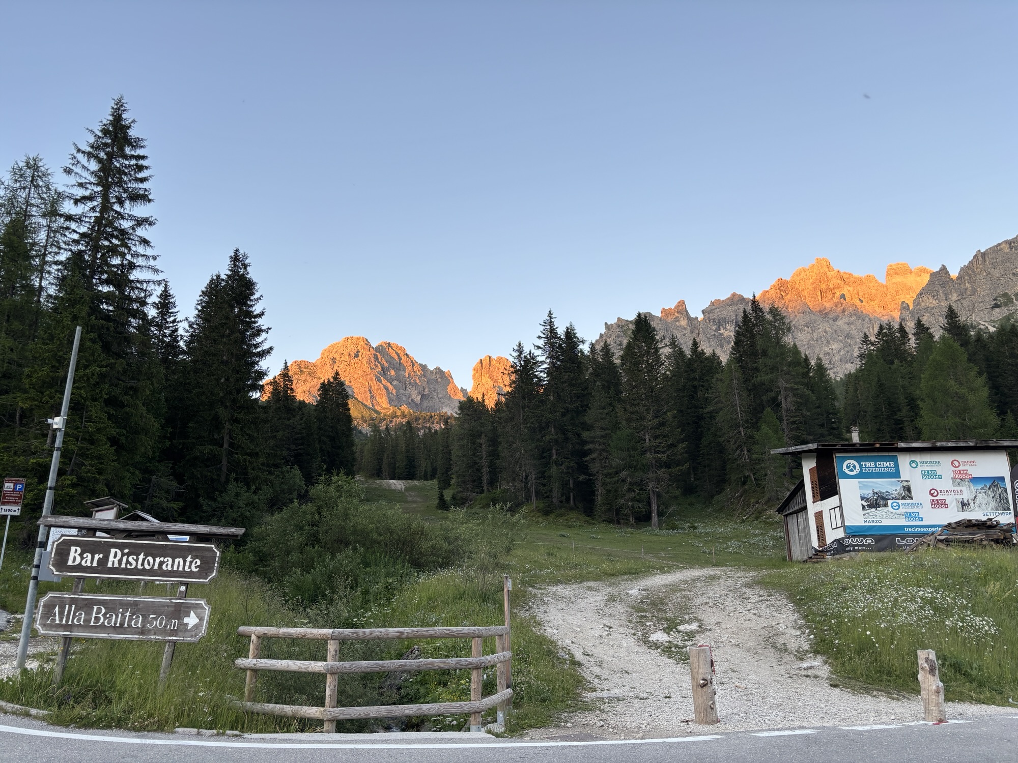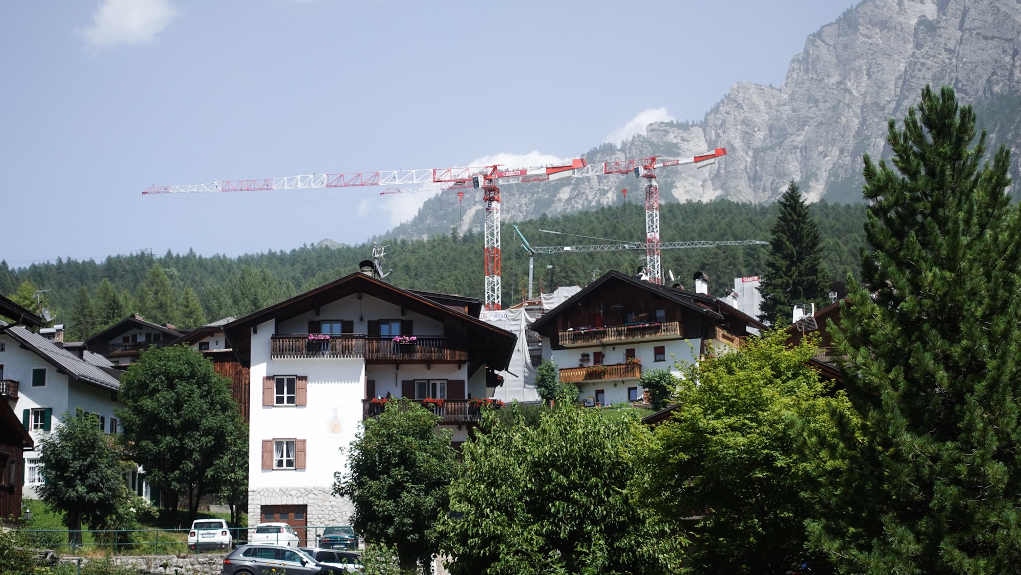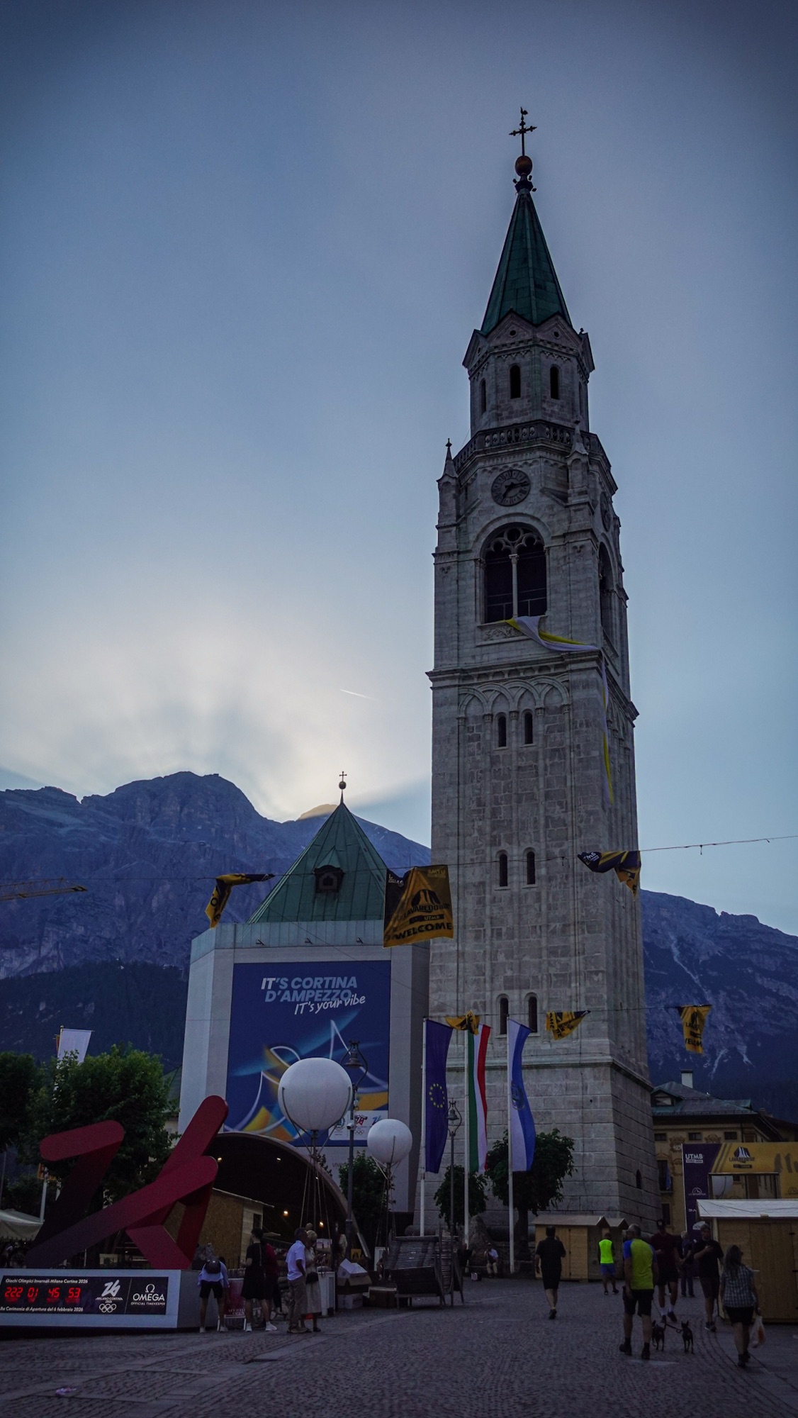 Mit „Floating through Space“ in den Ohren schlendere ich leichtfüßig entlang der Baumgrenze oberhalb von Cortina. Als ich das Städtchen erreiche, hämmert, bohrt und baggert es an jeder Ecke. Die Olympischen Winterspiele werfen ihre Schatten voraus. Hotels wachsen in die Höhe, Tiefgaragen werden freigelegt, Parkplätze asphaltiert. Über 20 Baukräne kann ich über den Dächern der Stadt zählen. Der Krach überfordert mich ein wenig. Schnellen Schrittes erreiche ich den Campingplatz. Basti ist gerade von seiner Radtour zurück. Gemeinsam leeren wir einen riesigen Topf Nudeln mit Tomatensoße. Seitdem ich wandere, können die Portionen nicht groß genug sein. Im sanften Abendlicht spazieren wir hinauf in die Stadt. Vor der Campanile im Zentrum zählt eine Uhr die Tage, Stunden, Minuten und Sekunden bis Olympia herunter. Die schicken Auslagen in den Schaufenstern tragen nur vereinzelt Preisschilder. Aber das ist auch nicht nötig. Pelzmantel, Designer-Skibrille und Schweizer Uhr sind für den schmalen Taler nicht zu haben. Cortina ist ein teures Pflaster und so begnügen wir uns mit einem Eisbecher. Für die zentrale Lage direkt am Markt ist dieser wiederum ausgesprochen preisgünstig. Währenddessen versinkt die Sonne hinter der Tofana die Mezzo. Dramatisch umrahmt das Licht den Gipfel beinah wie ein Heiligenschein. Kitschiger hätte man es sich nicht ausmalen können. Es ist ein schöner vorerst letzter gemeinsamer Abend. Morgen werde ich für die nächsten drei Wochen allein weiterziehen.
