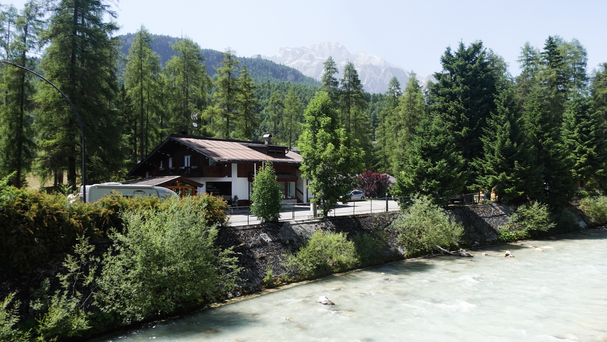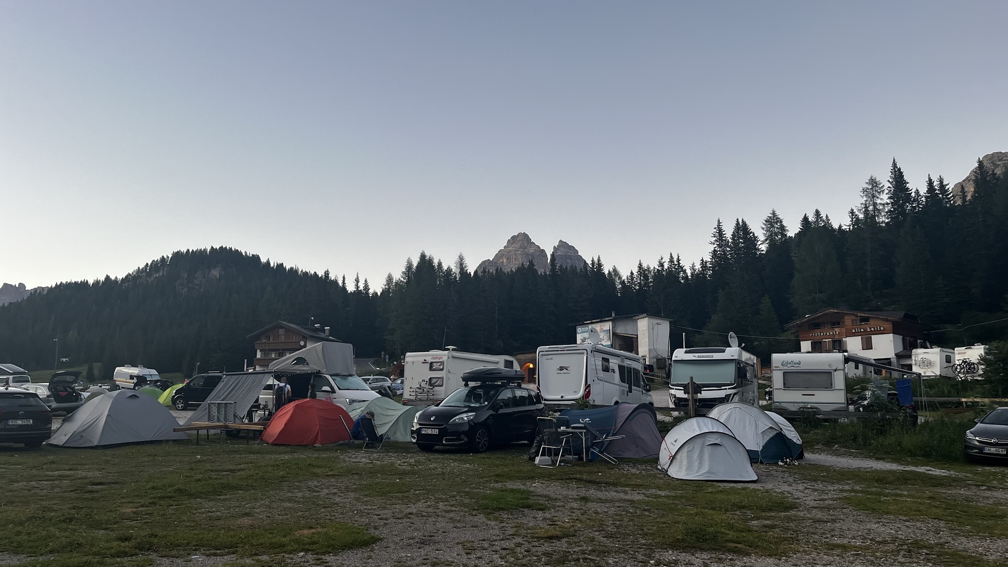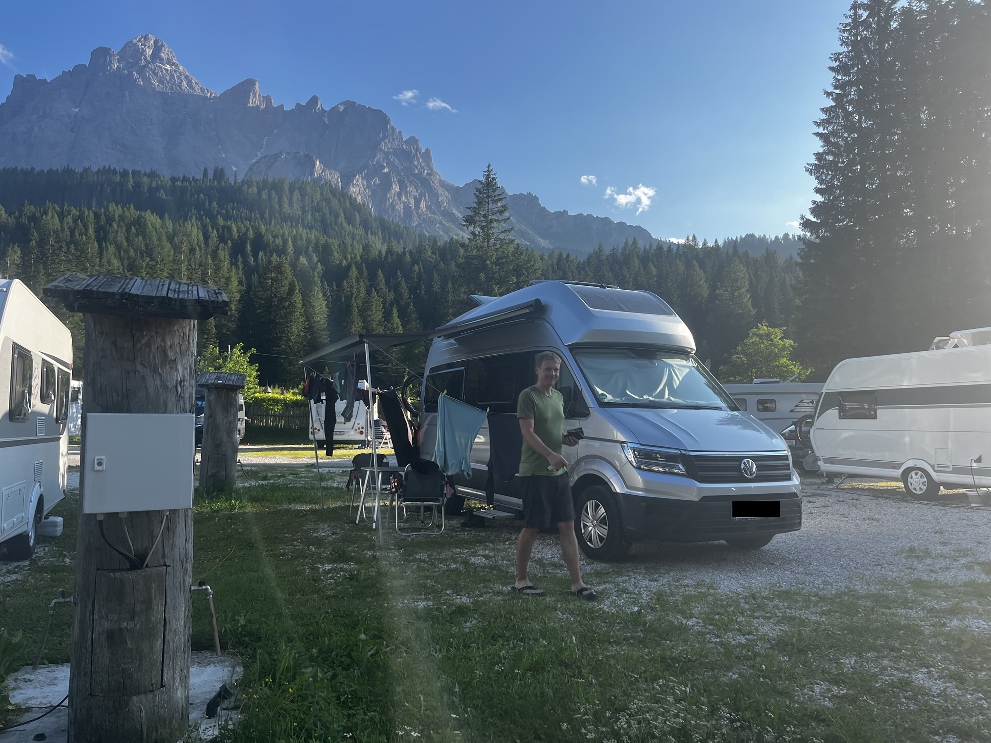 Trotz bescheidener Ausstattung und ordentlichen Preisen, ist dieser prall gefüllt. Auch auf dem angrenzenden Parkplatz stehen Wohnmobile dicht an dicht. Am Abend genießen wir das Alpenglühen auf der Südseite der Drei Zinnen bei einem Glas Lillet Wild Berry in der Bar. Als wir wieder zu unserem Van schlendern, fällt mir an der Einfahrt ein Auto mit Zwickauer Kennzeichen ins Auge. An den Dacia ist ein oranger Anhänger montiert. In den kleinen Fenstern des Autos sind Leinen gespannt, darüber hängen allerhand Kleidungsstücke. Ich wundere mich noch über das eigenwillige Gespann aus unserer Heimat. Am nächsten Morgen dann machen wir schließlich noch Bekanntschaft mit seinem Besitzer. Ein kleiner, untersetzter älterer Herr kaut Sebastian ein Ohr ab, als ich vom Abwasch zurück an den Van komme. Auch ihm ist das heimatliche „ERZ“-Kennzeichen unseres Leihfahrzeugs aufgefallen. „Ja, früher konnte man mit dem Wohnmobil noch nach Venedig hineinfahren, Neapel, Rom. Hab ich alles gesehen. Heute darf man nirgendwo mehr rein. Aber ich habe mir alles umgebaut,“ meint er in breitem Sächsisch und deutet auf den orangen Kippanhänger. Zwei Biotoiletten habe er darin und sogar eine Dusche. Ich reibe mir die Augen und kann es gar nicht so richtig glauben. Noch eine Weile sinniert er über die viel zu teuren Leihgebühren für Vans, wie unseren, beschwert sich, wie er vor Jahren von einem Händler über’s Ohr gehauen wurde. Das Gemeckere zieht meine Stimmung nach unten. Das ist wieder typisch, denke ist und atme innerlich auf, als der Camper sich endlich wieder seinem Kippanhänger zuwendet.