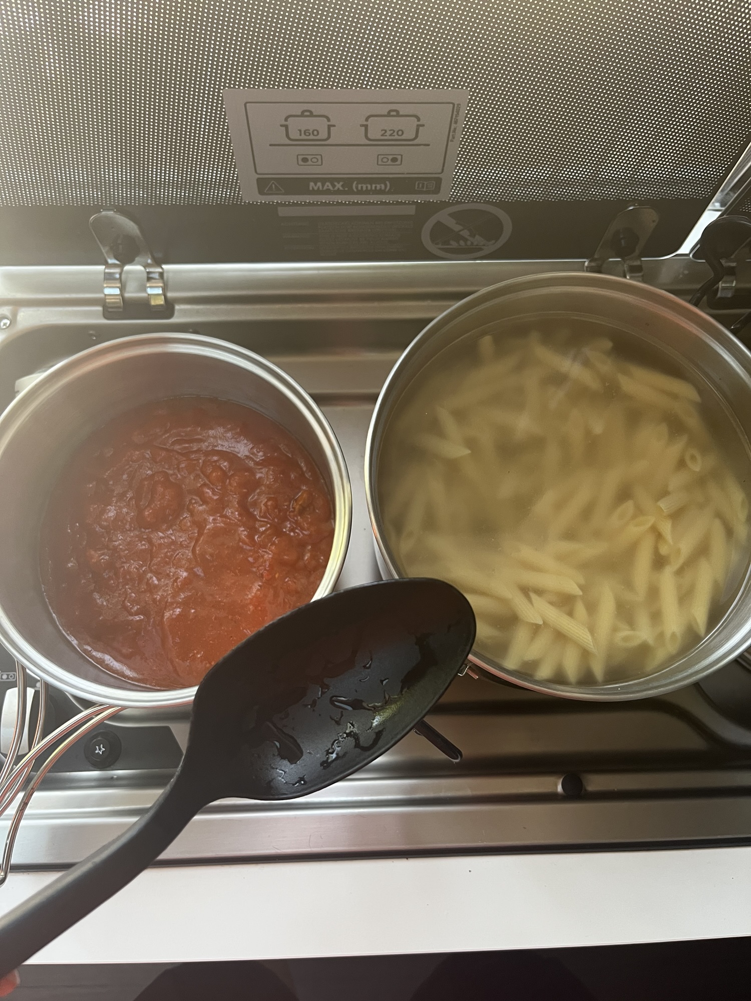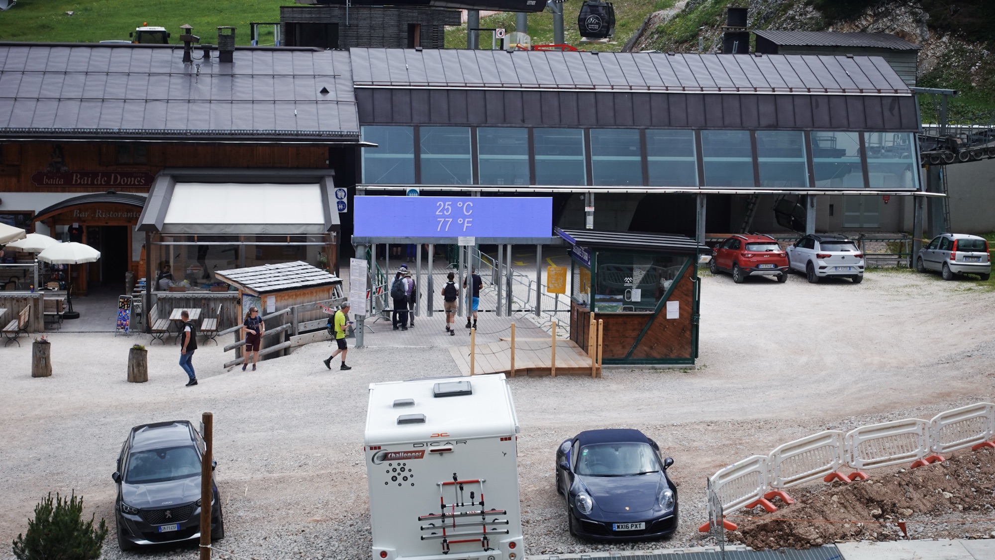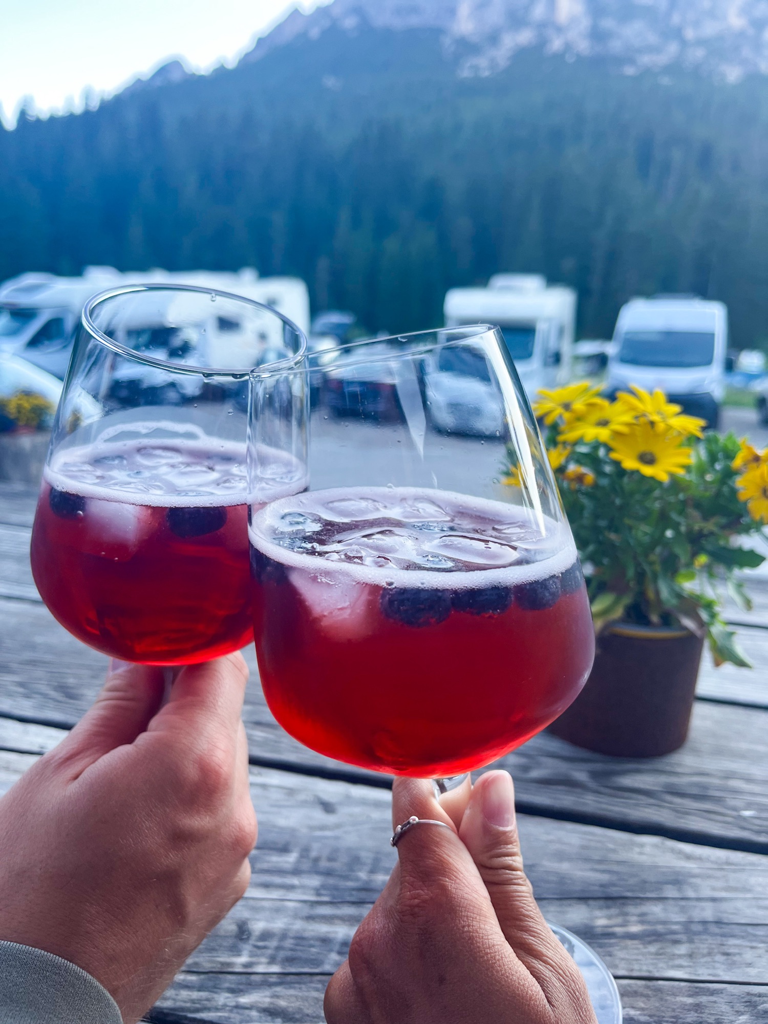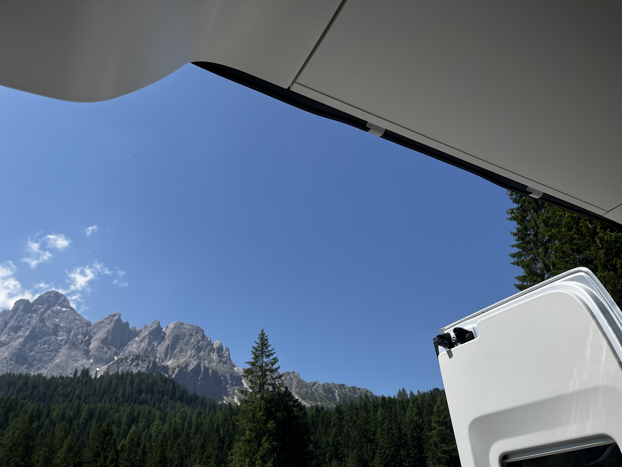 Trotz bescheidener Ausstattung und ordentlichen Preisen, ist dieser prall gefüllt. Auch auf dem angrenzenden Parkplatz stehen Wohnmobile dicht an dicht. Am Abend genießen wir das Alpenglühen auf der Südseite der Drei Zinnen bei einem Glas Lillet Wild Berry in der Bar. Als wir wieder zu unserem Van schlendern, fällt mir an der Einfahrt ein Auto mit Zwickauer Kennzeichen ins Auge. An den Dacia ist ein oranger Anhänger montiert. In den kleinen Fenstern des Autos sind Leinen gespannt, darüber hängen allerhand Kleidungsstücke. Ich wundere mich noch über das eigenwillige Gespann aus unserer Heimat. Am nächsten Morgen dann machen wir schließlich noch Bekanntschaft mit seinem Besitzer. Ein kleiner, untersetzter älterer Herr kaut Sebastian ein Ohr ab, als ich vom Abwasch zurück an den Van komme. Auch ihm ist das heimatliche „ERZ“-Kennzeichen unseres Leihfahrzeugs aufgefallen. „Ja, früher konnte man mit dem Wohnmobil noch nach Venedig hineinfahren, Neapel, Rom. Hab ich alles gesehen. Heute darf man nirgendwo mehr rein. Aber ich habe mir alles umgebaut,“ meint er in breitem Sächsisch und deutet auf den orangen Kippanhänger. Zwei Biotoiletten habe er darin und sogar eine Dusche. Ich reibe mir die Augen und kann es gar nicht so richtig glauben. Noch eine Weile sinniert er über die viel zu teuren Leihgebühren für Vans, wie unseren, beschwert sich, wie er vor Jahren von einem Händler über’s Ohr gehauen wurde. Das Gemeckere zieht meine Stimmung nach unten. Das ist wieder typisch, denke ist und atme innerlich auf, als der Camper sich endlich wieder seinem Kippanhänger zuwendet.
