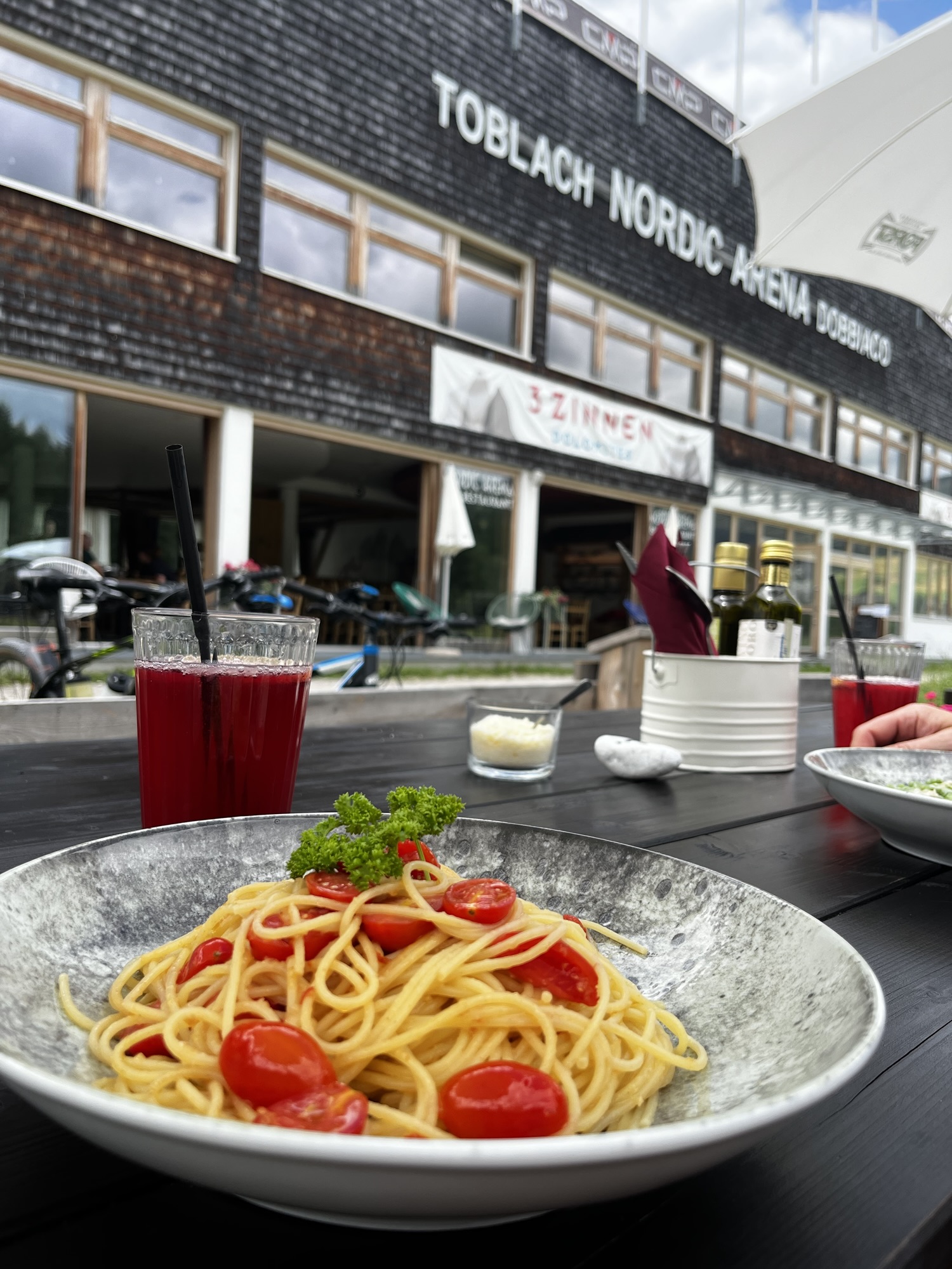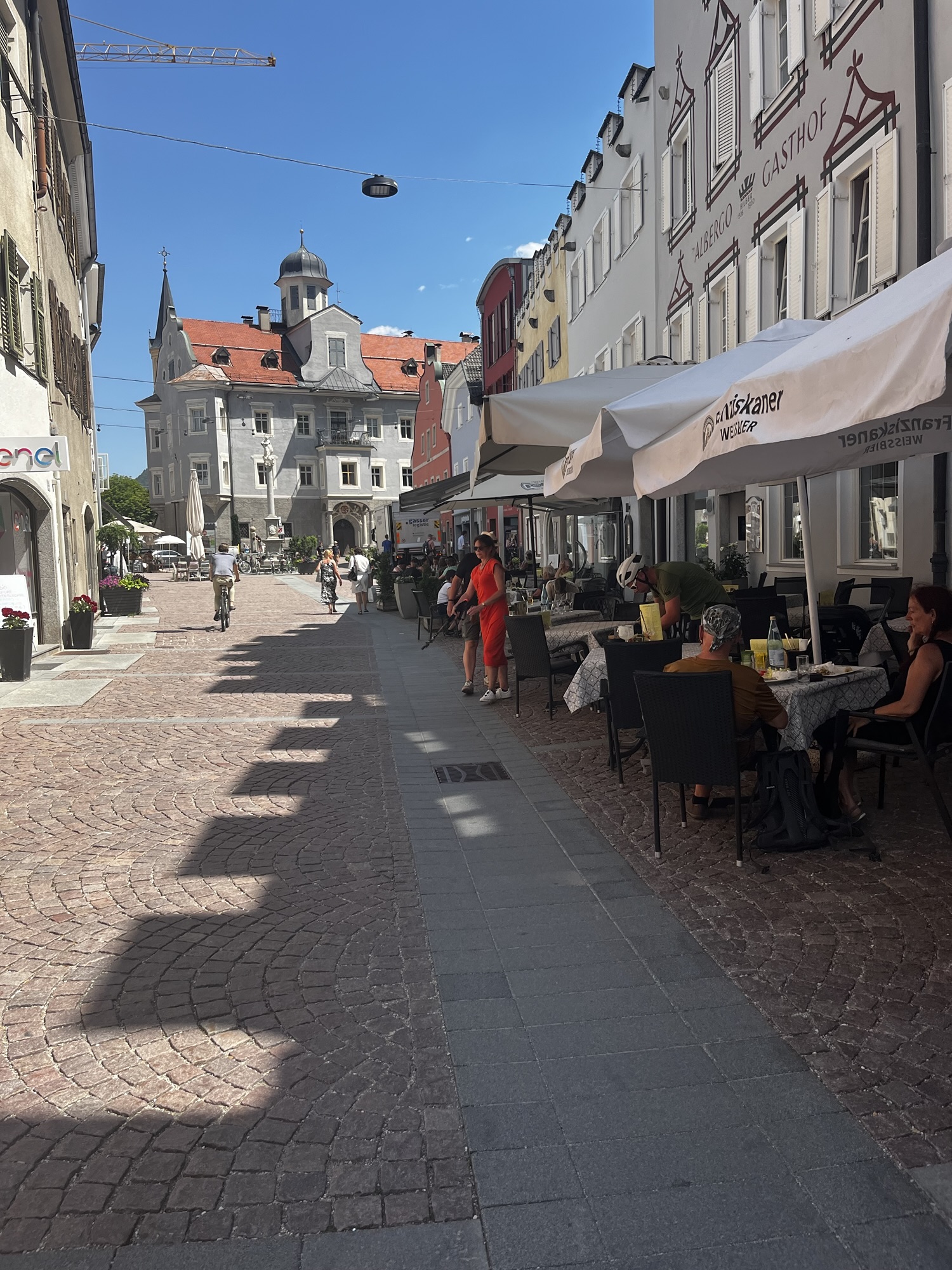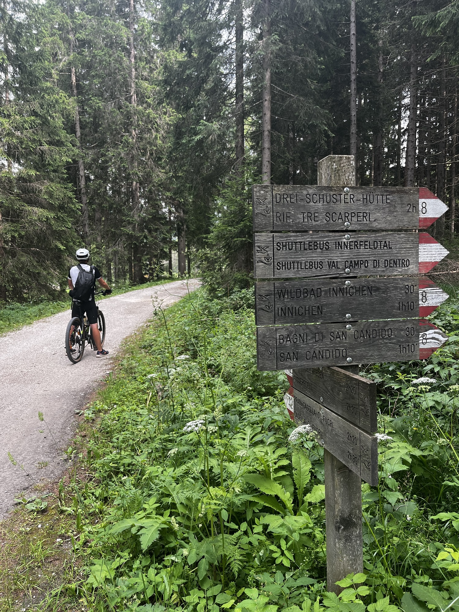 Tatsächlich finde ich während der gemeinsamen Tage in den Dolomiten in eine Art Urlaubsmodus, verschwinde unter den anderen Campinggästen. Kein schwerer Rucksack verrät mich, keine Bergstiefel, keine Wanderstöcke. Stattdessen Sommerkleid, Radlerhose, Fahrrad. Bei bestem Sommerwetter genießen Sebastian und ich die gemeinsame Zeit, radeln nach Bruneck und Toblach. Zu gut kenne ich die Skiarena vom Winter. Vor nicht einmal einem halben Jahr sind wir mit Ski um den halbgefrorenen Toblacher See geskatet. Jetzt glitzert er blau in der Sonne. Ausschlafen, Eis essen, Spritz trinken, den Menschen beim Flanieren durch die Gassen Brunecks zuschauen. Es fühlt sich leicht an, wie jeder andere Urlaub, den wir bisher zusammen verbracht haben. Der Van ist unsere kleine Koje, unser zu Hause auf vier Rädern, wie vor zwei Jahren bei unserem Roadtrip nach Norwegen und Schweden. Nur, dass es diesmal nicht aus Eimern schüttet, wir nicht in einem viel zu kleinen Auto festsitzen und uns anzoffen.