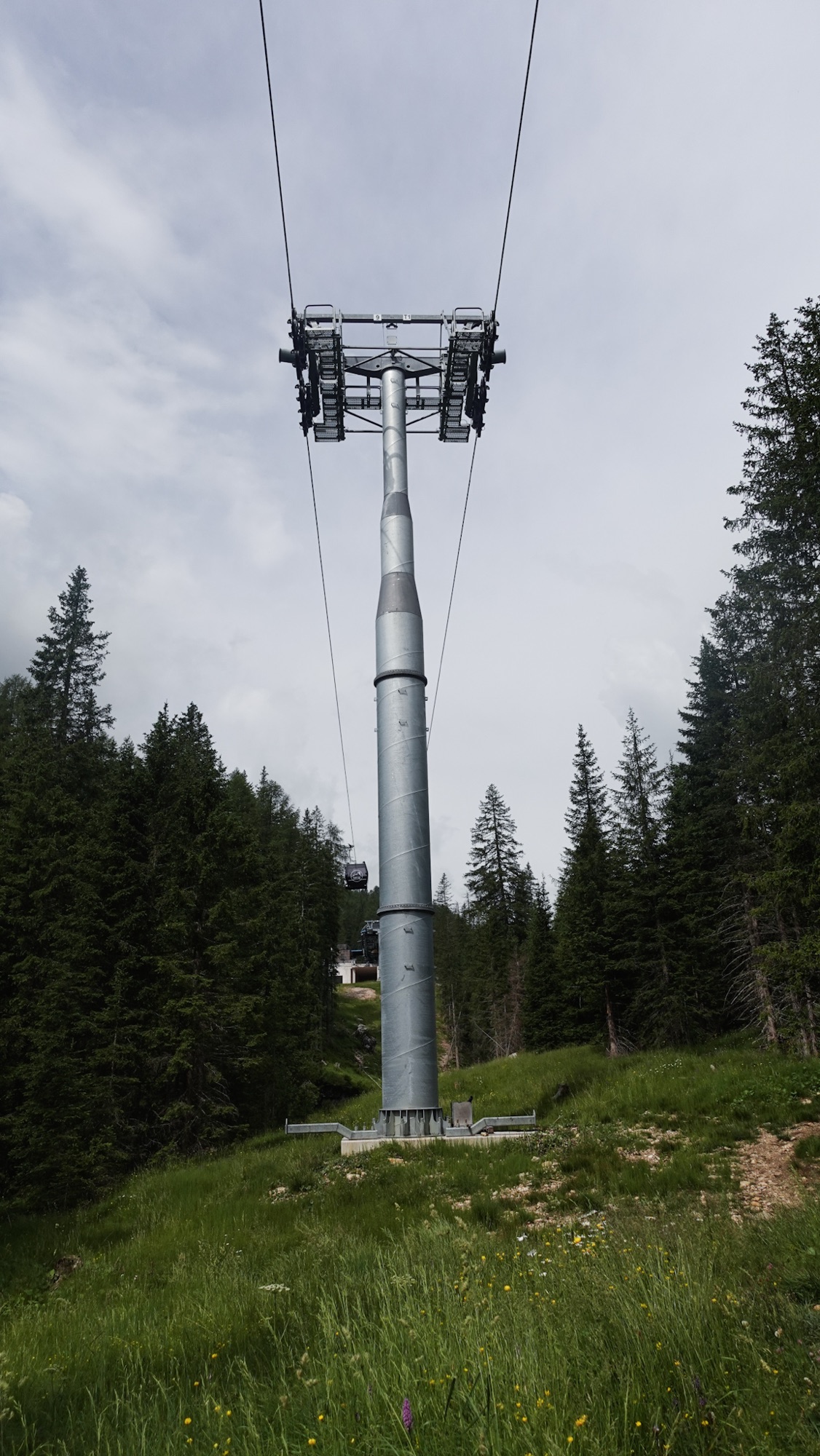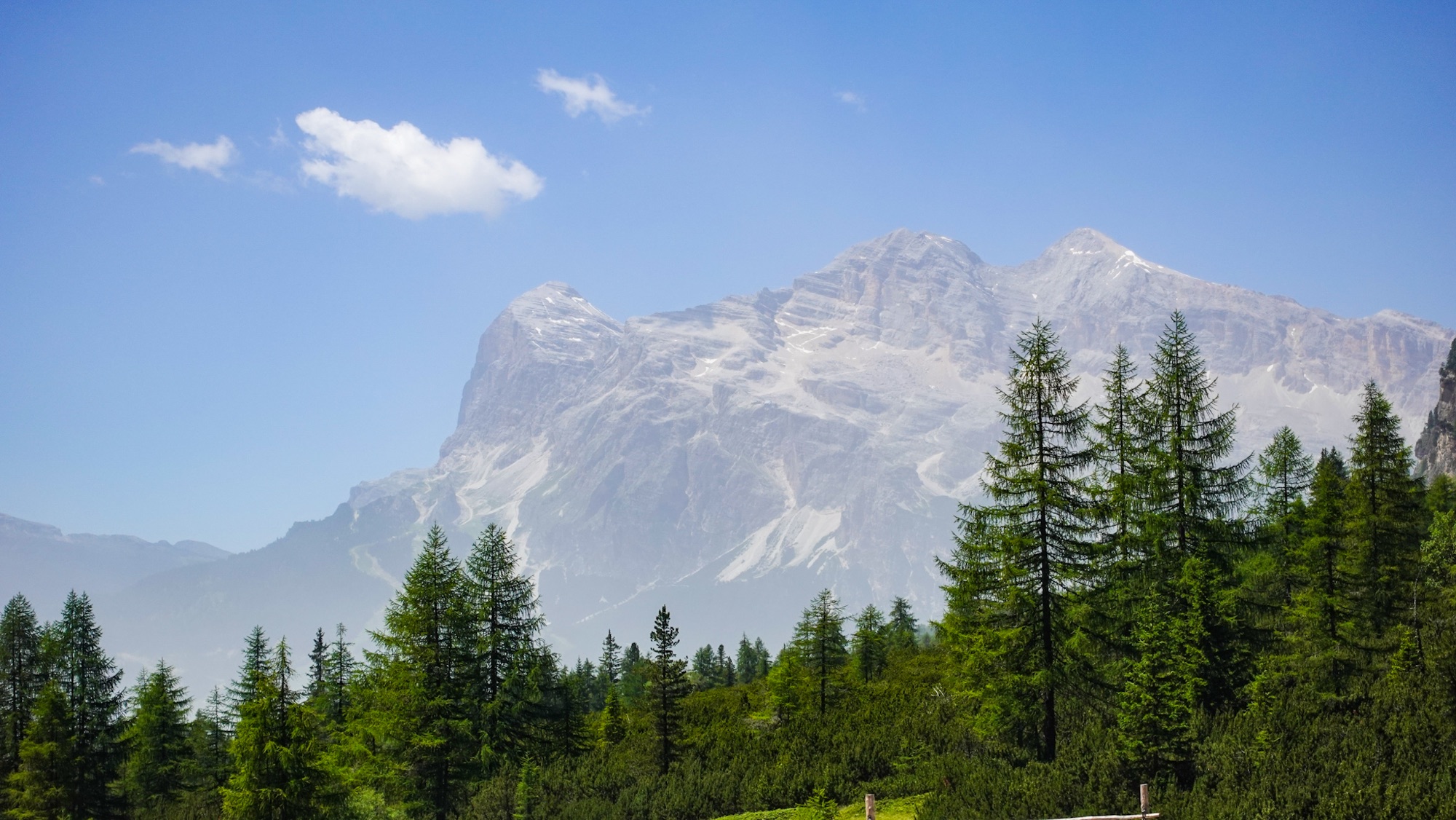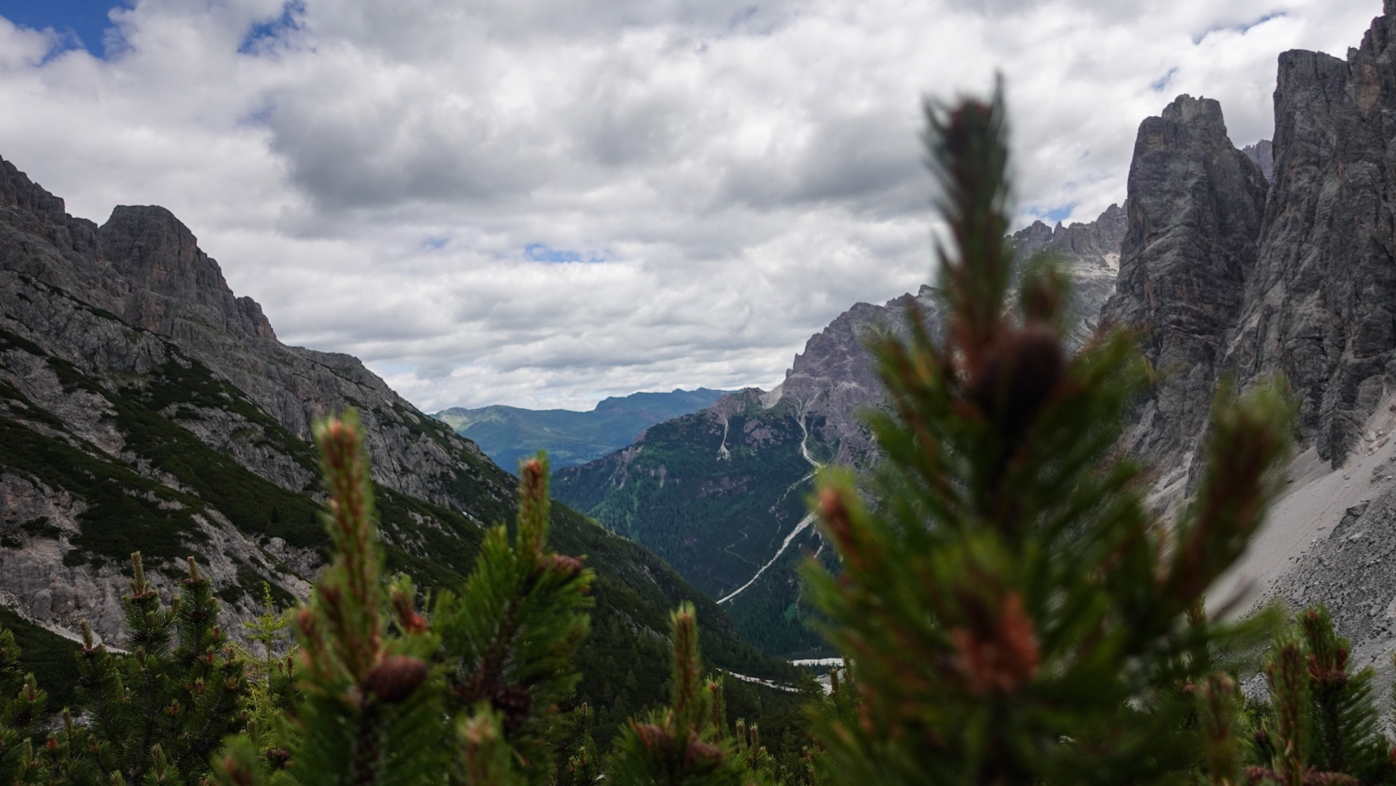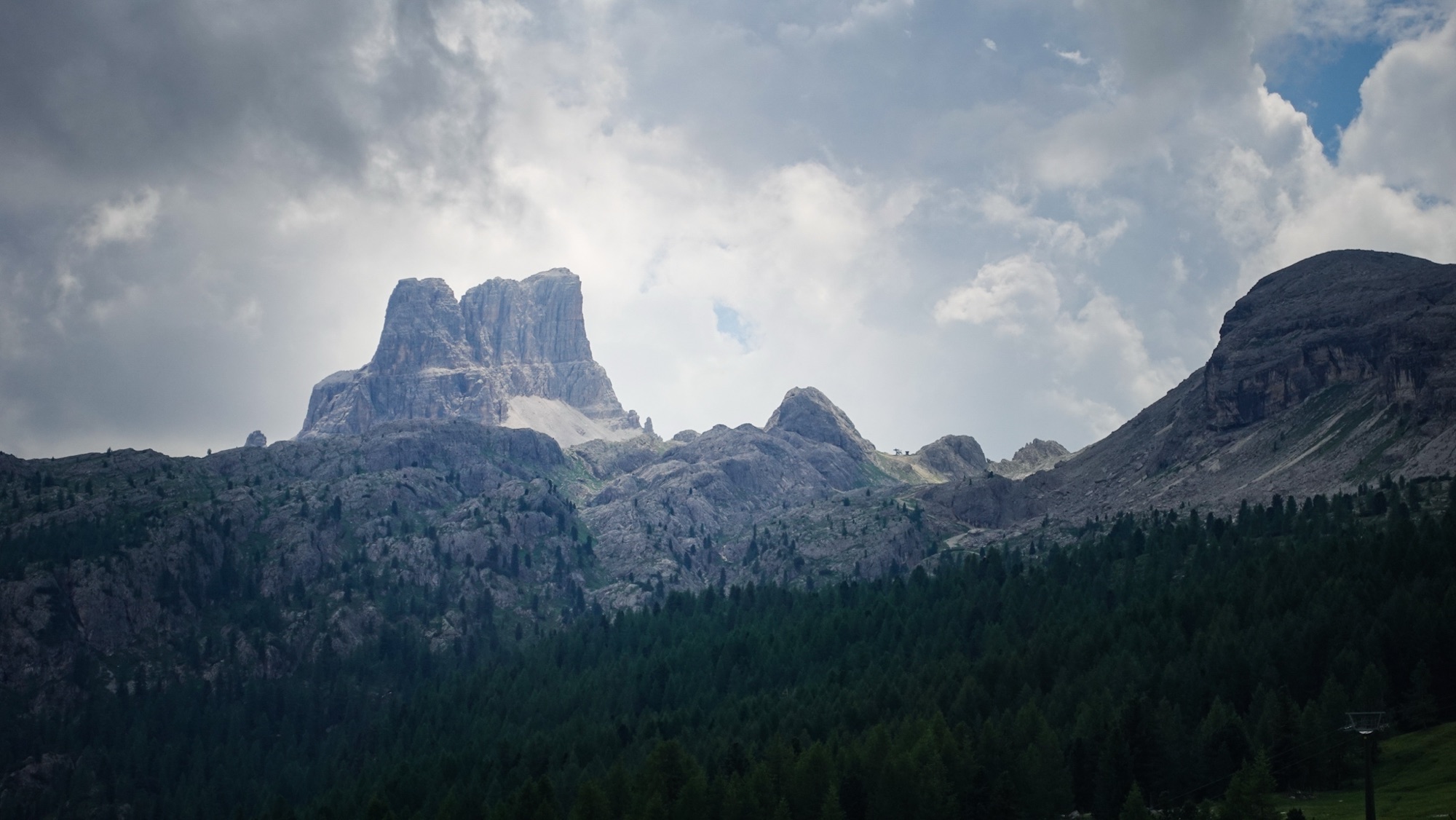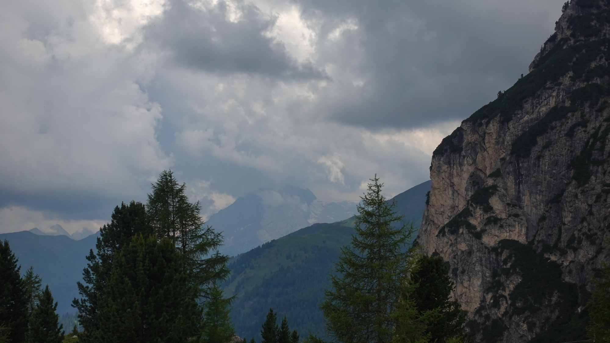 Durch das Val di Falzarego steige ich auf. Der Wanderweg begleitet neben einem malerischen Bachlauf auch die nahegelegene Passstraße. Es dauert nicht lang und schon gehören auch die breiten Schneisen der Skipisten und die Masten der Liftanlagen zum Landschaftsbild. Ich quere überfüllte Parkplätze. Wenig später baumeln die Besitzer der Blechlawinen im Sessellift über meinen Kopf hinweg. Südlich ragen die Cinque Torri in die Höhe. Doch ich laufe weiter gen Westen und erreiche den Passo Falzarego. Ein breites Lächeln huscht über mein Gesicht. Zwischen den dunklen Wolken kann ich die Königin der Dolomiten erkennen: die Marmolata – zum ersten Mal auf dieser Reise. Ihr Name leitet sich vom Lateinischen marmor ab, das wiederum seine Wurzeln im Griechischen hat und so viel wie schimmern oder glänzen bedeutet. Diese Bezeichnung trägt der Berg nicht zu Unrecht. So kann ich mich noch gut an das Funkeln ihrer vergletscherten Nordwände im Sonnenlicht erinnern. Vor vier Jahren war das auf der Alpenüberquerung von München nach Venedig.