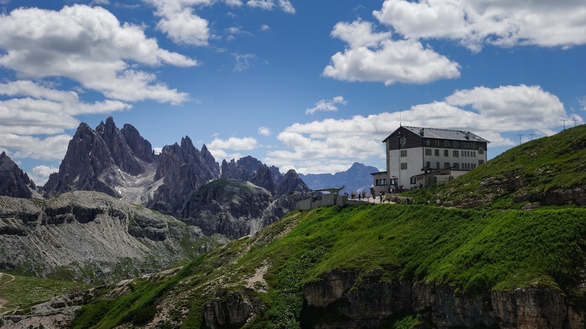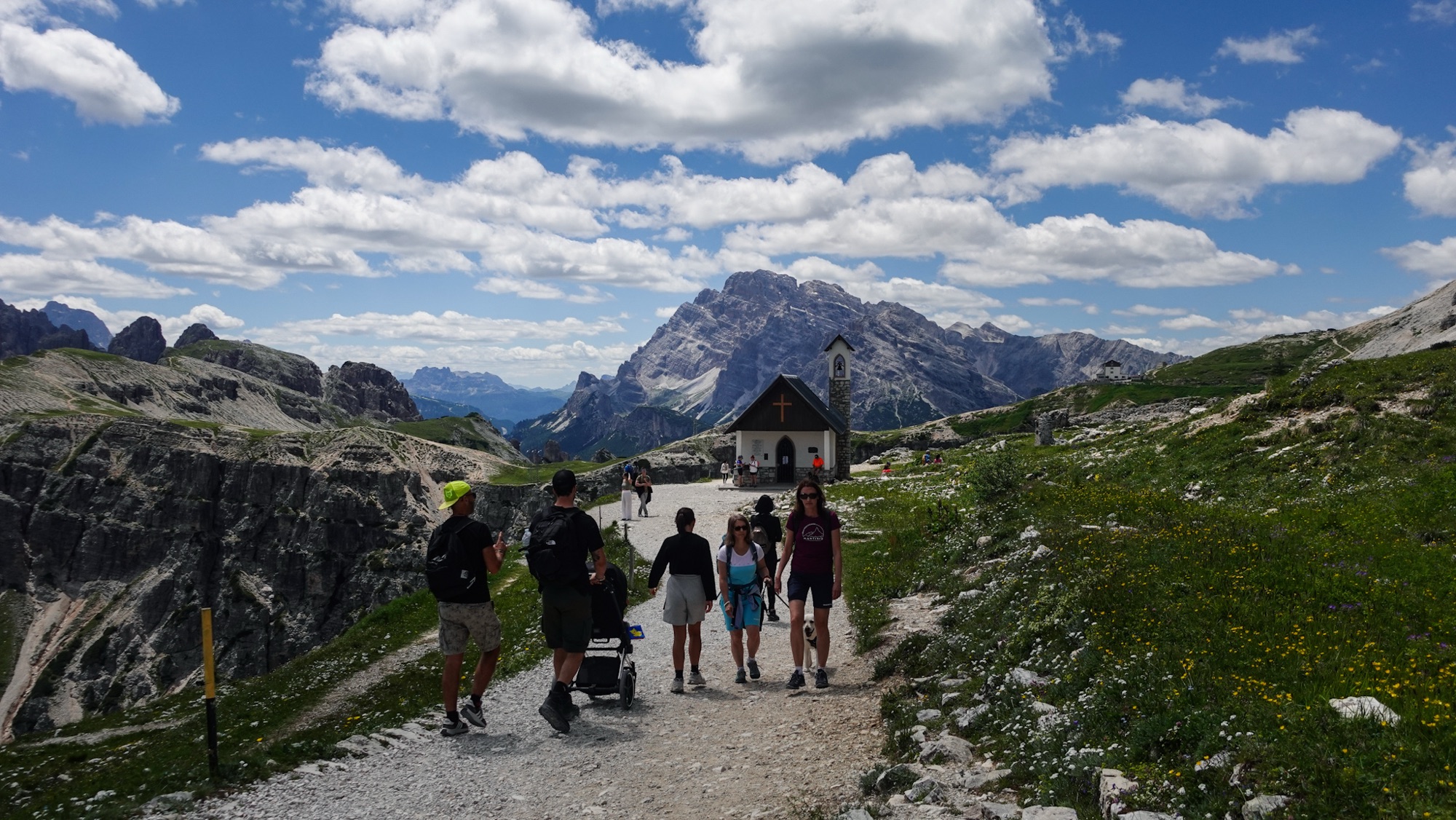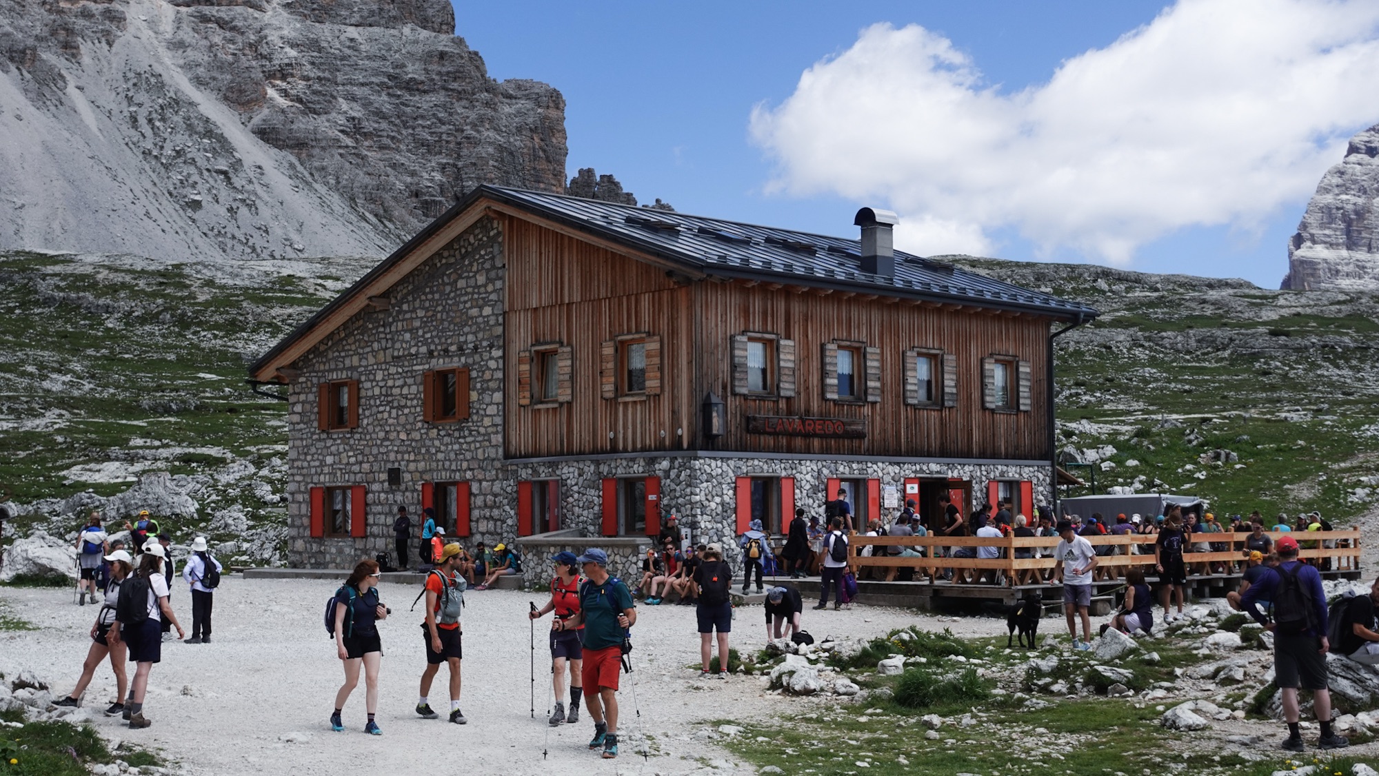 An der Talschlusshütte dünnt sich die Touristengruppe ein wenig aus. Dennoch staut es sich immer wieder auf den Wanderwegen. Mittlerweile bin ich zügig unterwegs. Als die Steigung erstmals zunimmt, schnauft es um mich herum wie in einem Dampflokdepot. Nach lichten Nadelwäldern folgen Bergkiefern und bald schon karstige Hochalmflächen. Ich blicke zurück und kann die Karnischen Alpen erkennen. Der Eisenreichgipfel sendet einen letzten Gruß. Mit jedem Schritt, den ich mich der Dreizinnenhütte nähere, steigt der Geräuschpegel. Eine japanische Großfamilie posiert auf einer Sitzgruppe vor dem Panorama der imposanten Felstürme. Eine lange Schlange zieht sich vom Eingang der Dreizinnenhütte, über die eiserne Treppe bis hinunter auf das Felsplateau. Auf der Terrasse ist kein Platz mehr zu bekommen. Selfiesticks fliegen durch die Luft. Wild werden Körperteile und Haare für das perfekte Foto geschwungen. Laut rufend versucht so mancher verlorene Wanderausflügler den Rest seiner Reisegruppe wiederzufinden. Am eigentümlichsten erscheinen mir aber einige chinesische Touristinnen, die in mindestens 20 Zentimeter hohen Plateauschuhen über die schmalen Wanderpfade stolpern.