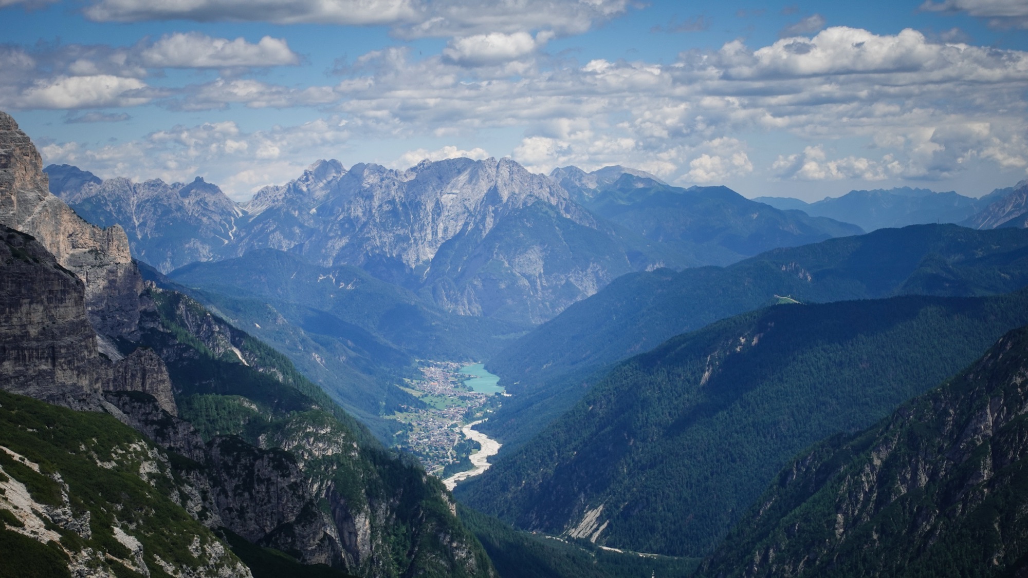 Insgesamt erinnert mich die Kulisse eher an einen Freizeitpark als an ein Schutzgebiet. Unbehagen durchströmt mich und so laufe ich rasch weiter entgegen des Touristenstroms. Die meisten von ihnen fahren vom Lago di Misurina kommend über die Mautstraße bis hinauf zum letzten Parkplatz. Die letzten Kilometer bis zur Nordseite der Drei Zinnen sind unschwer und sogar mit dem Kinderwagen zu bewältigen. Nichtsdestotrotz stakst so mancher Turnschuhabenteurer bisweilen überfordert durch die alpine Landschaft. Auch die Terrasse des Rifugio Lavaredo ist voll besetzt. Zum Glück haben sich Sebastian und ich erst am Rifugio Auronzo verabredet. Mit dem Mountainbike will er die Mautstraße hinauffahren. Weil ich gut in der Zeit liege, bleibt mir ein Moment, um den atemberaubenden Ausblick über Auronzo di Cadore und den azurblauen Lago di Santa Caterina zu genießen. In bizarren Nadeln ragt südlich vor mir die Cadini-Gruppe empor.