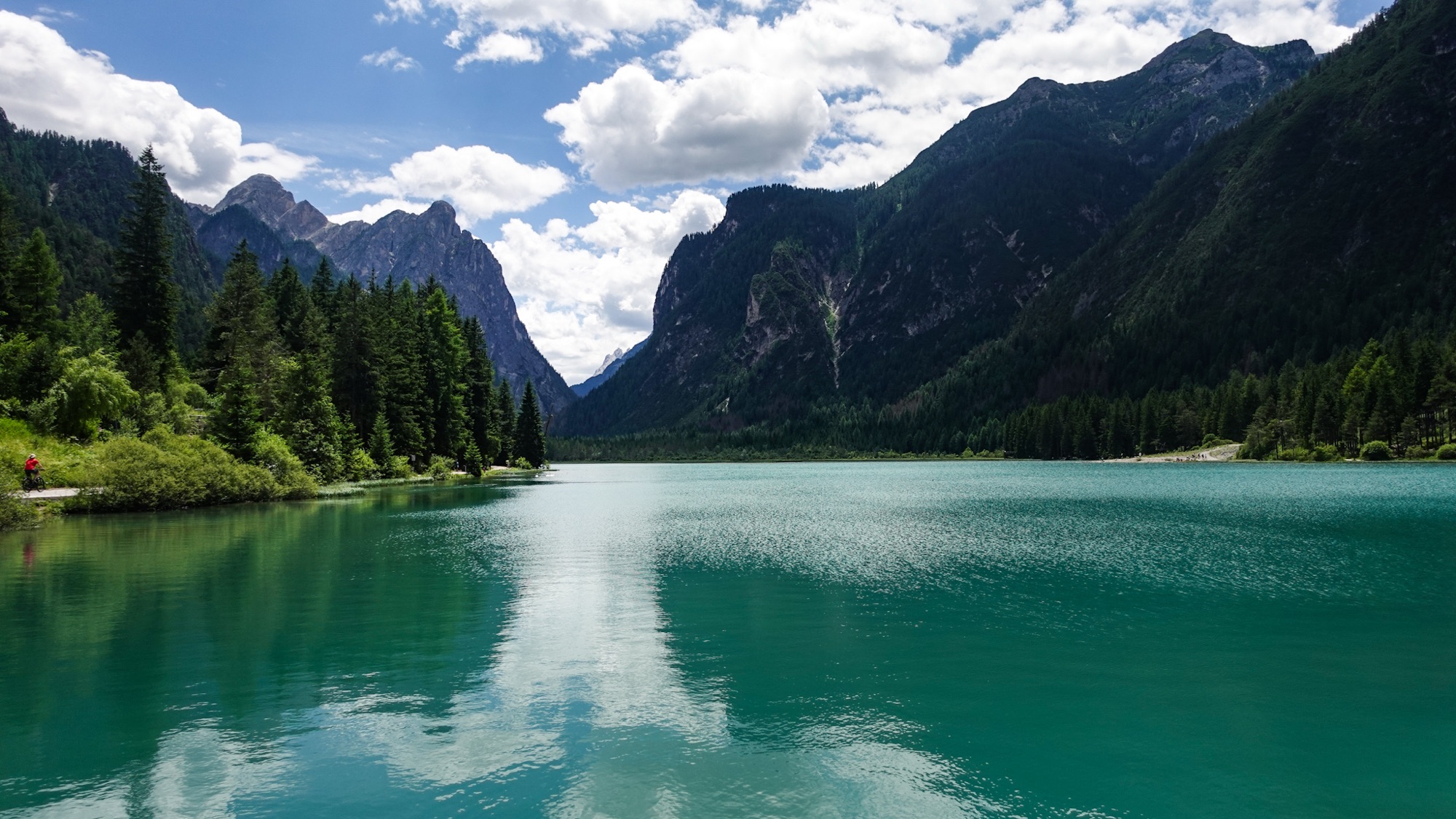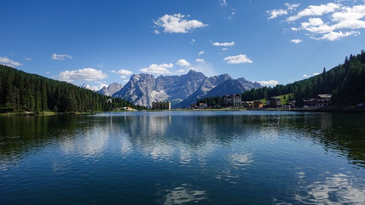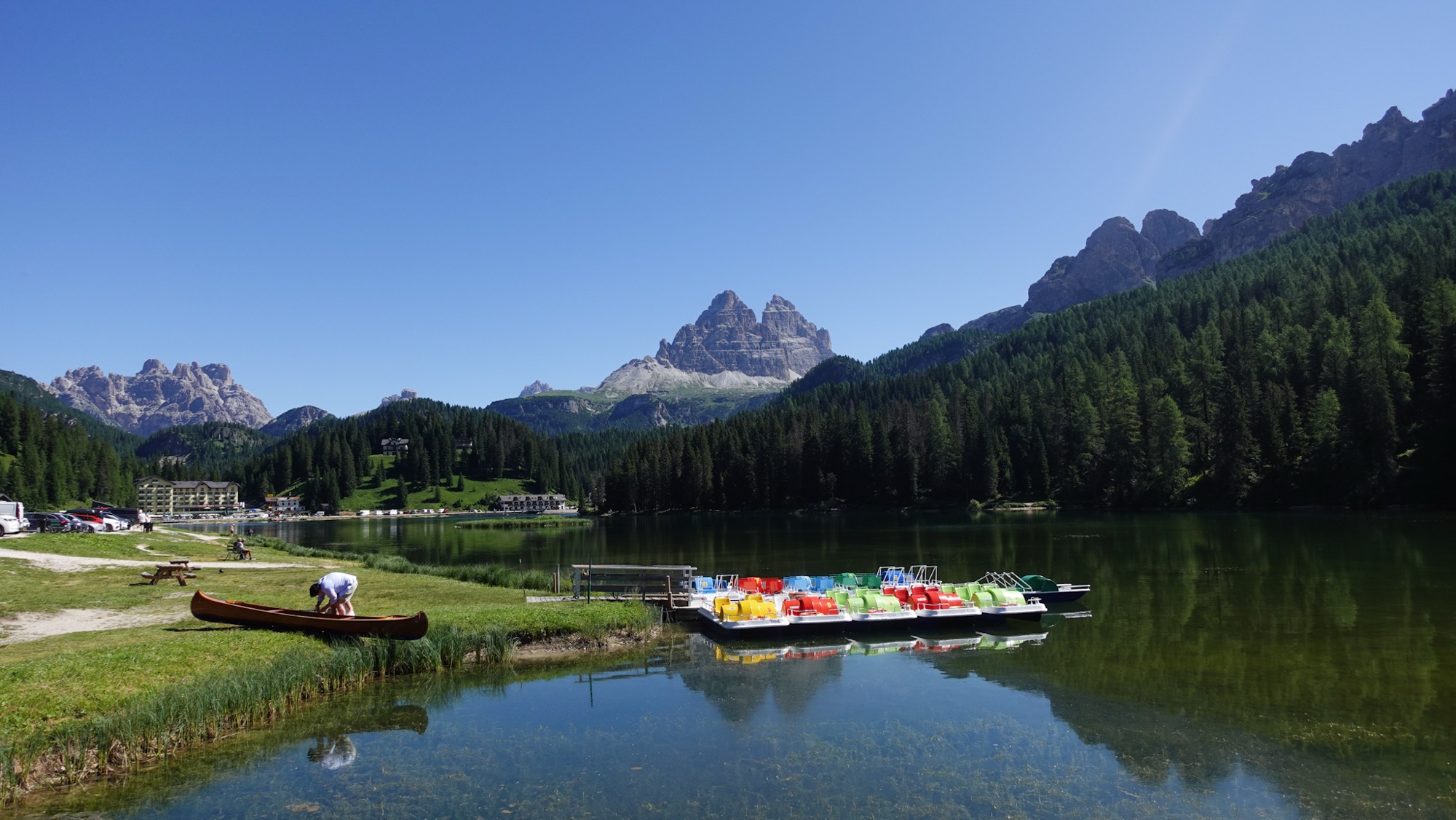 Grünlich blau wie geschmolzenes Glas glitzert der Lago di Misurina im Sonnenlicht. Dahinter türmen sich die Gipfel der Sorapiss-Gruppe auf. Etliche Touristen und Ausflügler schlendern an seinen Ufern entlang. Noch sind die bunten Tretboote leer, doch erste Kajakfahrer lassen ihre Schiffchen zu Wasser. Um nach Cortina d’Ampezzo zu gelangen, folge ich zunächst einigen Mountainbike-Strecken durch den Wald. Einen durchgängigen Wanderweg gibt es jedoch nicht und so finde ich mich auf einer stark befahrenen Gebirgsstraße unterhalb des Monte Cristallo wieder. Motorräder und Sportwagen brausen ebenso an mir vorüber wie schwere Lastwagen. Duzende Wohnmobilen und Vans parken eng aneinander nahe des Passo Tre Croci. Überall ist zu spüren, wie stark die Dolomiten mittlerweile touristisch erschlossen sind. Ich überquere die kleine Kuppe und erblicke die Tofana-Gruppe. Ihre monumentale Erscheinung packt mich. Wieder einmal rollen mir unvermittelt Tränen aus den Augen. Für mich ist es zusehends schwerer zu begreifen, dass ich all diese wunderbaren Orte allein durch die Kraft meines Körpers erreiche. So überfluten mich von Zeit zu Zeit die Emotionen – eine wilde Mischung aus Traurigkeit, Freude, Euphorie.