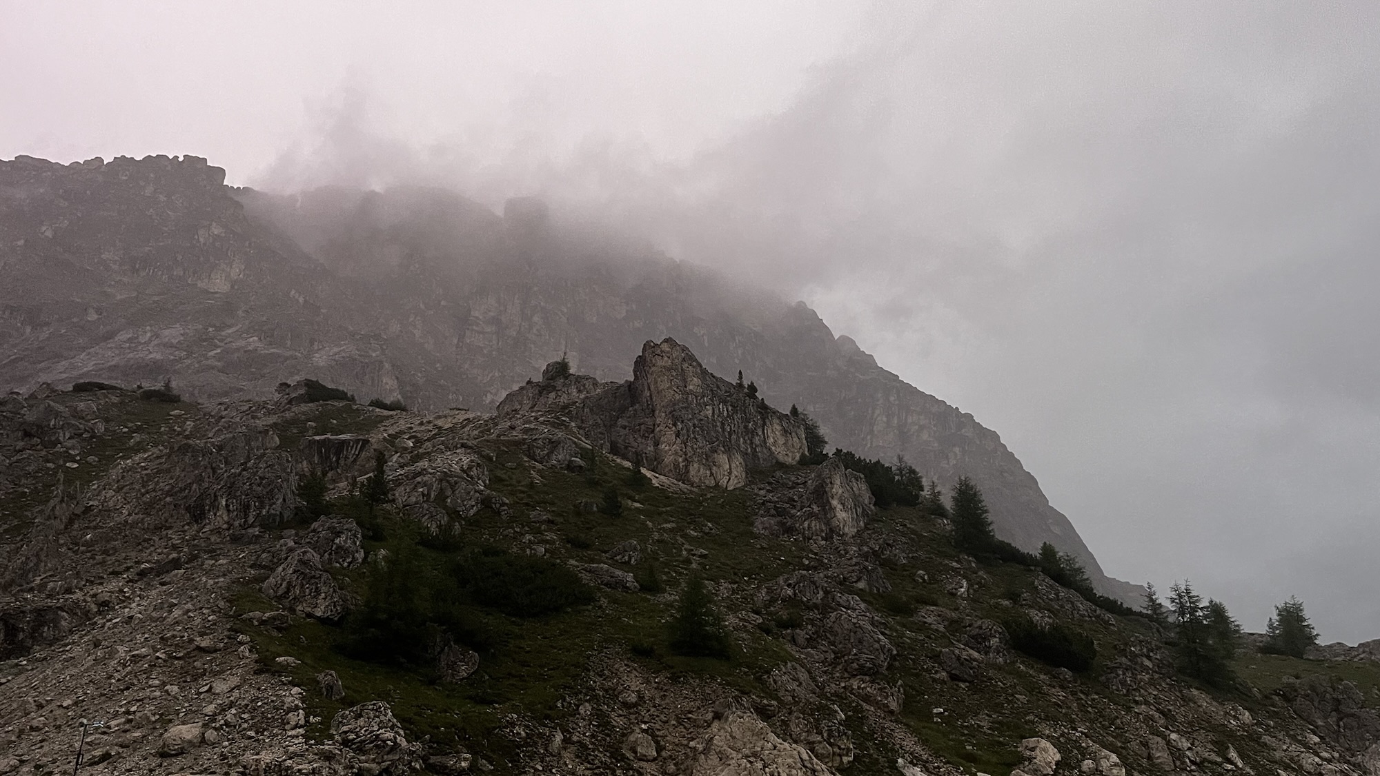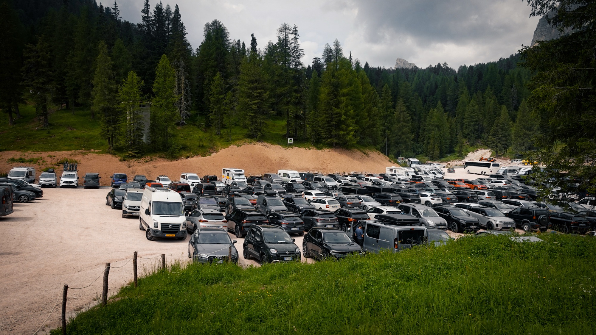 Wir verstauen ebenfalls alles wieder im Auto. Erneut schnüre ich meine leichten Trailrunningschuhe, schultere den Tagesrucksack und mache mich auf den Weg in Richtung Cortina d’Ampezzo, während Sebastian mit dem Van vorausfährt. Die ersten Schritte des Tages schmerzen. Die Überlastung im Fuß ist kaum besser geworden. Im Gegenteil, fast scheint es, als würde das leichte Schuhwerk den Schmerz noch verstärken. Nach ein paar Metern wird es langsam besser.