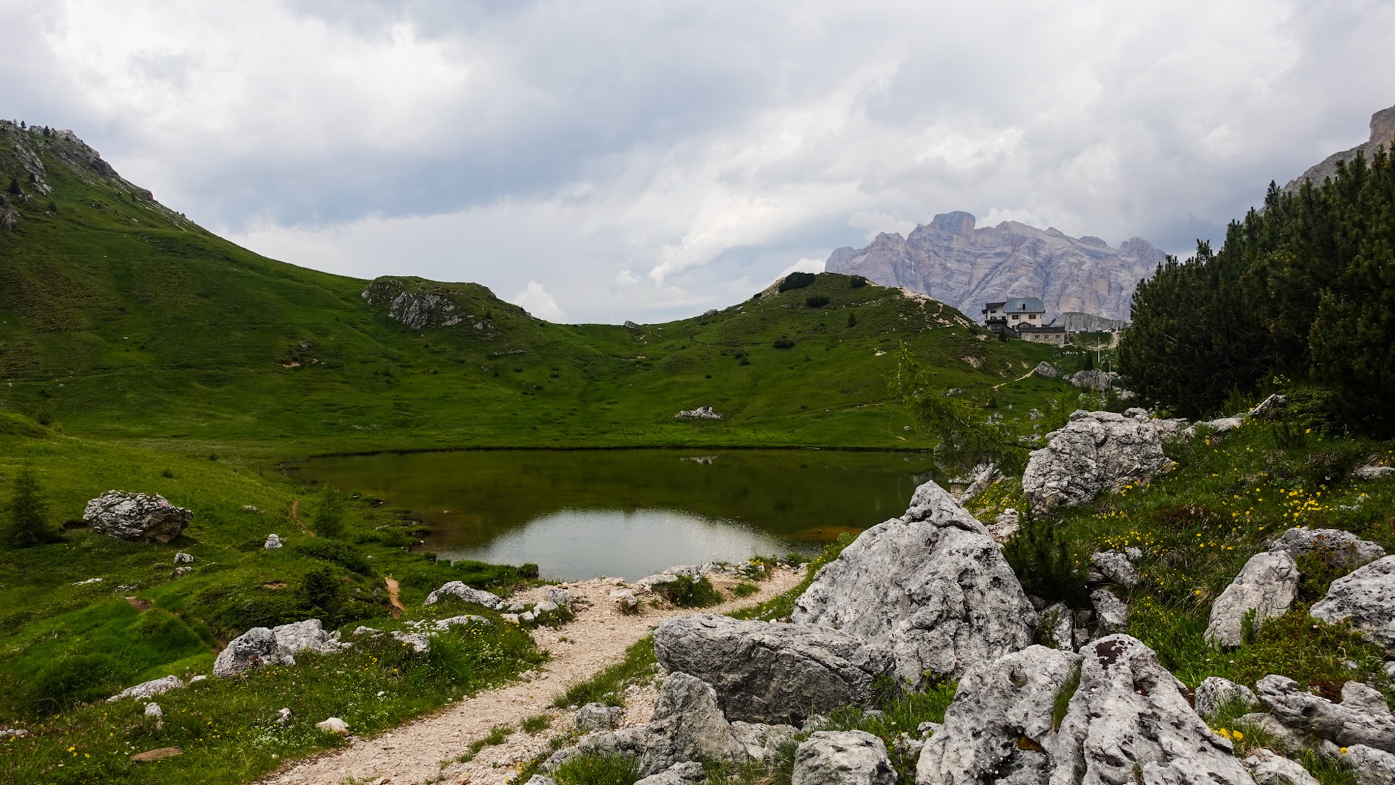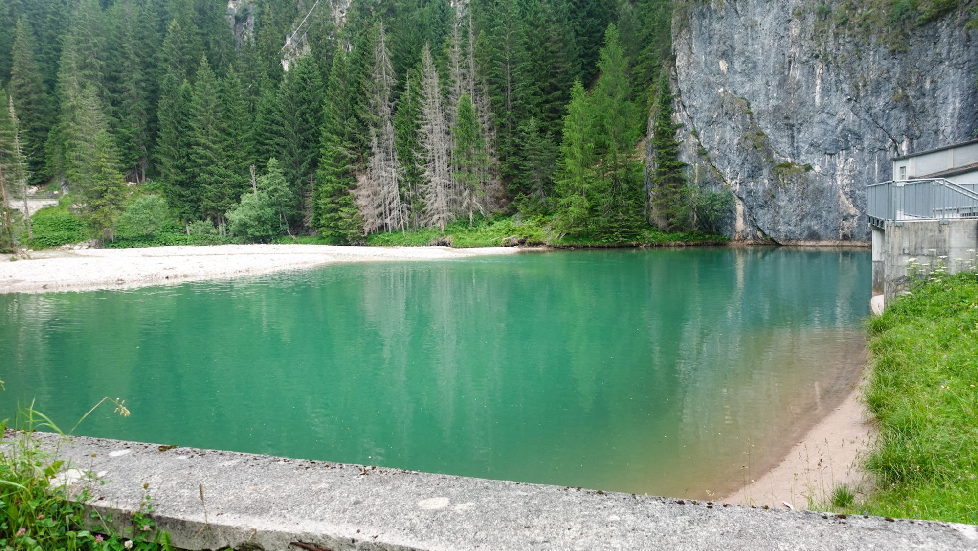 Zahlreiche Kletterer hängen an den Nordwänden der Sas de Stria-Gruppe. Dunkel und ruhig liegt der Lago di Valparola unterhalb des gleichnamigen Passes und Rifugios – mein heutiges Ziel. Trockenen Fußes erreiche ich bereits 14.00 Uhr den Pass und beziehe mein gemütliches Doppelzimmer. So bleibt mir genügend Zeit, um zu waschen, zu entspannen und die kommenden Tage zu planen. Das Abendessen ist gut. Spaghetti aglio olio, Salat, Gulasch. Zum Nachtisch Panna Cotta. Einzig die breiartige Polenta bleibt für mich ein zweifelhaftes Vergnügen in den italienischen Bergen.