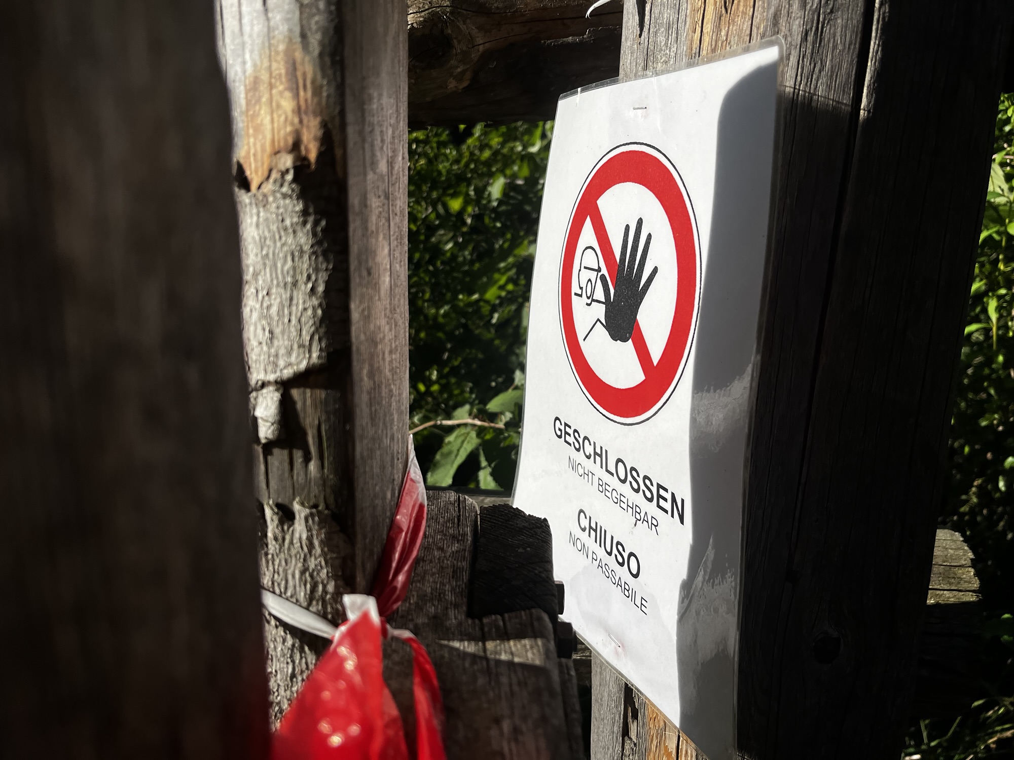 Als wir kichernd schon unsere Rucksäcke schultern, kommt ein wutgepumpter Belgier um die Ecke geschossen, hält einen Zeigefinger vor den Mund und zischt. „Schhhhhht, be quite! We’re sleeping! You are not alone!“ Recht hat er – noch nicht. Schnurstracks verlassen wir den Campingplatz. Die aufgehende Sonne taucht den Asphalt in einen tiefen Goldton, als wir durch Prad schlendern. Wir nutzen die letzte Gelegenheit, um in der örtlichen Bäckerei noch einmal Vinschgerl zu kaufen. Dann beginnt ein langer, zäher Aufstieg. Celine hatte schon am Vorabend gewarnt, dass ein Teil der Wegstrecke wegen eines Brandes im Frühjahr gesperrt sein könnte. Bereits von unten entdecken wir einzelne Bäume, die wie verkohlte Nadeln am Berg stehen. Kurze Zeit später stehen wir vor Schildern, die uns warnen „Durchgang verboten! Weg gesperrt.“ Wir werfen einen Blick auf die Karte. Doch der einzige Umweg führt durch den Talboden entlang der Straße. Wir schauen uns an. „Was meinst du?“ frage ich. „Komm, wir probieren es.“ Wir überklettern die Absperrung und setzen unseren Weg fort über verbrannte Erde, vorbei an verkohlten Bäumen, Büschen, Wegbefestigungen. Doch es gelingt und so legen wir in dem idyllischen Stilfs eine ausgedehnte Rast ein.