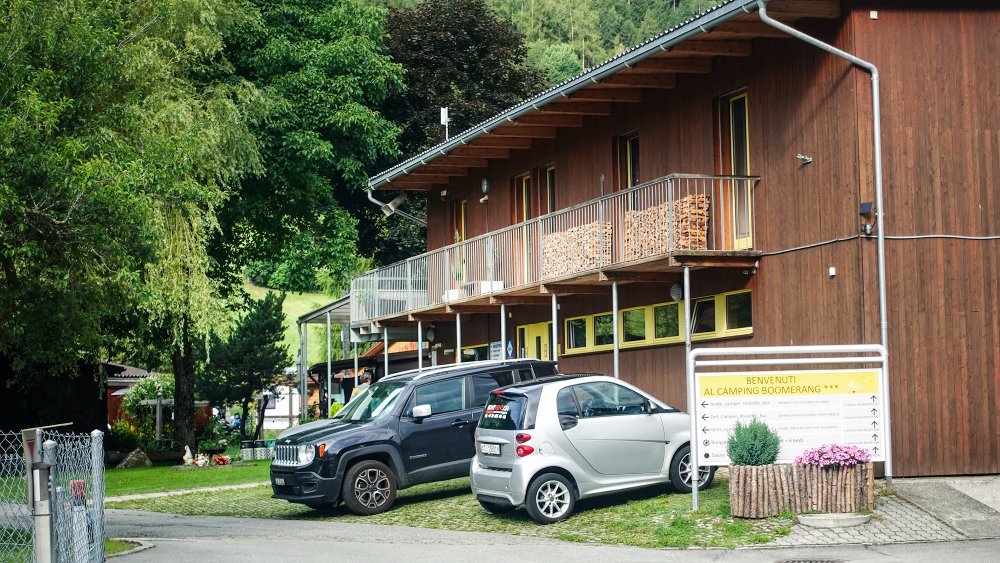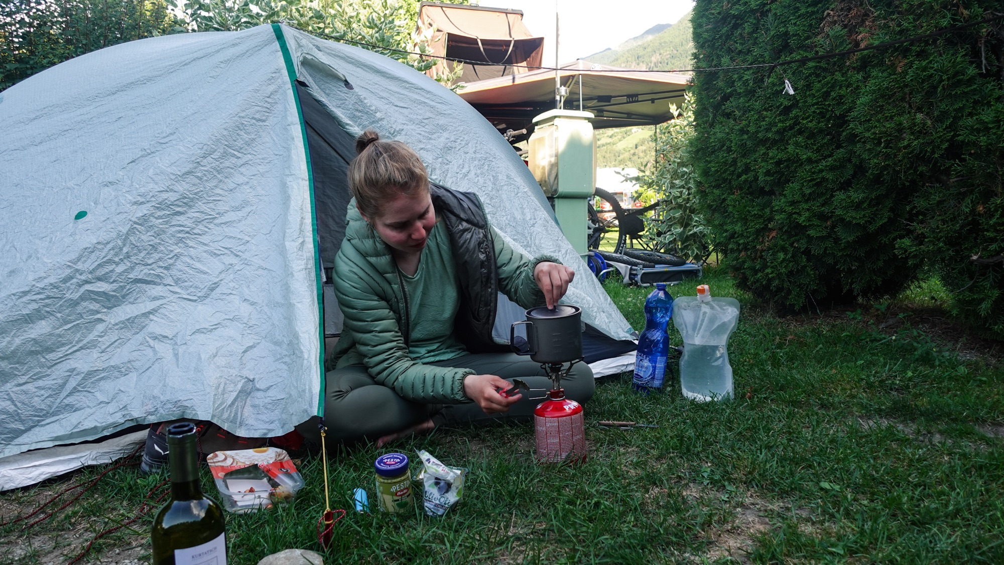 In Prad entern wir zuerst den Supermarkt. Es tut gut, mal nicht allein zu sein. Mal nicht die Einzige, mit schwerem Rucksack. Mal nicht die Einzige in festen Bergstiefeln. Mal nicht die Einzige, der deswegen andere nachschauen. Mal nicht die Einzige, die wegen Dauerkohldampf wieder einmal viel zu viel einkauft. Andererseits werden wir erst in vier Tagen wieder eine Einkaufsmöglichkeit haben, wenn wir Poschiavo erreichen. In einem kleinen Eisenwarengeschäft werde ich auf der Suche nach einer neuen Gaskartusche fündig. Danach biegen Celine und ich auf den Campingplatz Sägemühle ein. Auch hier bin ich schon einmal mit meinen Eltern gewesen – vor 24 Jahren. Der Platz ist rappelvoll. Kinder tollen zwischen Autos, Wohnmobilen und Zelten. Nach wenigen Minuten im Hallenbad kommt Celine genervt zurück. Sie hat einen Ball gegen den Kopf bekommen.