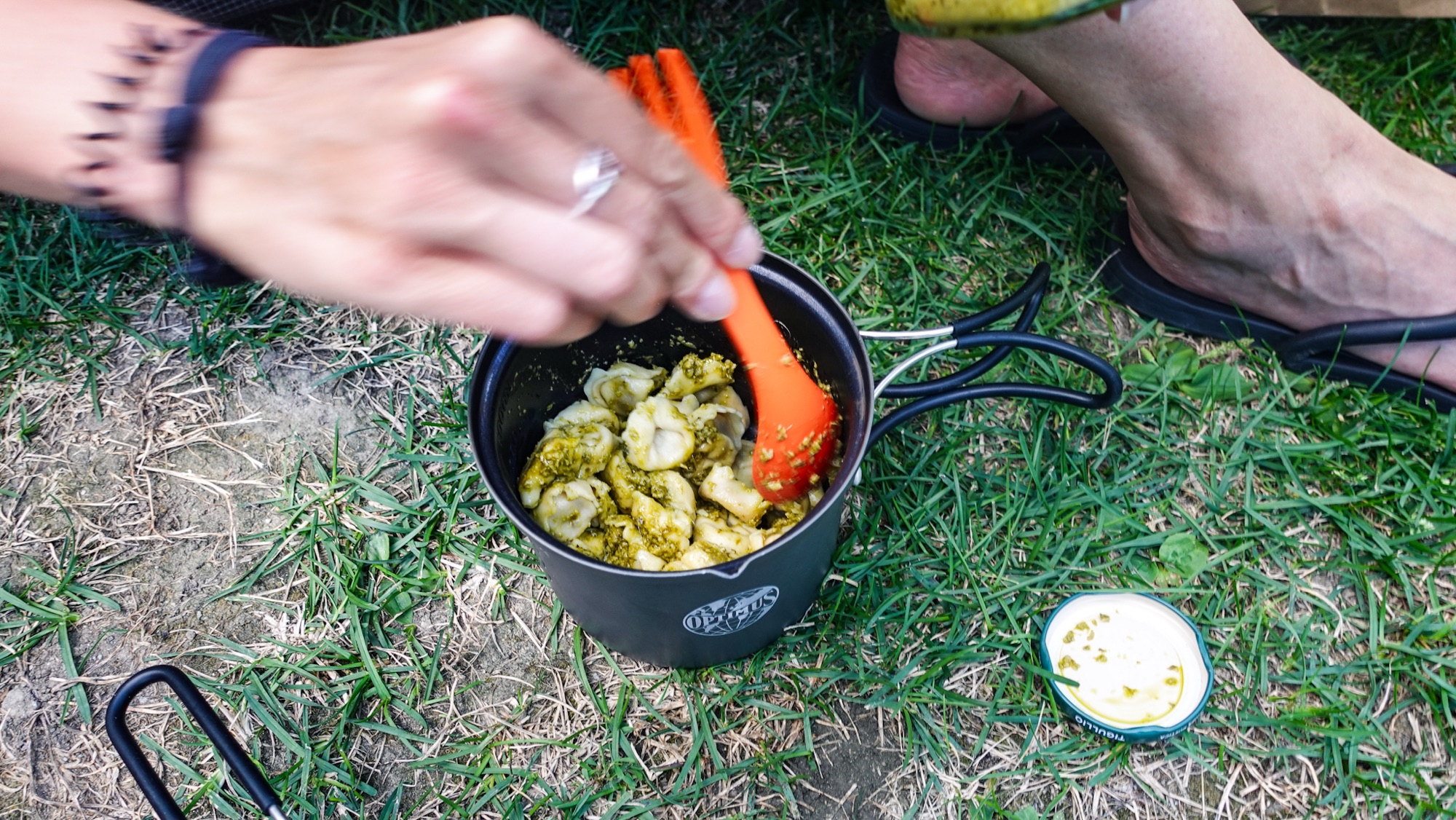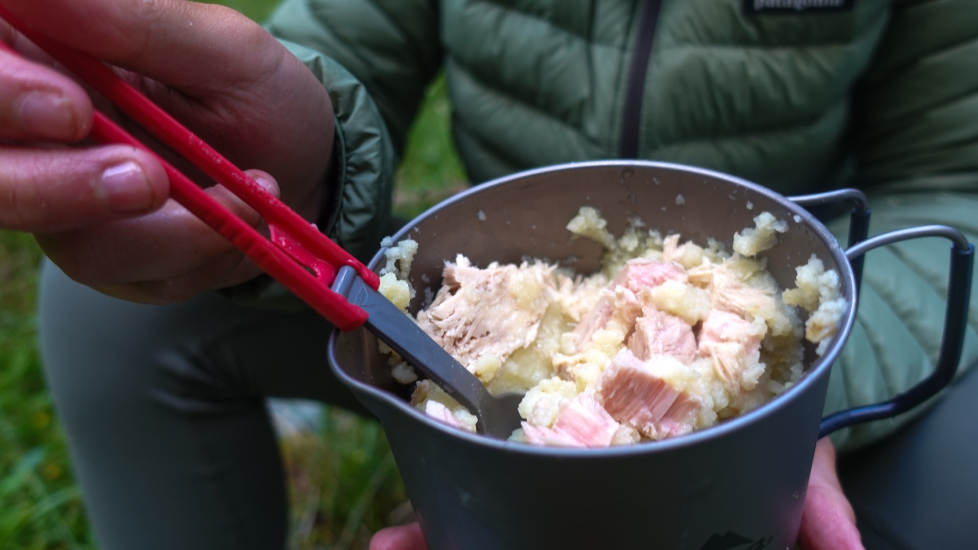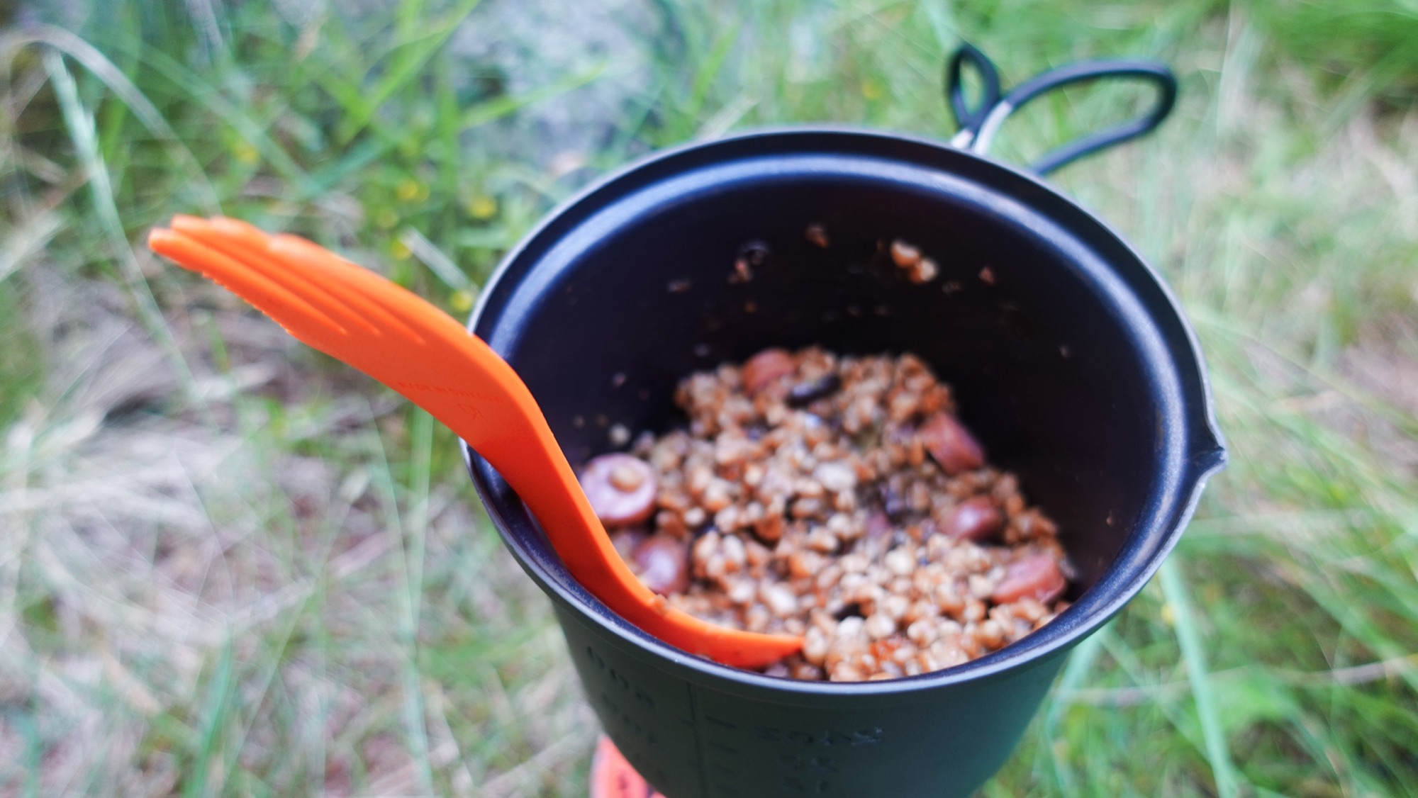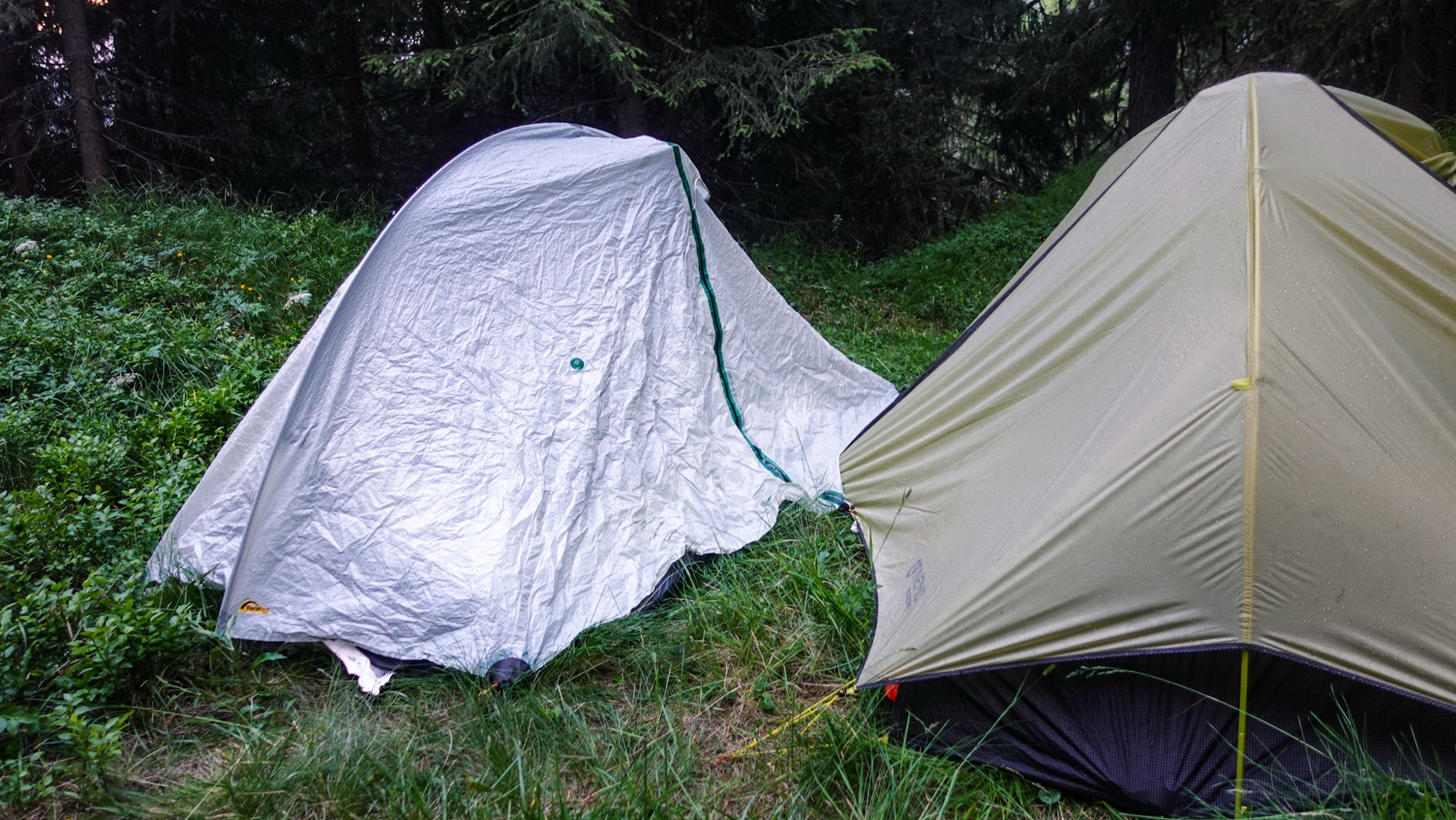 Gegen 18.00 erreichen wir ein kleines Wäldchen unterhalb einer Alm nahe Arnoga. Eine gefühlte Ewigkeit schlagen wir uns durchs Unterholz auf der Suche nach einer geeigneten Stelle für zwei Zelte im abschüssigen Gelände. Schließlich entscheiden wir uns für die erste Option. Ganz wohl fühle ich mich dabei nicht. Immerhin sind von hier aus noch die Häuser der Alm zwischen den Bäumen zu sehen. Im Zweifel sind auch wir von dort oben zu erkennen. Celine beruhigt mich. „Wir schauen von hier unten ins Licht. Von dort oben blickt man nur ins Dunkel. Wir sind hier nicht zu sehen.“ Kaum haben wir unsere Zelte aufgebaut, beginnt es auch schon zu nieseln. In einer kurzen Regenpause köcheln wir unser Abendessen. Celine rührt sich Kartoffelbrei mit Thunfisch zusammen. Bei mir gibt es hingegen eine Instant-Buchweizenpfanne mit Kaminwurz. Anschließend brühen wir aus dem gesammelten Frauenmantel noch unseren Tee, um danach fix und fertig in die Zelte zu fallen. Wieder kreisen meine Gedanken, diesmal aber in die andere Richtung.