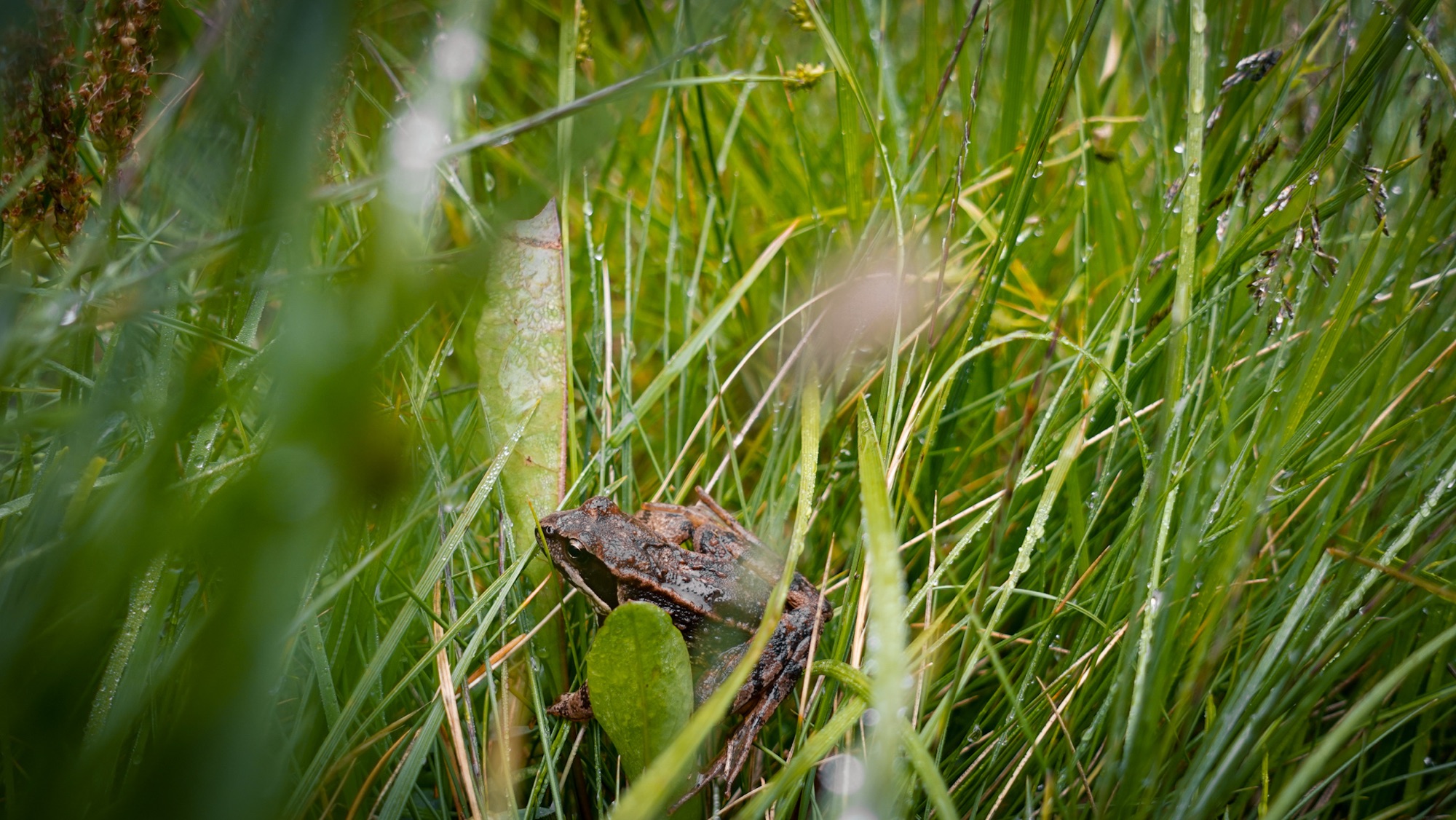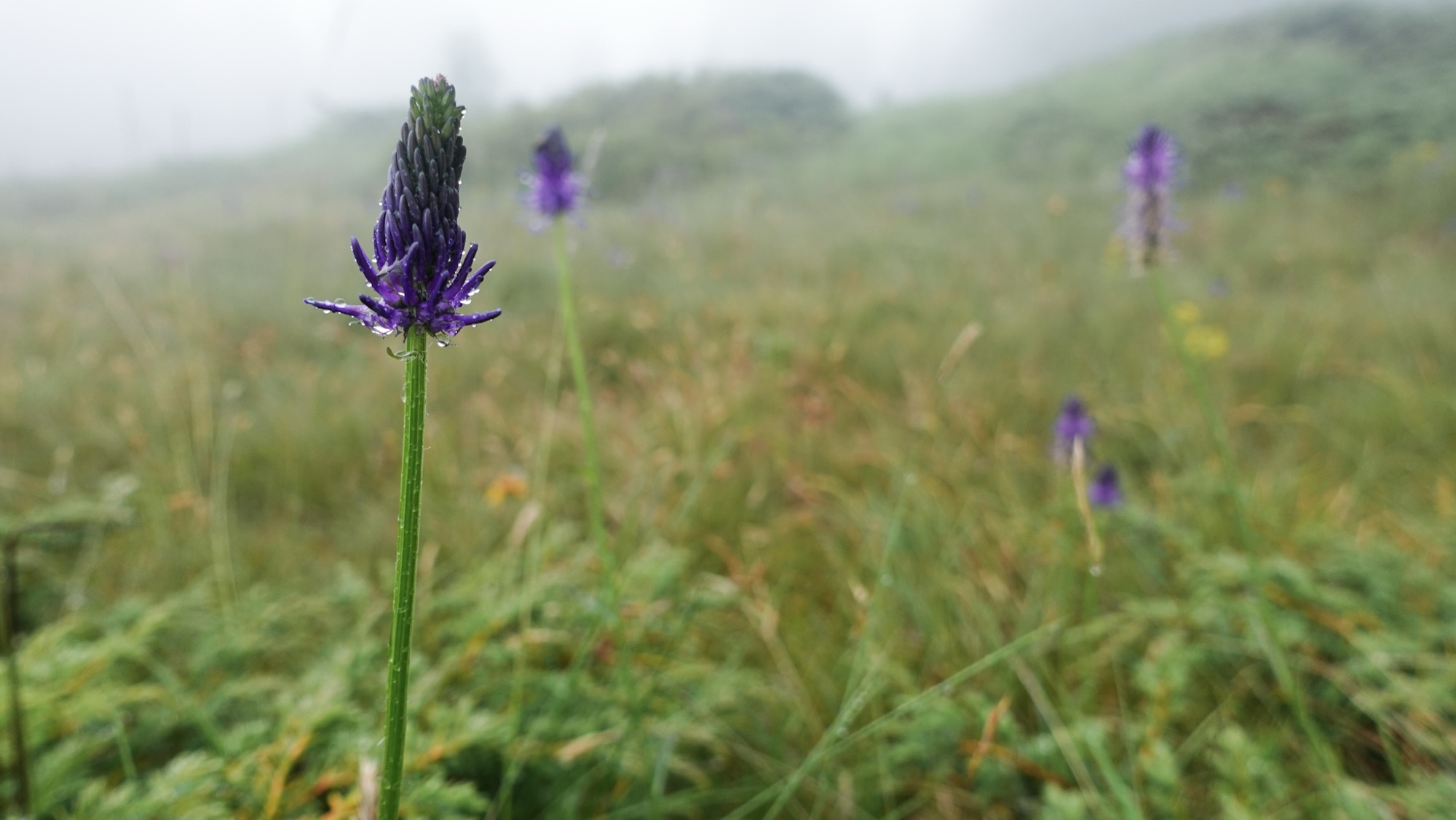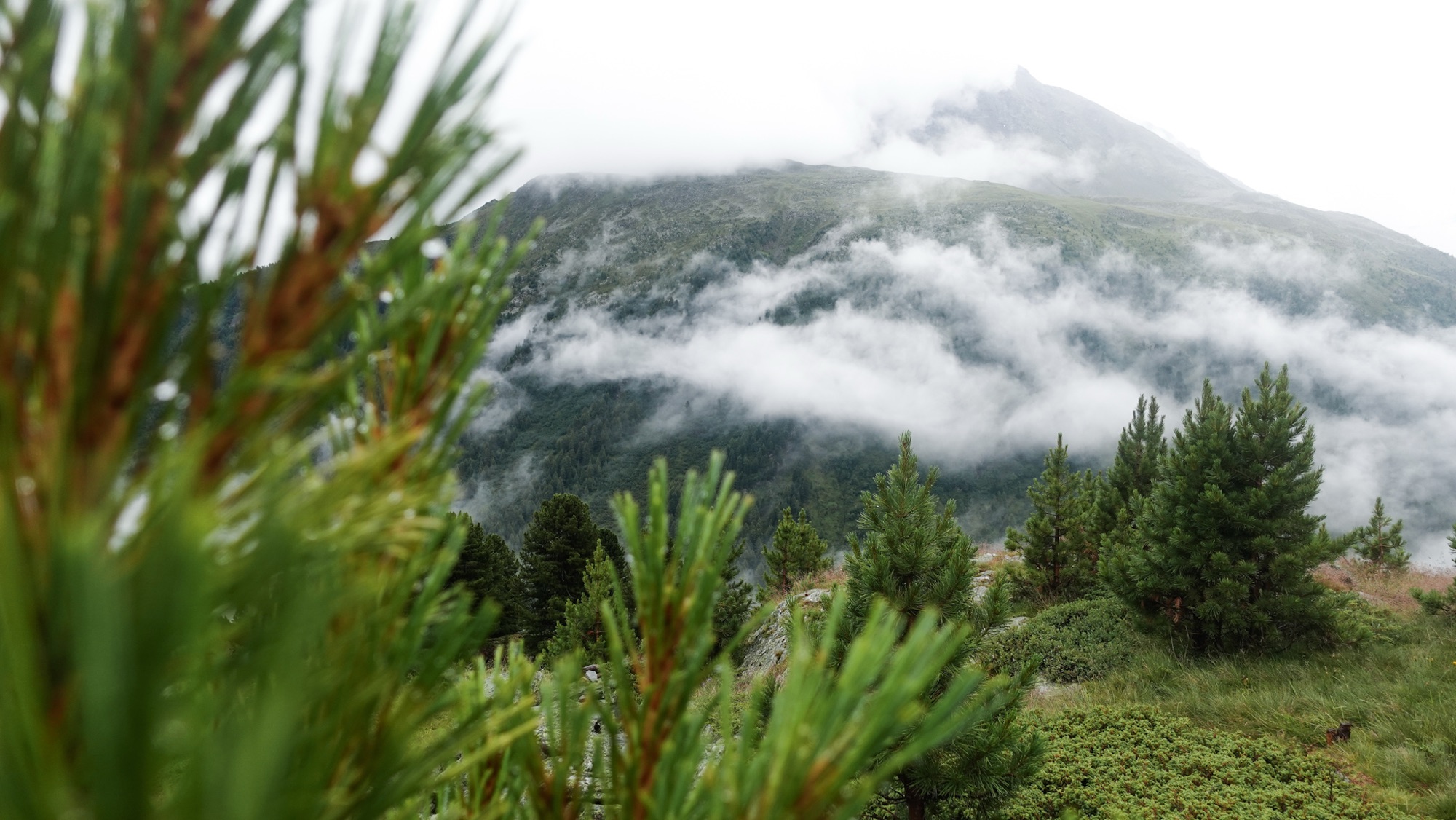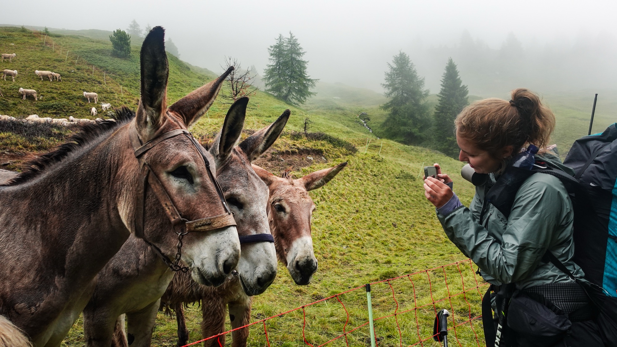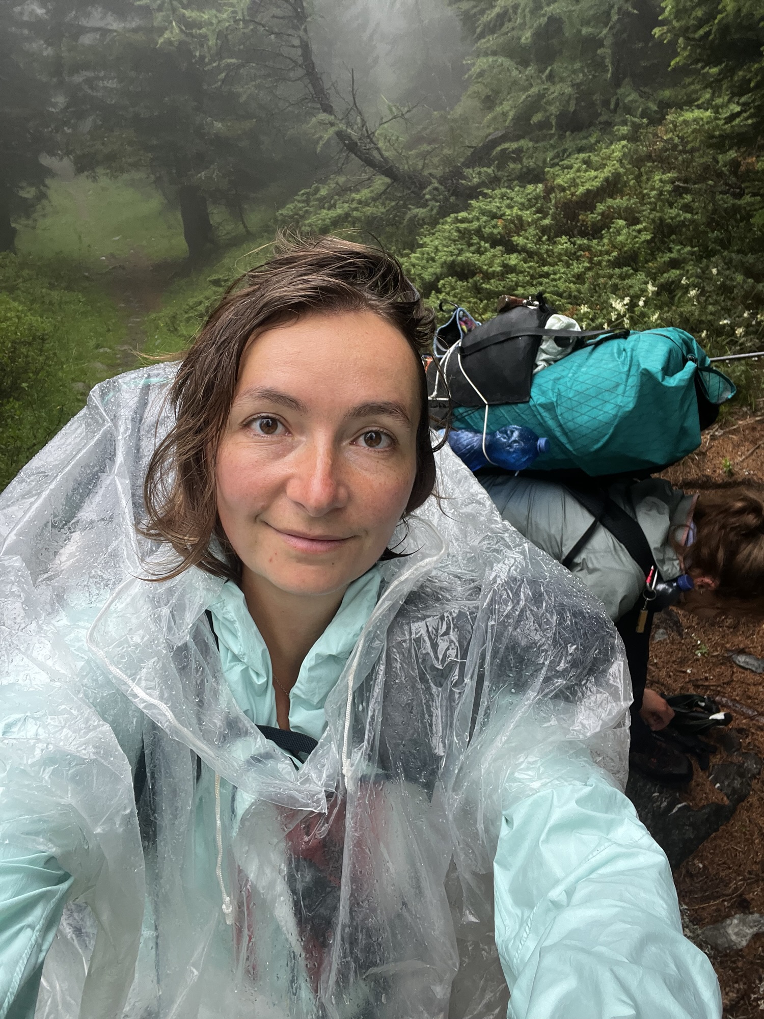 Tatsächlich werden wir heute diese Marke knacken und damit die Hälfte der Strecke bereits hinter uns lassen. Erst einmal müssen wir aber dem Regen entkommen, der ab Mittag vorausgesagt ist. Da mit vier Stunden Gehzeit nur eine kurze Etappe vor uns liegt, sollten wir im Trockenen ankommen. Doch als wir uns zum Frühstück auf die zwei Steine vor unseren Zelten niederlassen, beginnt es bereits zu nieseln. Hastig bauen wir alles ab, während der Regen immer stärker wird. „Der Wetterbericht ist ja sehr zuverlässig,“ stöhne ich. Noch bevor wir loslaufen, sind meine Haare so nass, als hätte ich geduscht. In voller Regenkleidung lässt sich aber bald schon nicht mehr unterscheiden, ob es Wasser oder Schweiß ist, was mir den Rücken hinunterläuft. Im Grunde ist es aber auch egal. Ist der Übergang von trocken zu nass erst einmal geschafft, gewöhnt man sich doch erstaunlich schnell an das schmatzende Geräusch in den Schuhen bei jedem Schritt, das feuchte Gefühl auf der Haut und die Tropfen im Gesicht.