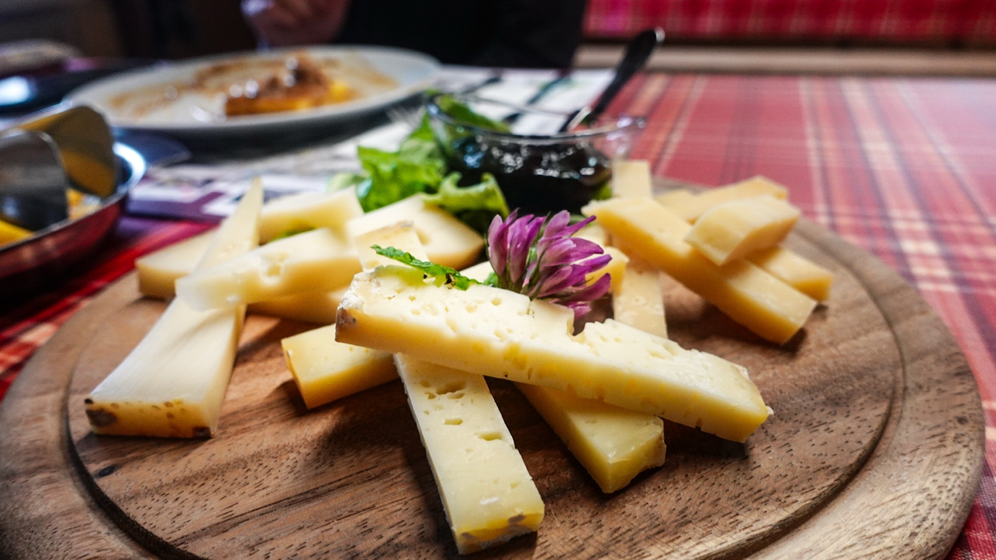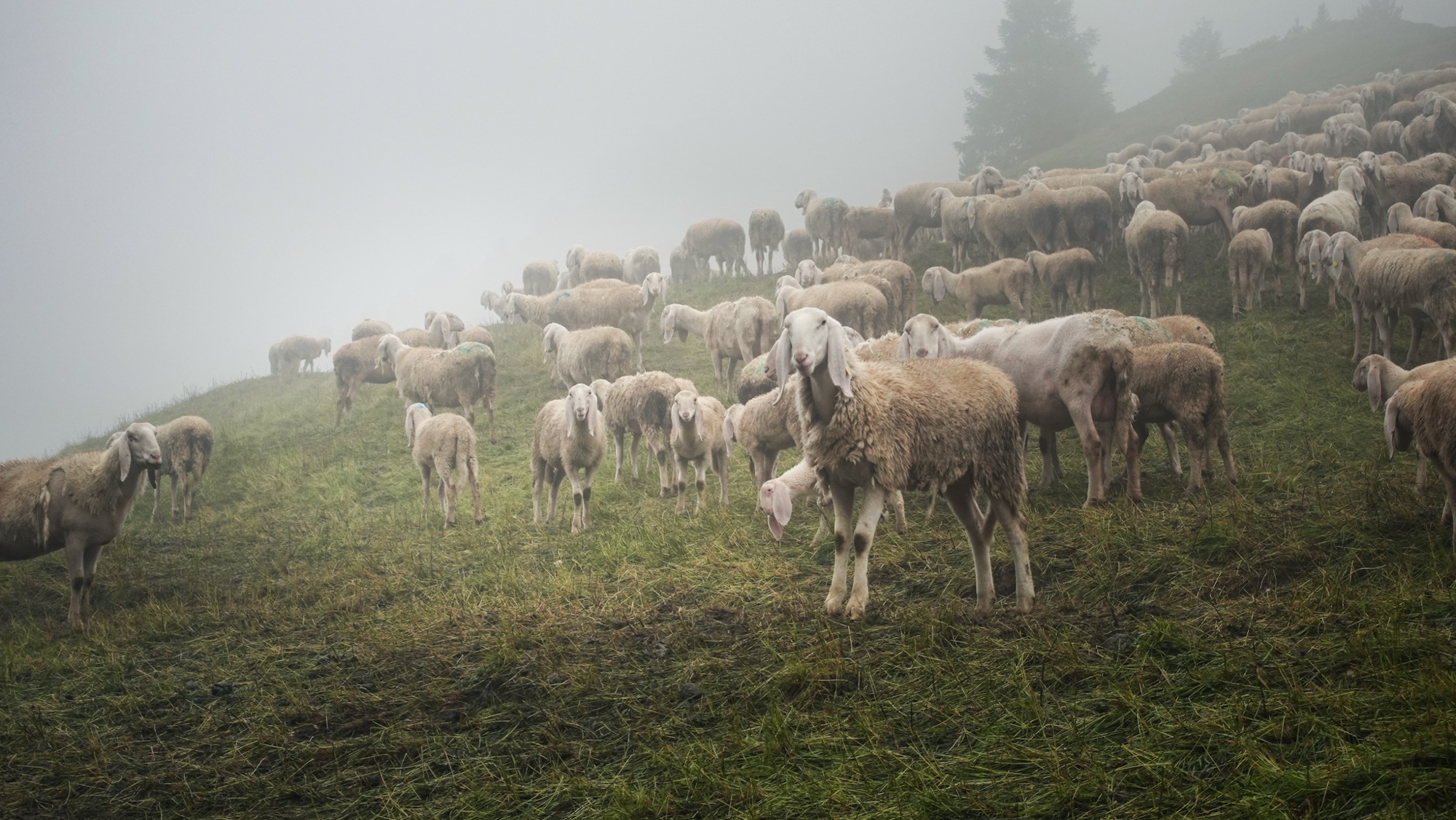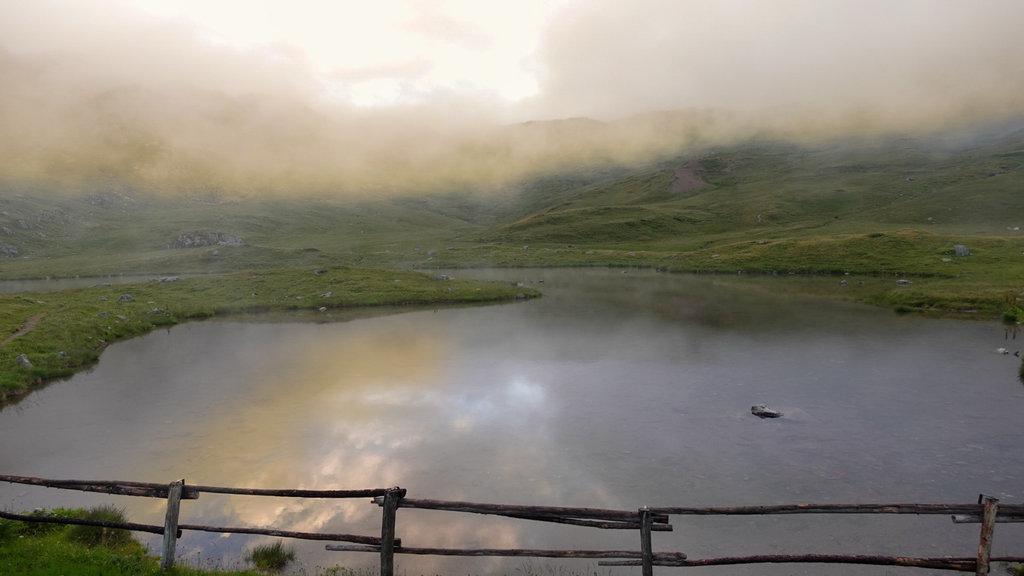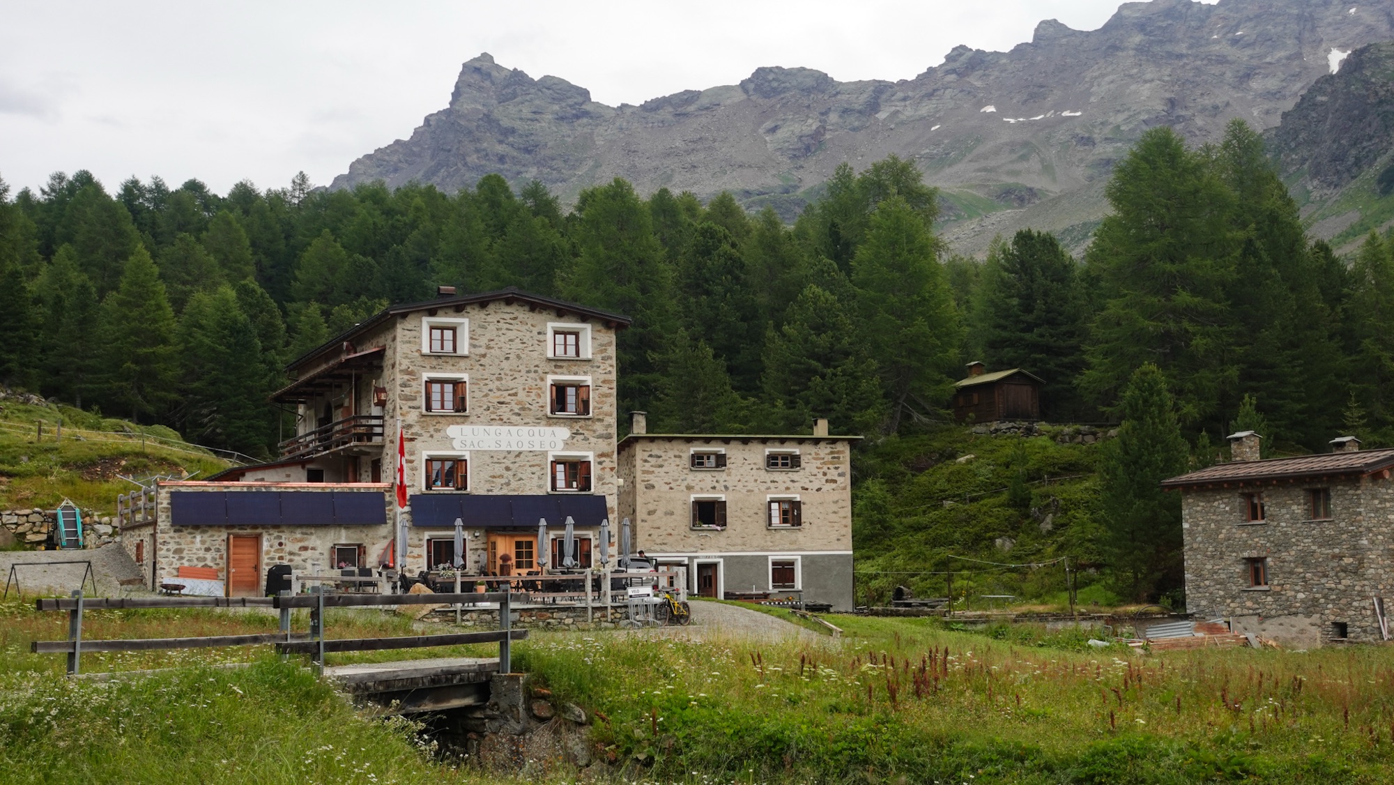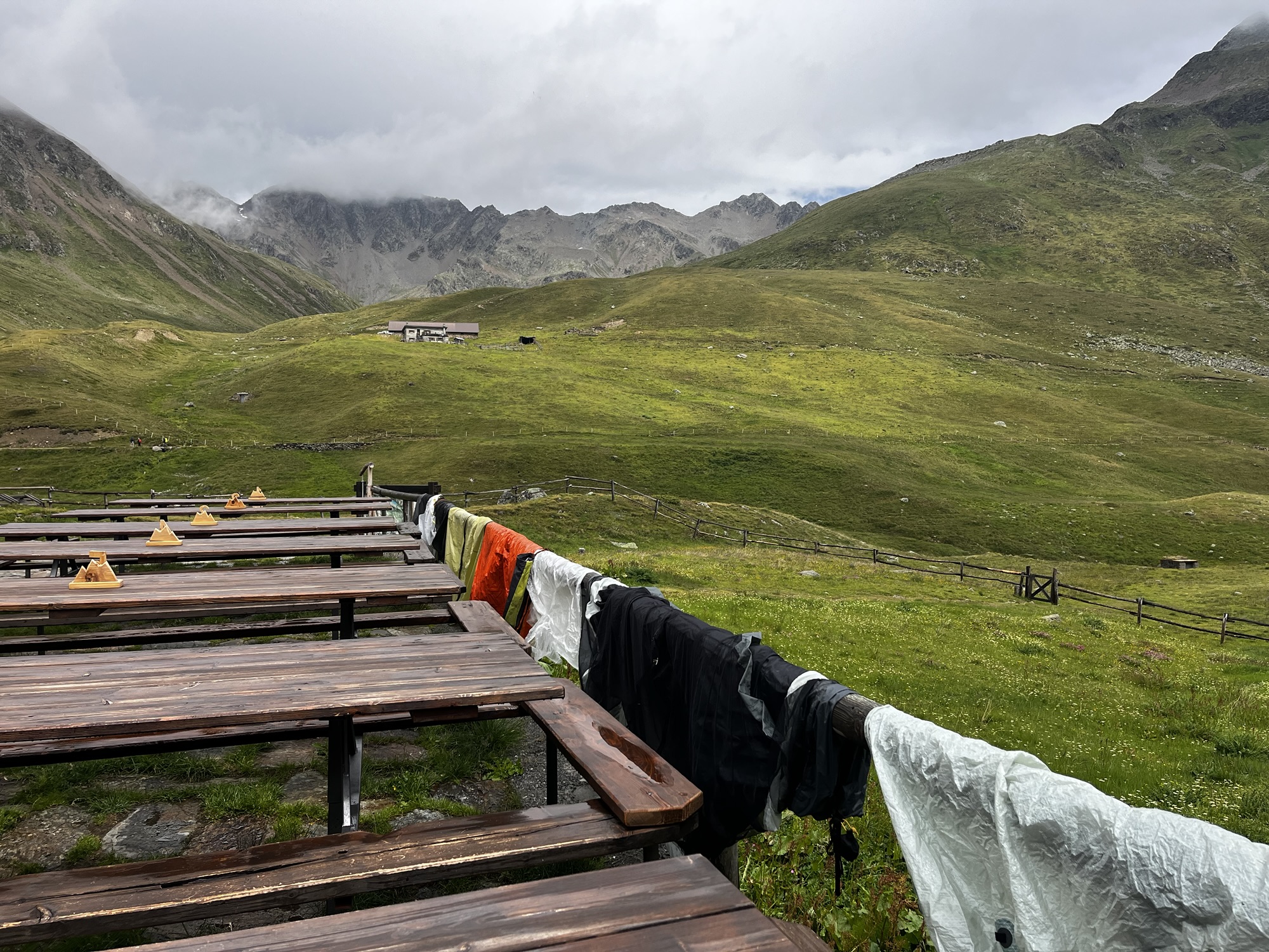 Dicht wabert die Wolkensuppe um uns herum. Stetig nieselt feiner Sprühregen auf uns nieder. Die Menstruation drückt nicht nur mein Energielevel, sondern auch meine Laune in den Keller. Als uns nahe einer Alm plötzlich laut kläffend ein Hund verfolgt, platzt mir die Hutschnur. „Silenzio!“ fauche ich ihn in scharfem Ton an. Meine wenigen Brocken Italienisch genügen, um Bello zum Schweigen zu bringen. Bedröppelt zieht er von Dannen. In einigen kurzen Regenpausen bekommen wir einen Eindruck davon, wie schön die Landschaft um uns herum ist. Wolkenfetzen umspielen den Monte Veva und Pizzo di Selva. Vorbei am Val Dosdè wandern wir hinein ins Val Viola und erreichen wenig später das gleichnamige Rifugio. Inmitten des Regengraus wirkt das knallorangene Rifugio Viola beinah wie seine eigene Sonne. Mit einem heißen Glühwein stoßen wir auf die 1.000 km-Marke an und wärmen uns auf. Aufgrund des schlechten Wetters haben alle anderen Übernachtungsgäste für heute abgesagt und so bekommt auch Celine hier spontan einen Platz im Lager. Während der peitschende Wind vor der Hütte unsere nassen Zelte trocknet, fallen wir drinnen in eine ausgedehnte Siesta. Wir verwöhnen uns mit Blaubeerkuchen und Kaffee. Zum Abendessen gibt es Spaghetti al ragù, Gulasch mit Polenta und eine Käseplatte. Inklusive sind außerdem ein Liter Rotwein und eine Flasche Wasser. Etwas angenascht, satt und zufrieden sinken wir in einen tiefen Schlaf.