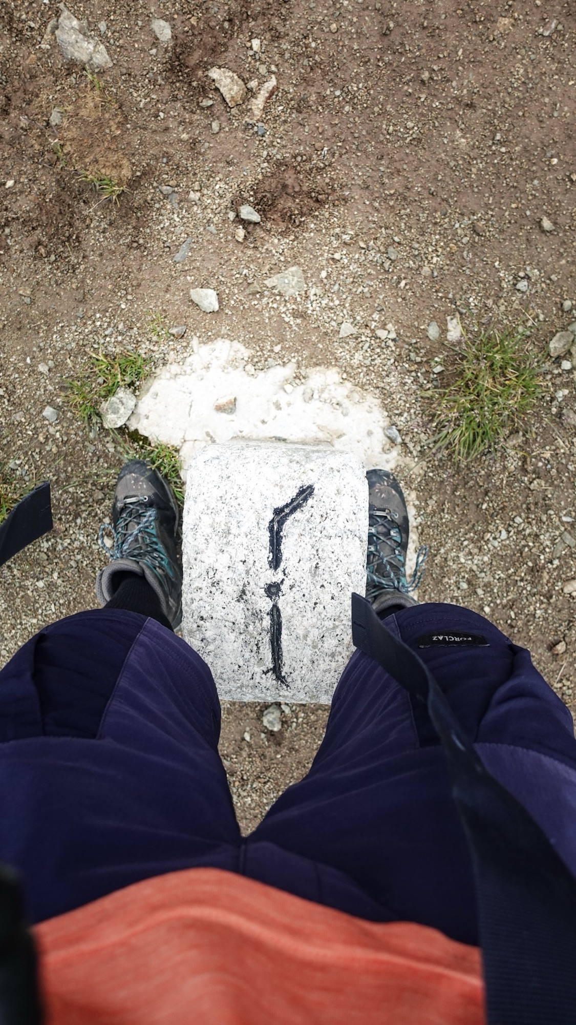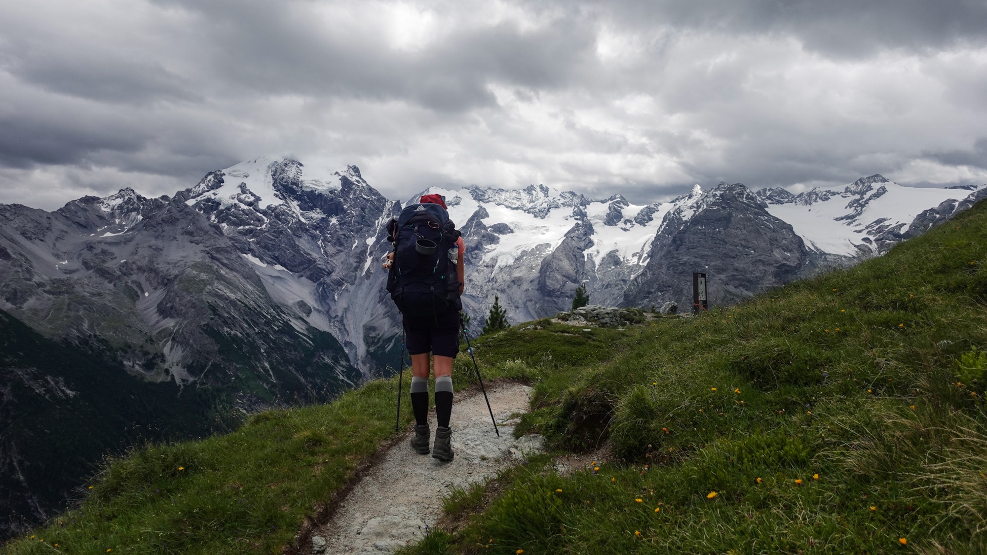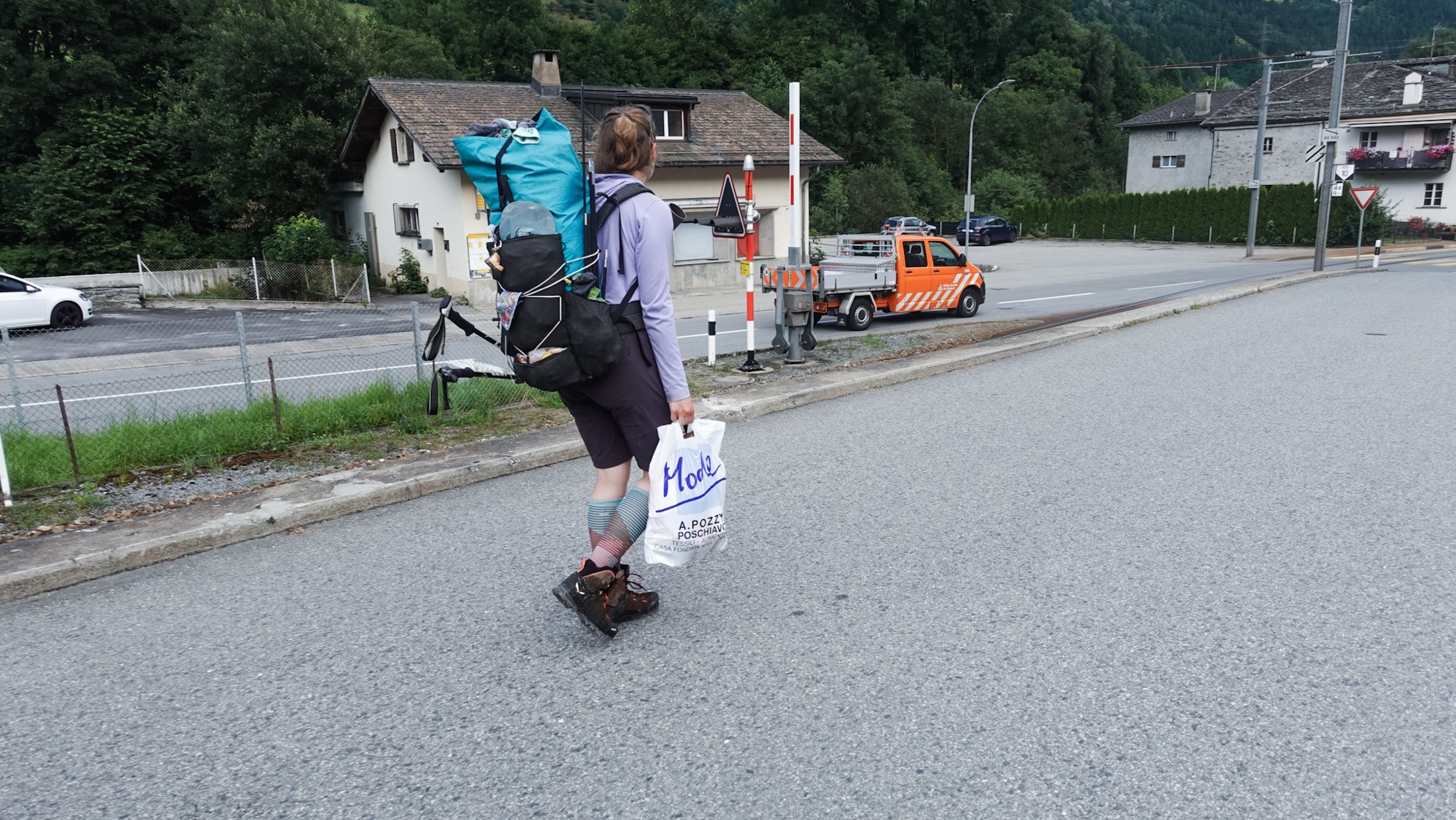 Mein 49. Gehtag wird mich das erste Mal richtig in die Schweiz führen. Ganz ohne Regen und Wolkennebel können wir heute Morgen die wilde und zugleich karge Landschaft des Val Viola erkennen. Karg ist auch eine treffende Umschreibung für das Frühstück, das uns erwartet. Zwieback, zuckersüßes Knuspermüsli und Kekse. Jetzt sind wir in Italien. Mit spärlich gefülltem Kaloriendepot starten wir wenig später unseren Aufstieg hinter der Hütte. Bald schon glitzern die Seen des Val Viola hinter uns in der Sonne und wir klemmen uns den Grenzstein für ein Foto zwischen die Füße. In der Ferne können wir schon die verschneiten Berge der Bernina erspähen. Beim Abstieg durchqueren wir einige Almen. So klein diese im ersten Moment auch scheinen, gibt es hier dennoch Bushaltestellen. Gleich mehrmals fahren Linienbusse an uns vorüber. Als wir die Hauptstraße erreichen, beginnt es erneut zu regnen und mich erreicht eine SMS mit den Mobilfunkpreisen der Schweiz. Ich muss sie zwei Mal lesen, um zu realisieren, dass hier 23 Cent/MB fällig werden. Sofort schalte ich die mobilen Daten aus. Im Vorfeld der Tour habe ich mich um vieles gekümmert, nicht aber um die völlig gottlosen Roaming-Gebühren der Schweiz.