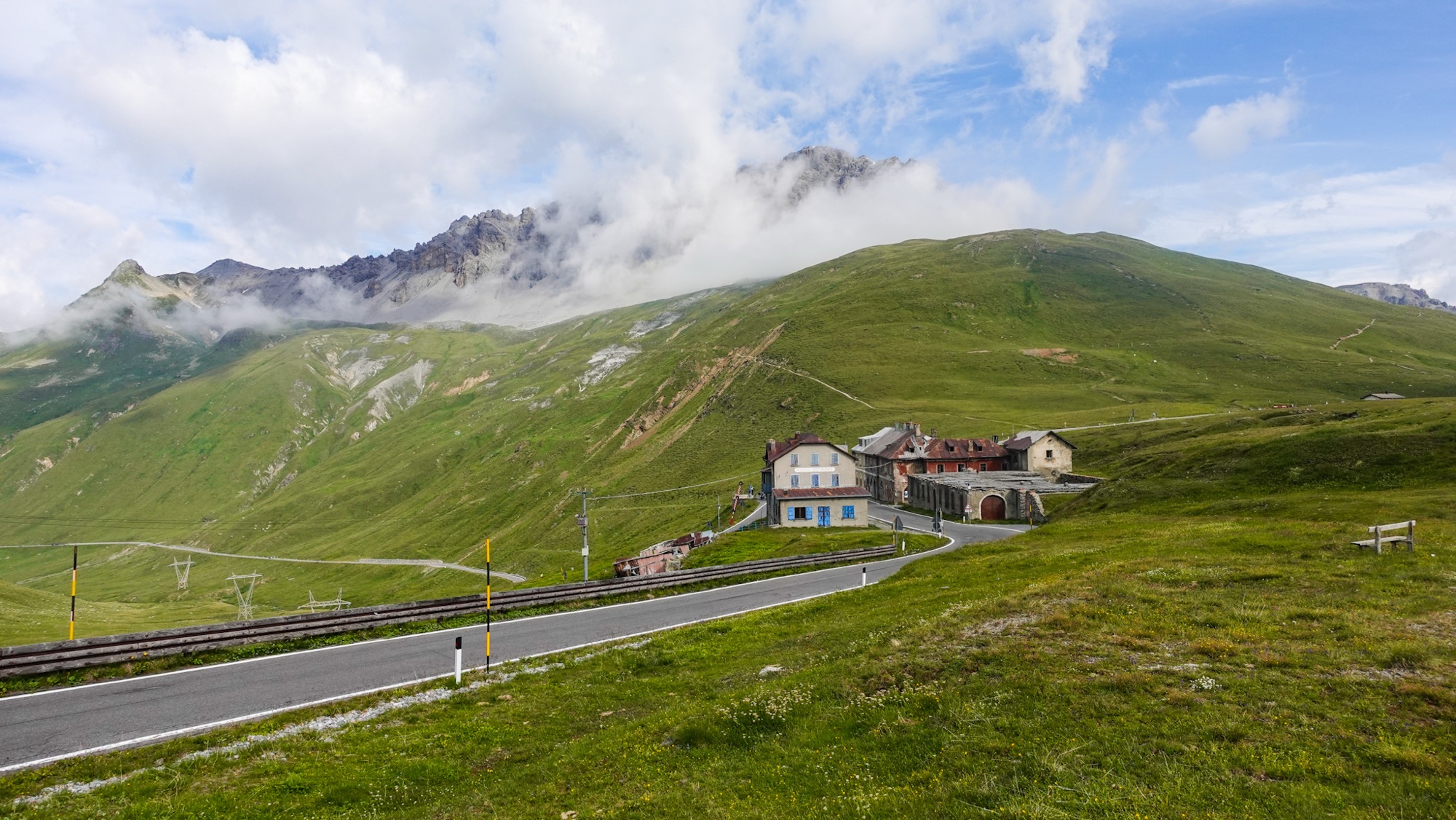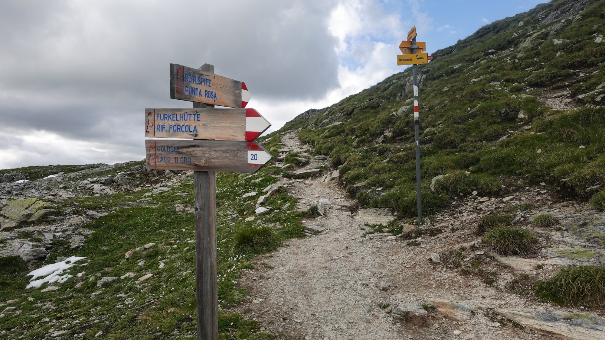 Erste gelbe Wegweiser erinnern uns daran, dass wir bald schon das dritte Land unserer Reise erreichen – die Schweiz. An der Dreisprachenspitze oder Piz da las Trias Linguas trafen einst nicht nur drei Sprachen, sondern auch drei Länder aufeinander. Bevor Südtirol an Italien abgetreten wurde, befand sich hier das Dreiländereck Italien, Schweiz und Österreich-Ungarn. Neben Deutsch und Italienisch tritt hier das Rätoromanisch als dritte Sprache hinzu. Im Ersten Weltkrieg war diese Gebirgsregion schwer umkämpft, war es doch aus Sicht der Italiener ein potenzielles Einfallstor ins lombardische Hinterland. Bis heute zeugen verfallene Bunkerstellungen nahe der Dreisprachenspitze von dieser Zeit. In spitzem Winkel ragt die Schweizer Grenze an den Gipfel heran, sodass es damals mitunter im wahrsten Sinne des Wortes geschah, dass über die Köpfe der neutralen Eidgenossen hinweggeschossen wurde.