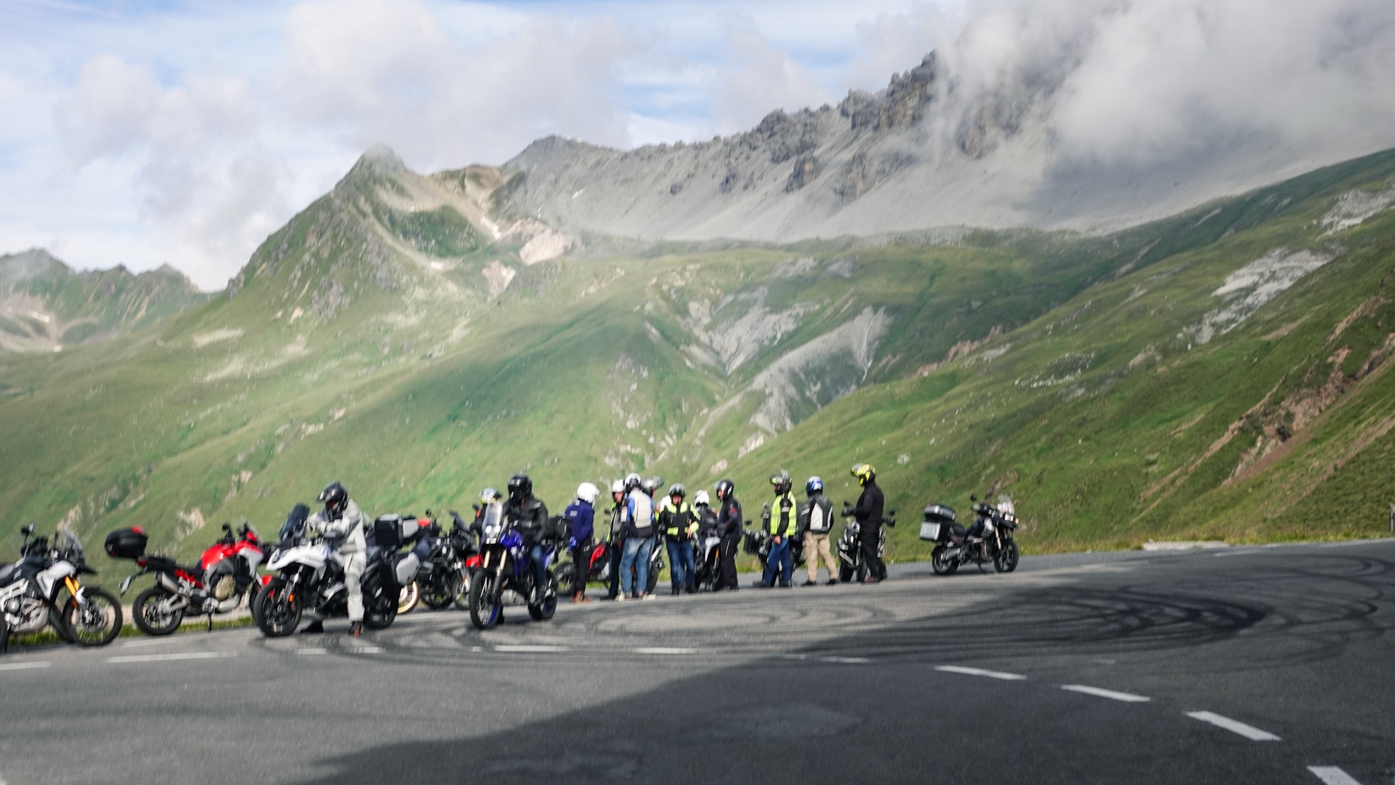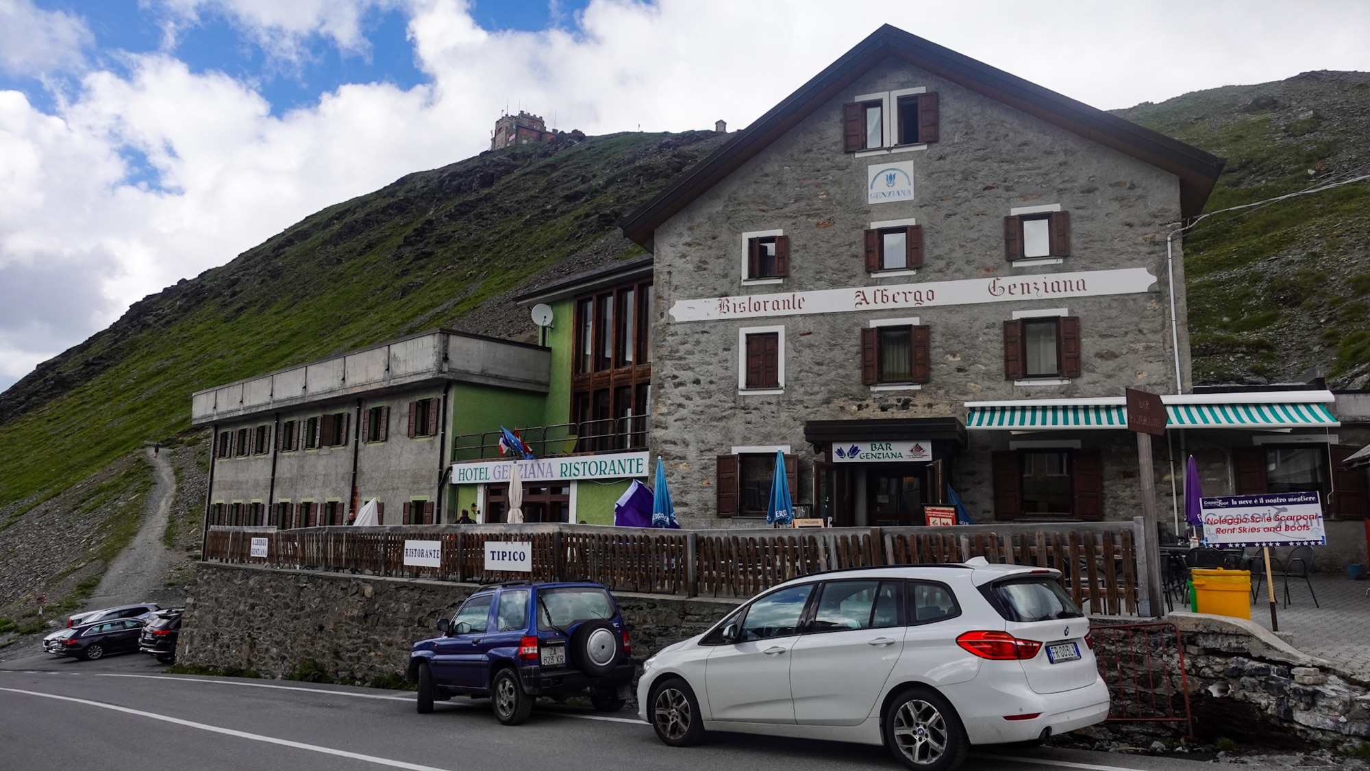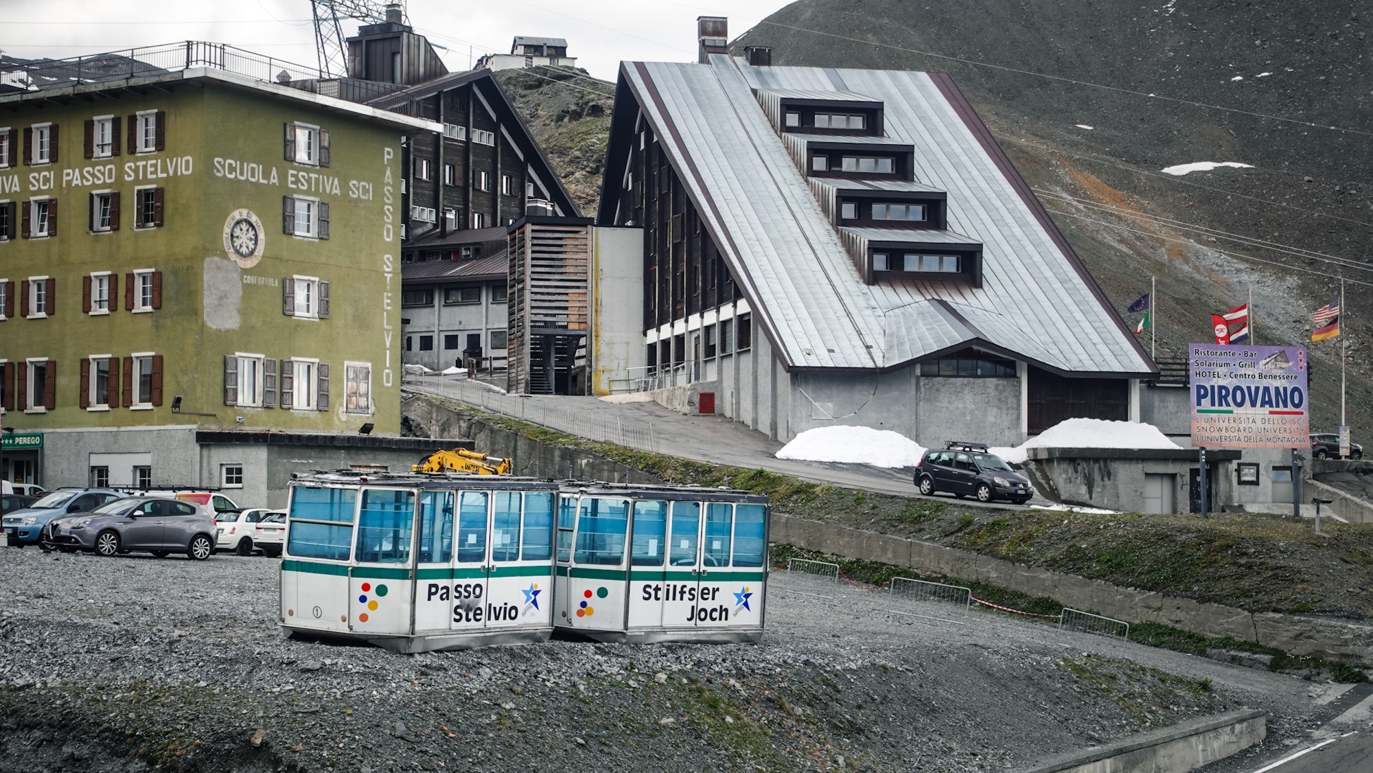 Zu gern hätten wir in der kleinen Burg auf dem Gipfel übernachtet – dem Rifugio Garibaldi. Doch seit 2024 ist die Hütte zu, bleiben die roten Türen und Fenster geschlossen. So bleibt uns nach einem kurzen Fotostopp nur der Abstieg zum Stilfser Joch oder Passo dello Stelvio. Schon seit Stunden hören wir die nahende Passtraße. In engen Schlingen winden sich Motorrad-Poser, Porsche-Liebhaber, Frischlufenthusiasten in Cabrios und auf Rennrädern den Berg hinauf. Der Blick auf den so berühmten Pass wirkt wenig einladend. Grau in grau und etwas verfallen liegen die Hotels unter uns. Zwei Mal bin ich schon hier gewesen: 2001 und 2010. Ich erinnere mich an meterhohe Schneeberge entlang der Passstraße im Juli. 2025 hat sich der Schnee in die tiefen Schneisen der angrenzenden Berge zurückgezogen. Völlig unverändert sind hingegen die Fassaden der Häuser, als sei die Zeit irgendwann Ende der 90er Jahre stehen geblieben.