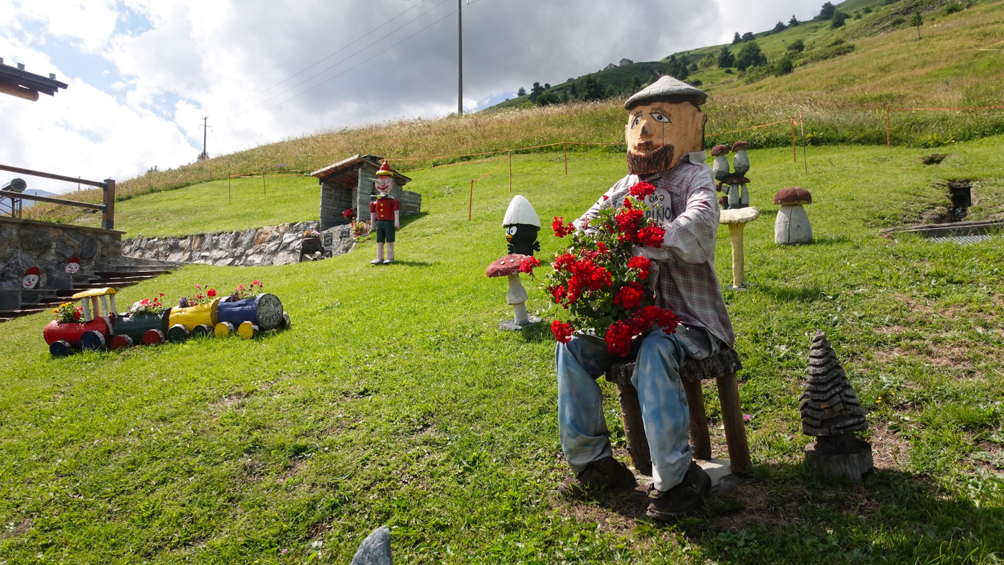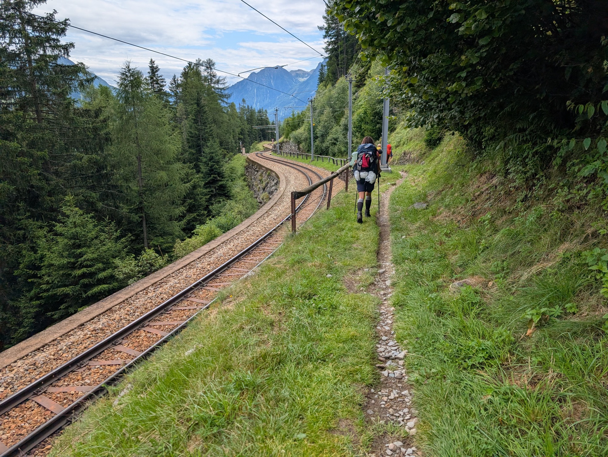 Als der Regen nachlässt und die Sonne erneut hinter den Wolken hervorschaut, legen wir eine Kaffeepause ein und schlendern schließlich zusammen mit dem Bernina-Express ins Tal. Dieser kleine rote Zug fasziniert mich. In engen Schlingen winden sich die Gleise den Berg hinab. Zwischen Chur oder St. Moritz und Tirano überwindet der Bernina-Express 1.800 Meter Höhenunterschied, fährt über Viadukte, Kehrtunnel und direkt an Gletschern vorüber. Das Zusammenspiel aus Technik und Hochgebirgslandschaft machte die Strecke 2008 zum UNESCO-Welterbe.