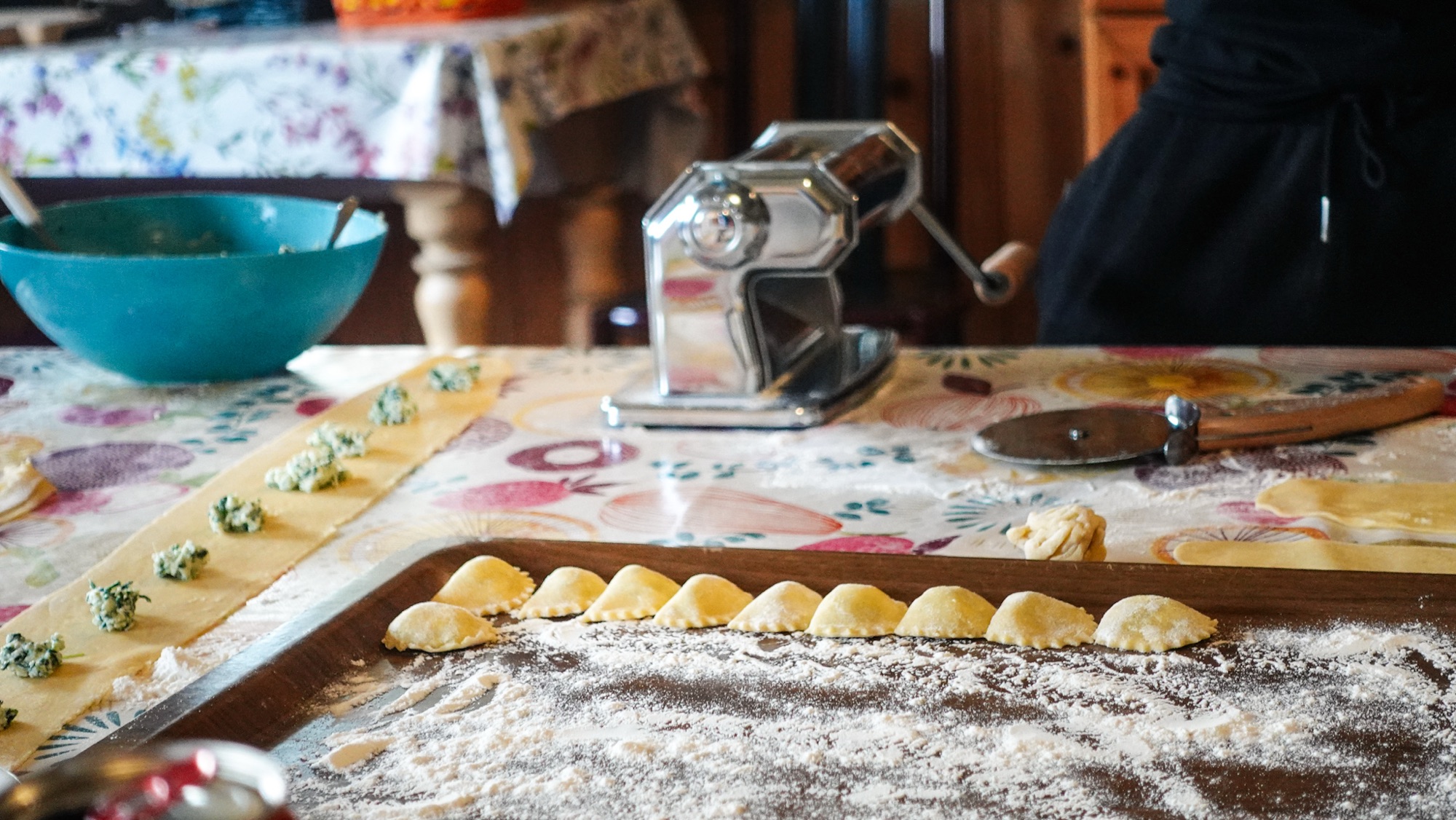 „Do you want to cook ravioli with us?“ fragt Nicolas schließlich. Voller Vorfreude weiten sich meine Augen. Noch nie habe ich Ravioli selbst gemacht. „Yes of course,“ antworte ich und finde mich bald darauf in einer Arbeitslinie zwischen den beiden wieder. Alessio walzt den Teig. Ich fülle die Quadrate mit Spinatricotta und drücke sie vorsichtig zusammen, bevor Nicolas die kleinen Taschen mit dem Teigrädchen ausschneidet.